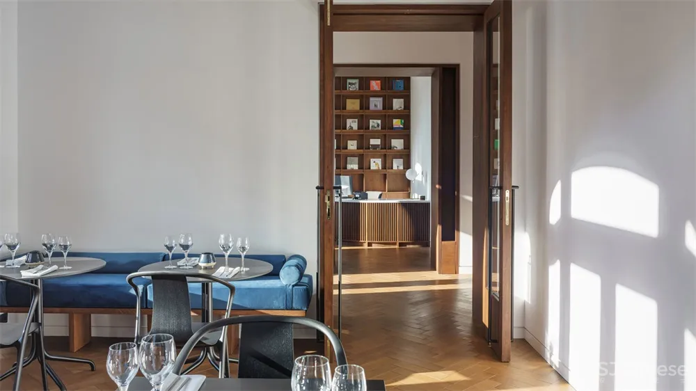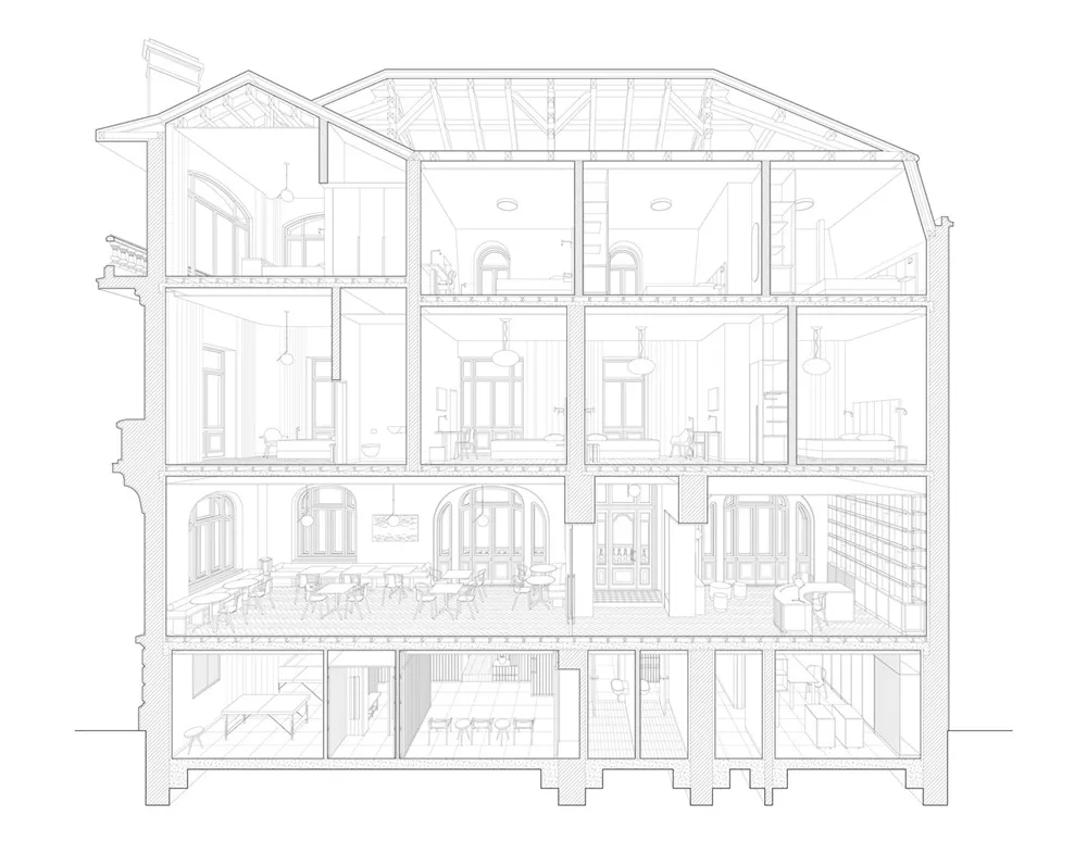 场地虽小但很复杂,设计师希望将酒店向周围的街道开放,通过改变楼层布局来改善入口和交通。主入口通向庭院,庭院通向建筑中心一个私密的、充满阳光的接待区。次要入口引导着公众穿过精心修复的走廊,一直通向Popeea咖啡馆,这是一家手工咖啡店和小餐馆。