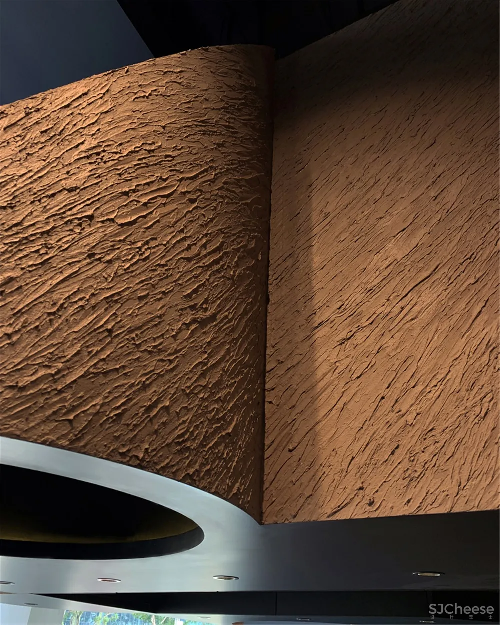 整个体量完全装在天花板上,没有支撑连接底部的柜台顶部,给整个空间结构带来一种超现实的轻盈感。悬挑的体量也呈现在纹理浓重的灰泥中,灰泥里有来自磨砂的咖啡渣,创造了反重力的咖啡云。从减法和加法中产生的美学,创造了一个有着自己模糊逻辑的流动体块,当然不是基于任何预先设计的形式或咖啡馆的象征。