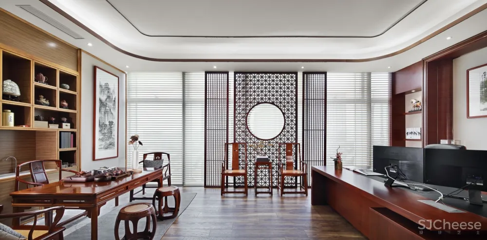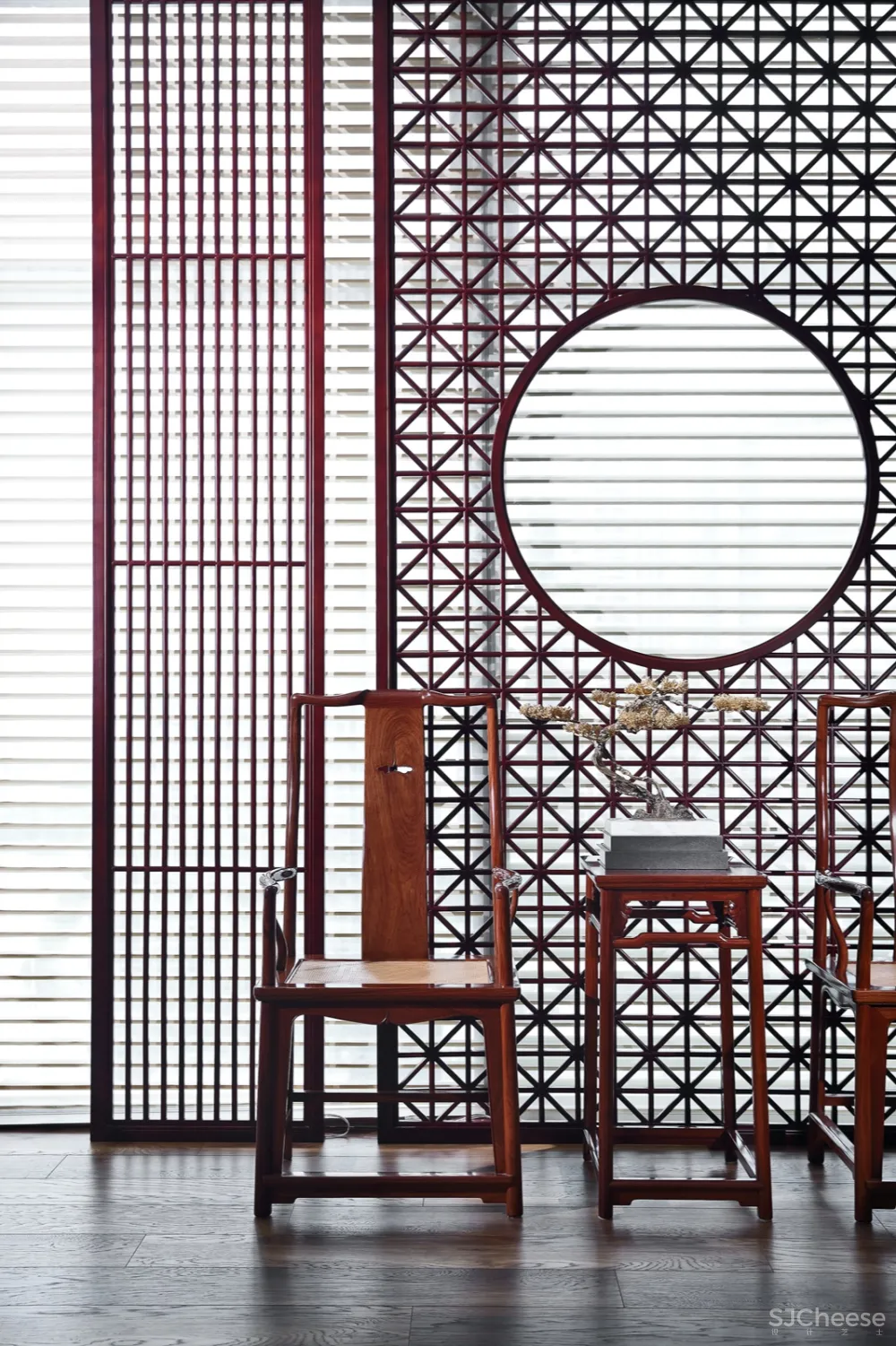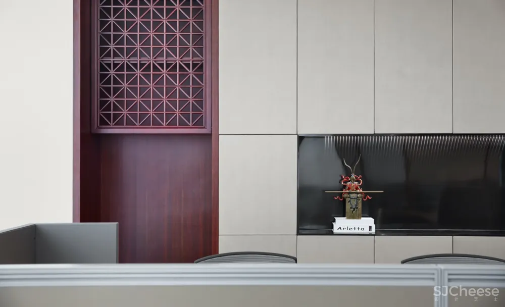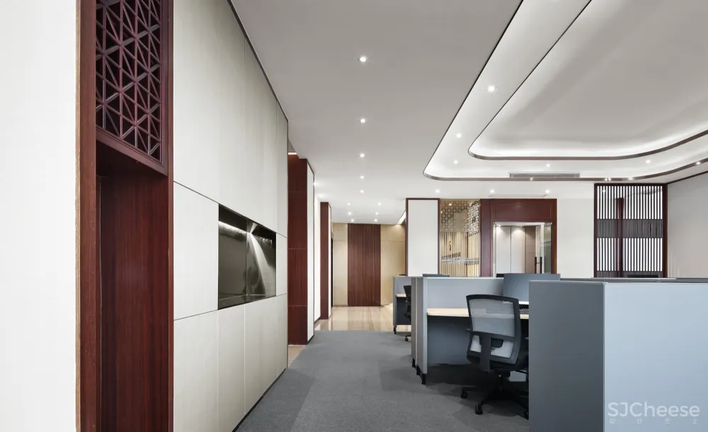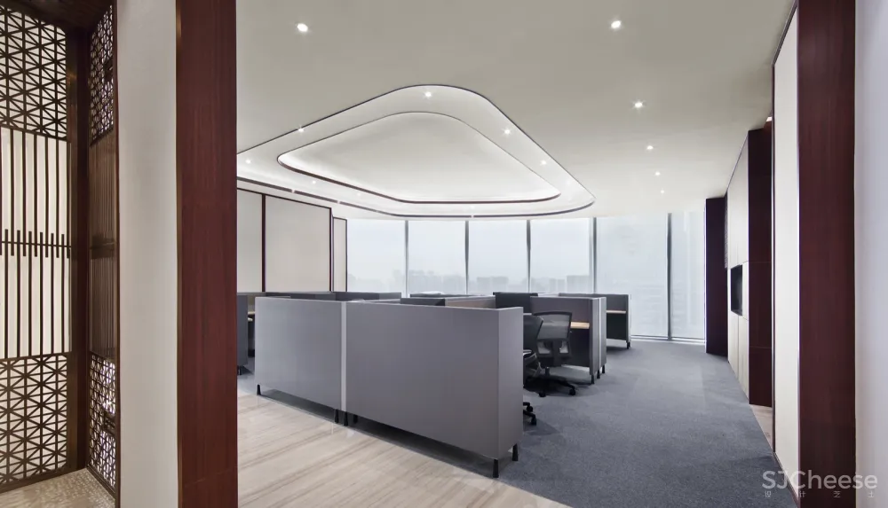 整个空间中均以“大线条”立向区域化做分割,空间层次清晰,在办公区中心天花采用圆弧叠加设计增加空间气质,似“方”中有“圆”以立根本,从入门前厅开始一木一石运用在不同空间中,木的柔质、石的刚性加上金属元素结合具有恢宏且不失现代视觉感。