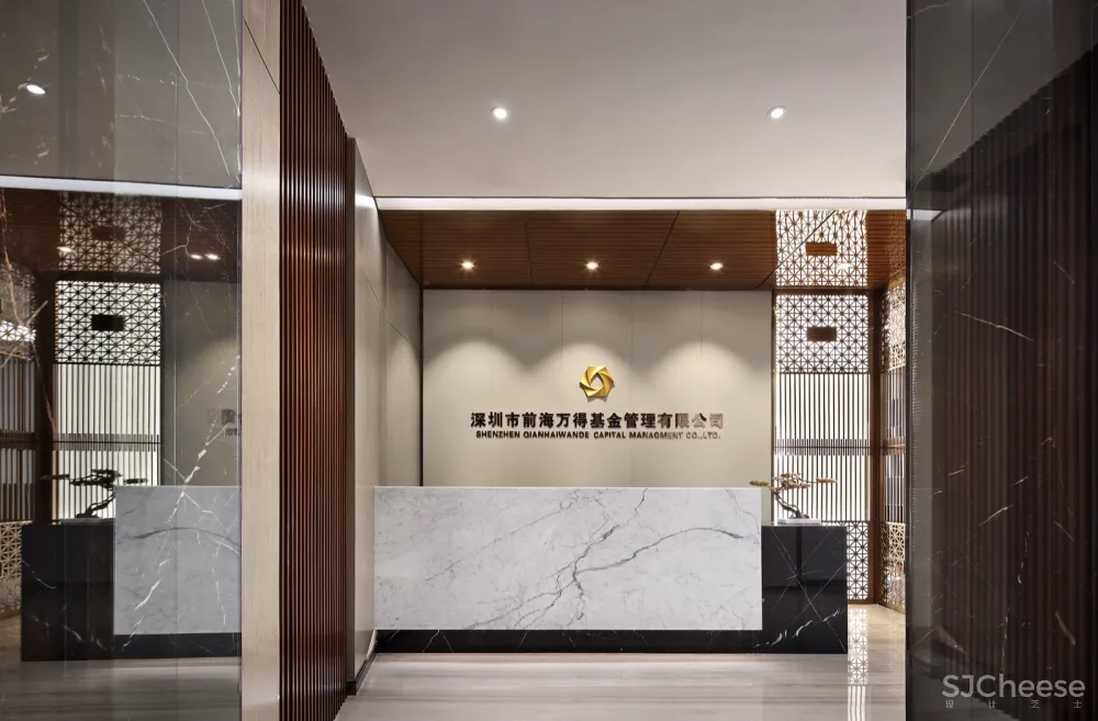 此项目位于深圳前海卓越时代广场,项目性质属于金融类公司,办公室内采用了稳重的木色与奢华的金属、石材等材质搭配,此空间设计以功能为导向,以使命为设计精神依托。
