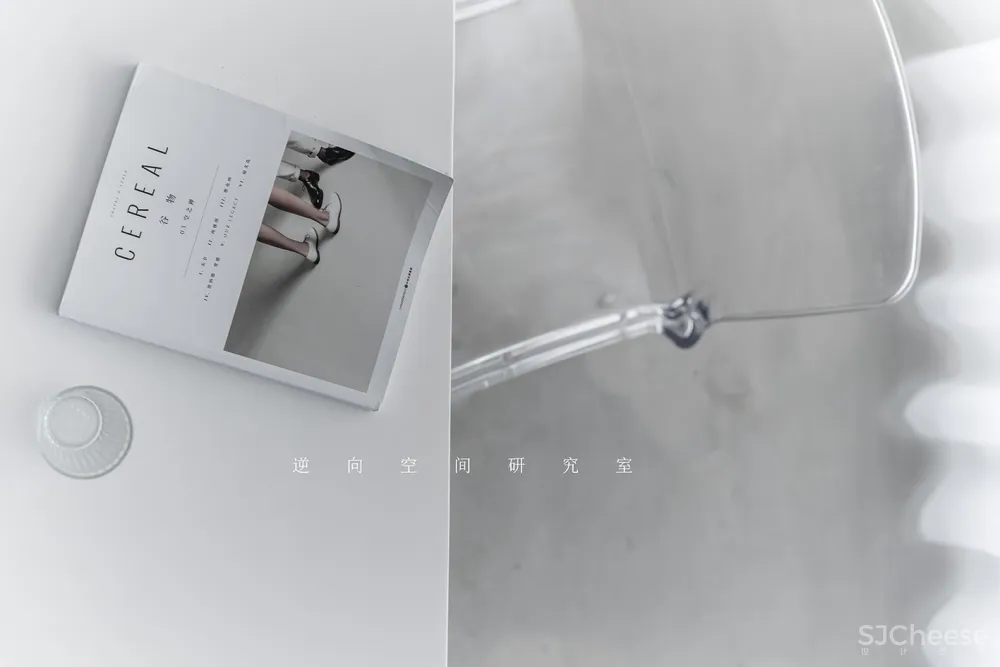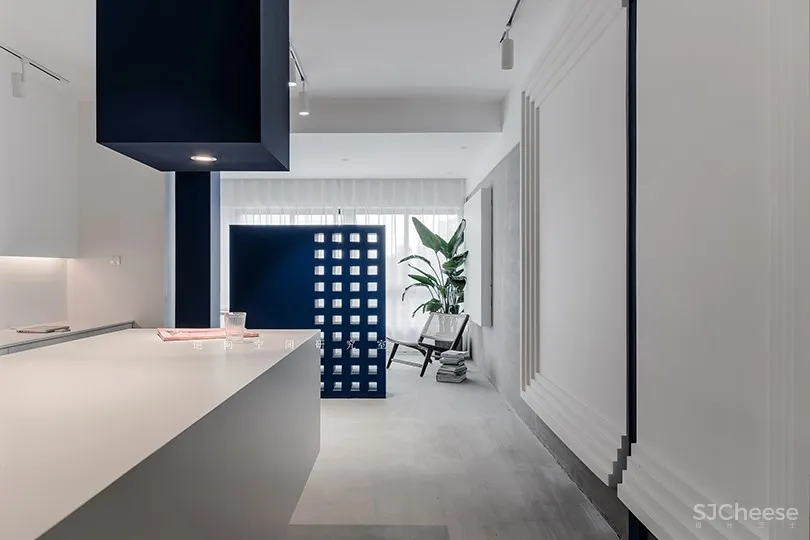 入户,一室极静的白,至纯的蓝色几何形体,几缕光线,在空间中自由的游走身影徘徊于明亮与阴影之中,不自觉的被顶面一道道摇曳的光所吸。