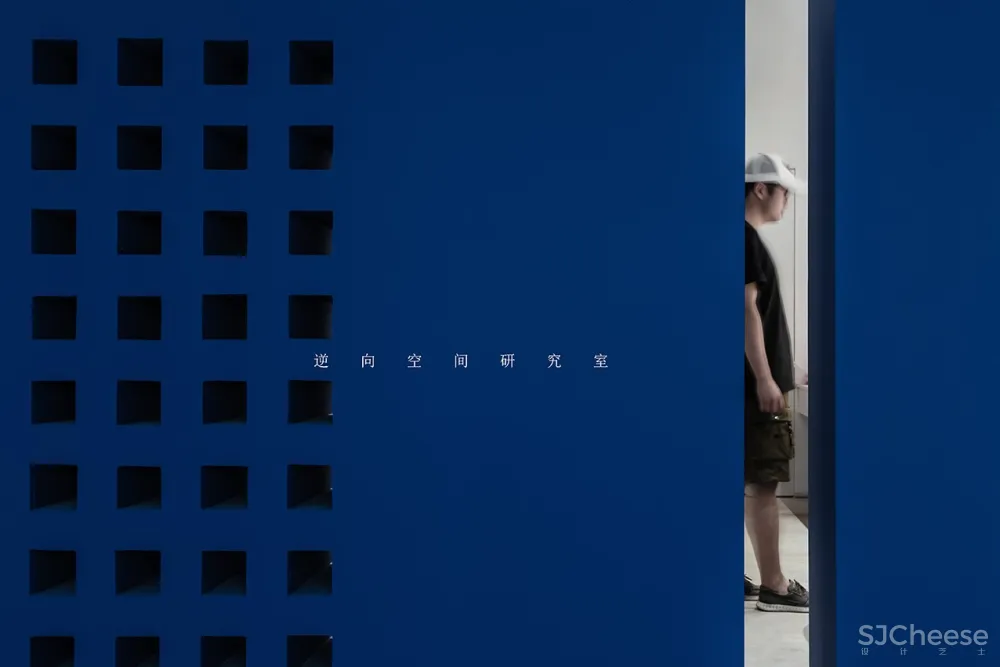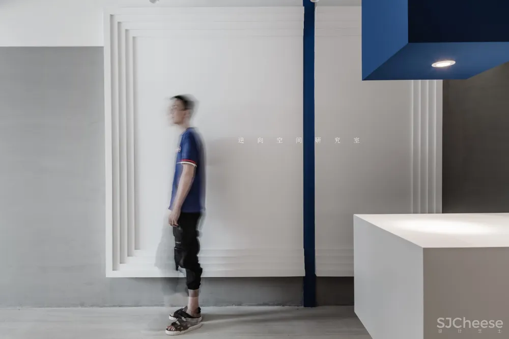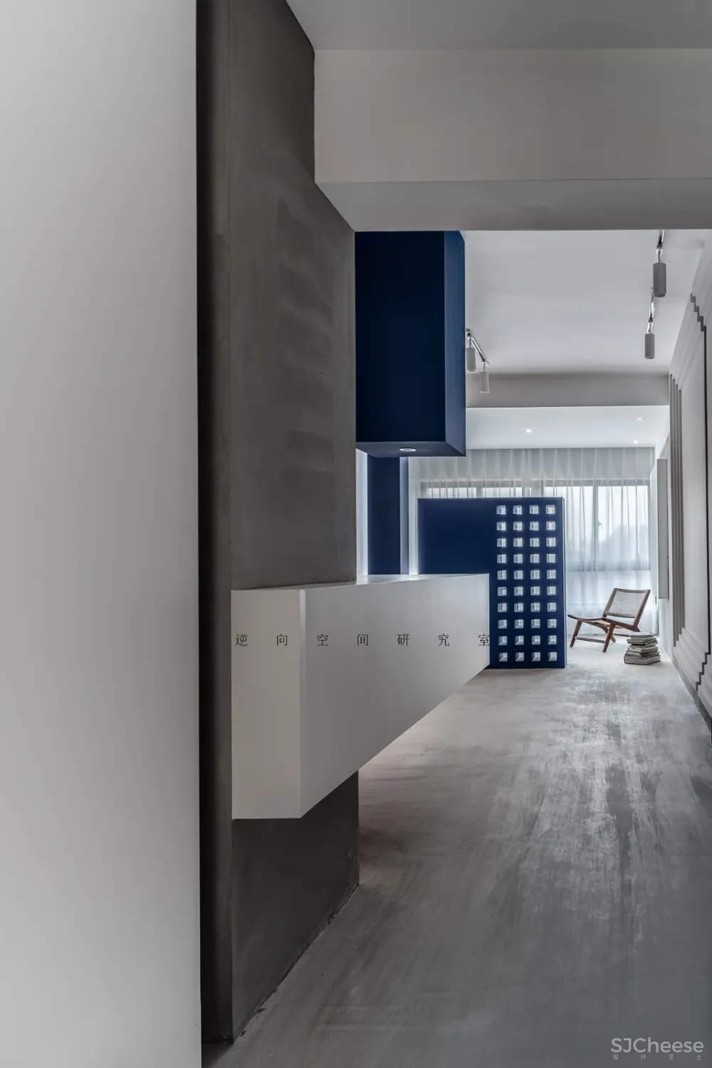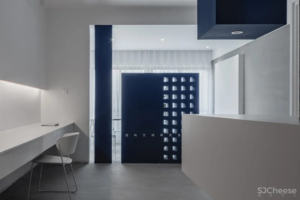 工作之余,转头,灰白蓝的色彩让人身心得以放松。办公区在蓝色几何镂空墙体的半遮半掩中映入眼帘,不自觉便踱步深入,在半实半虚掩映之中找寻自己想要的结果。