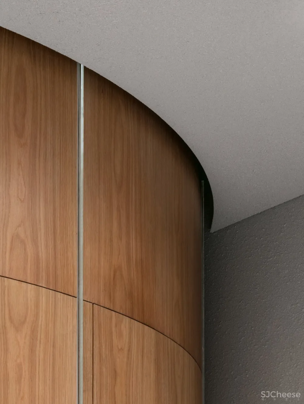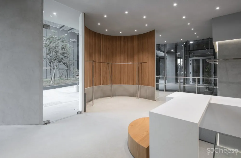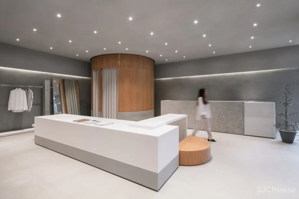 这个空间更加生动,用粗糙的石材,透明玻璃和实心白橡木制成的圆柱作为装饰。外墙的形状是圆的和笔直的,从而具有抽象和动态的感觉。从天花板到墙壁的纹理的纹理表现与从地板到墙壁的混凝土硬化剂的纹理完成彼此相连,并采用拥抱的形式。这将注意力集中在人身上,并给空间带来温暖和温暖的感觉。在每个序列中,诸如圆,立方体,线和面之类的元素在墙壁,圆柱,衣架,家具和架子上相互重叠,从而增加了空间的趣味性和节奏感。