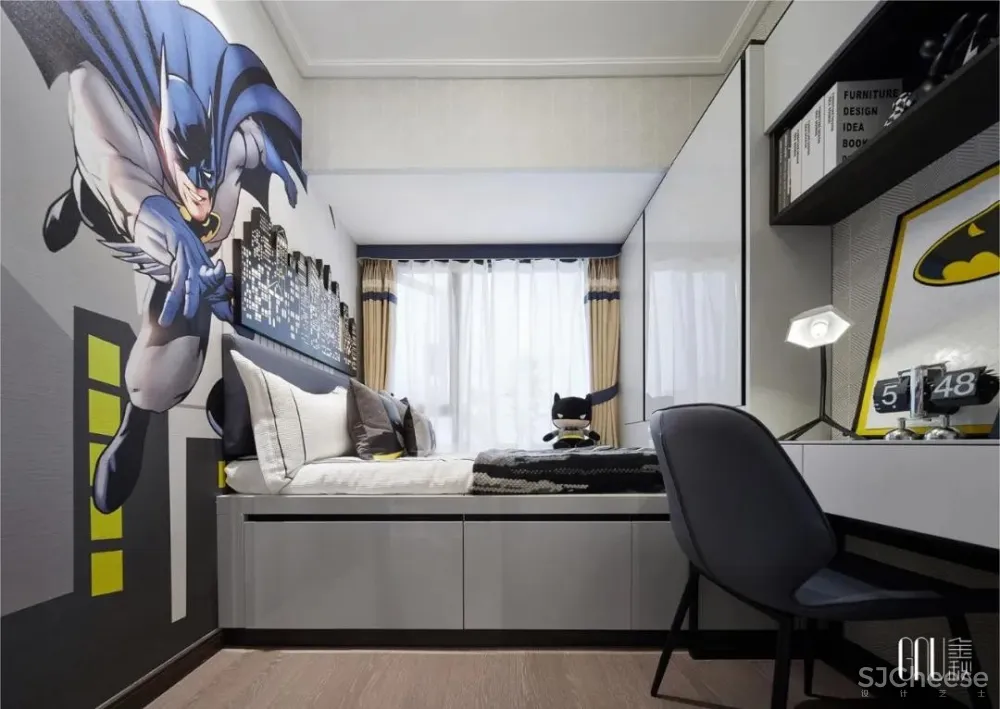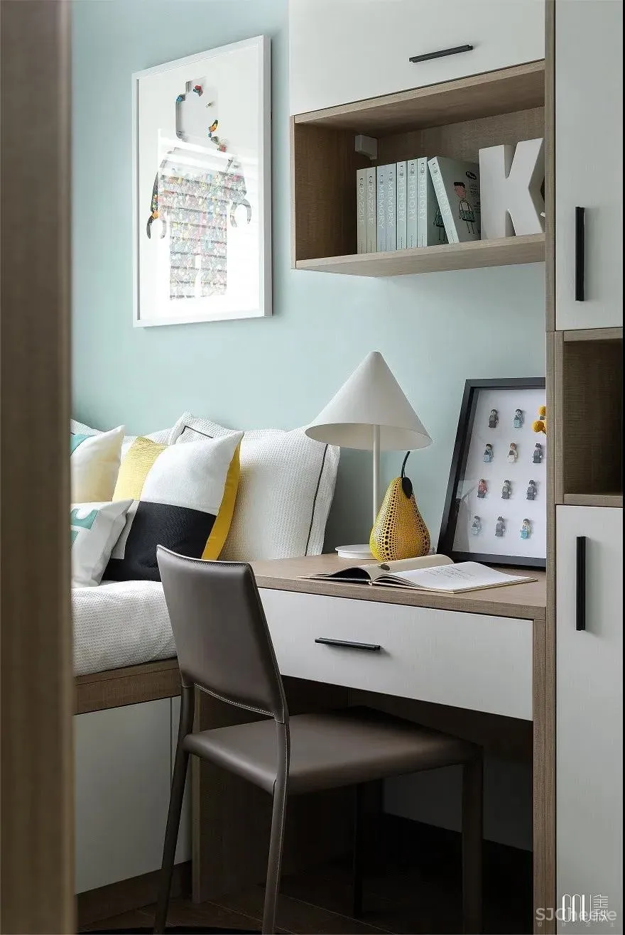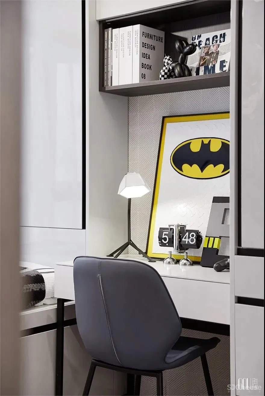 从墙面挂画到桌上饰品,象征着智慧的乐高带着儿童在房间里四处探寻。素净的主题色在黄色的明亮中张扬独特个性,突出鲜明时尚感。在色彩对比中,张扬创新个性,渲染炫酷时尚的空间氛围。