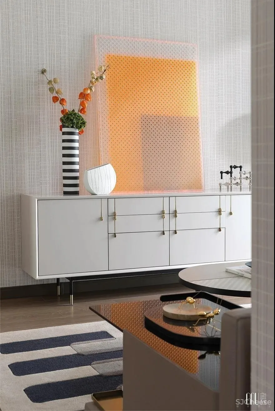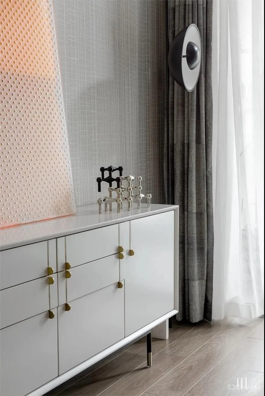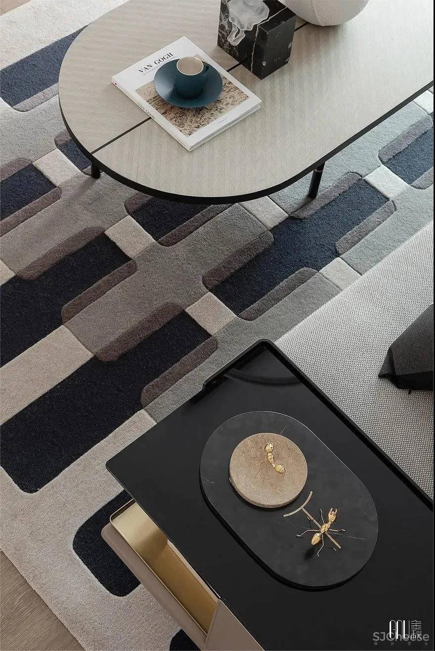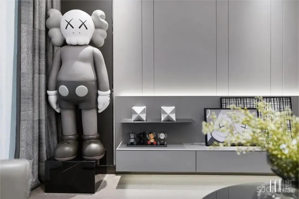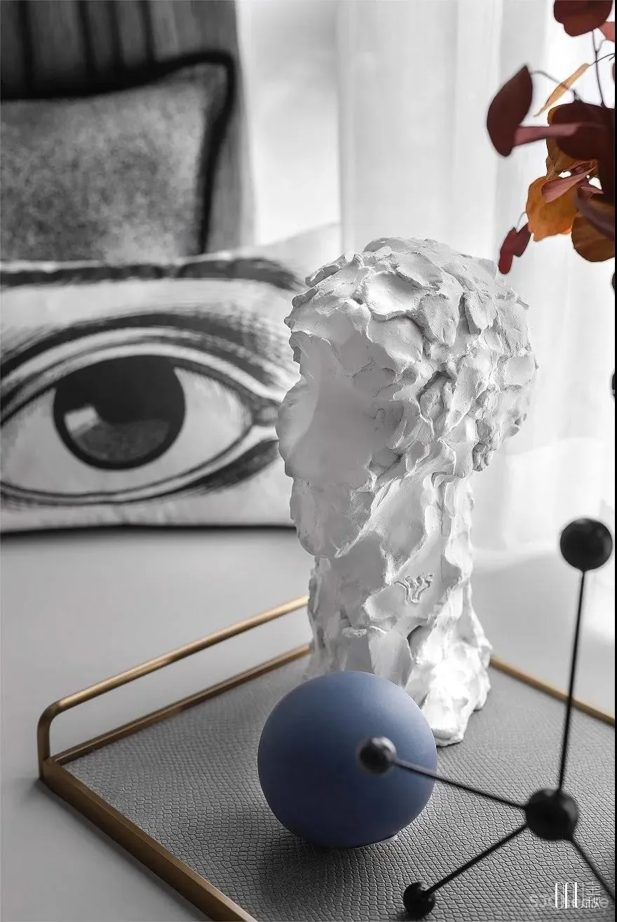 人偶藏着的玩心,在黑、白、灰三色碰撞的地毯上跳动。看似暗沉、实则多元的色调铺满整个空间,彰显独树一帜的几何交错。个性不是特立独行,而是始终如一地坚持。如同客厅的工艺摆设一般,轻奢的质感是追求品质的不变执着。