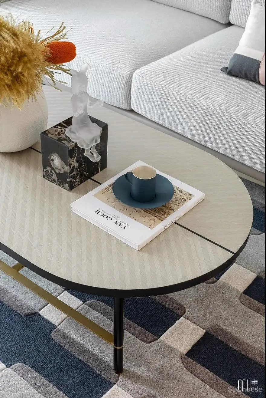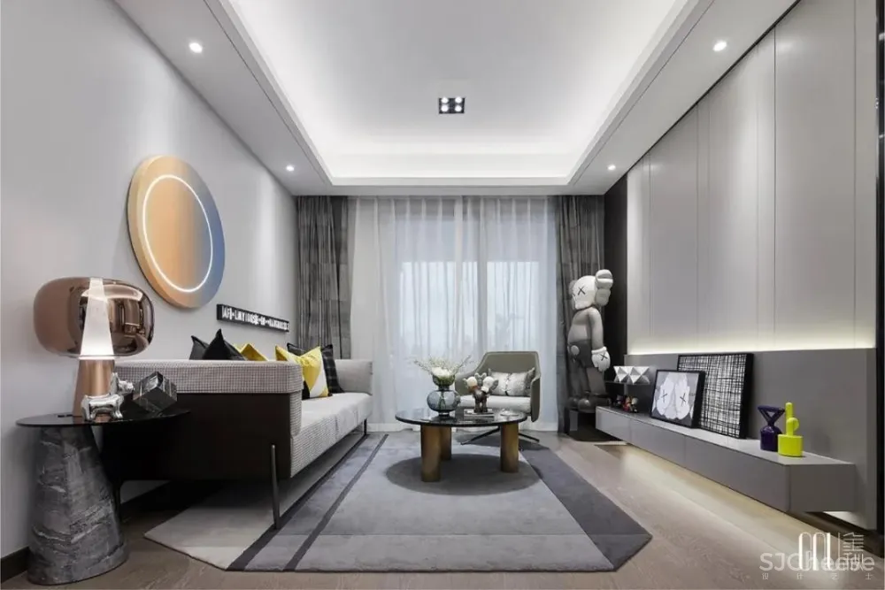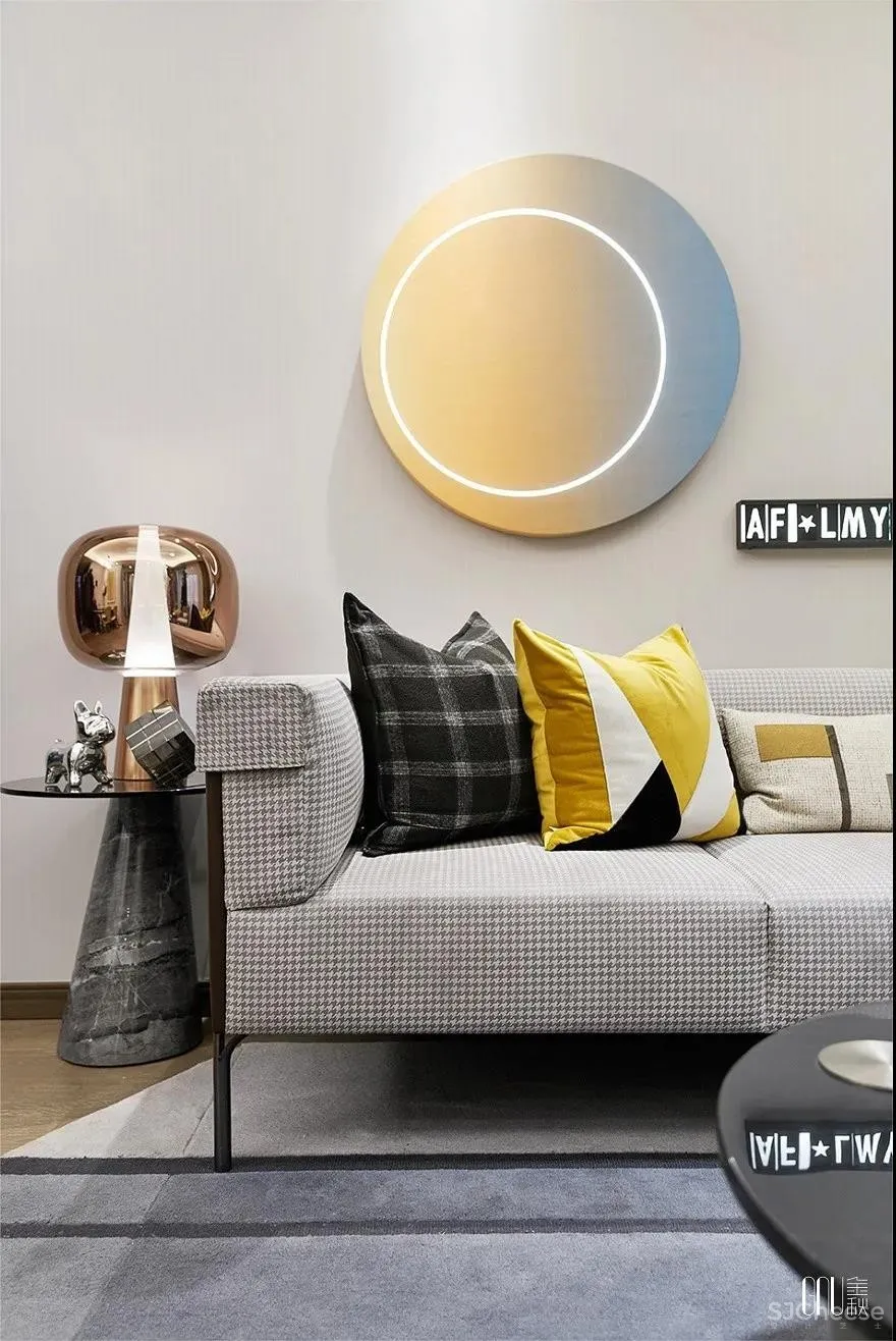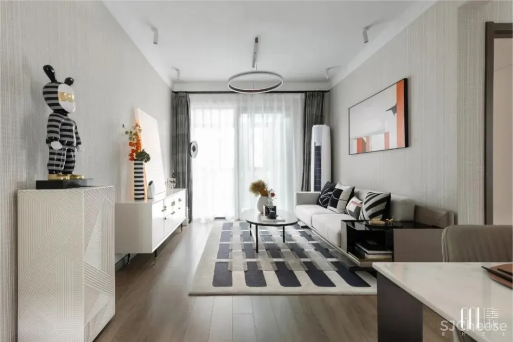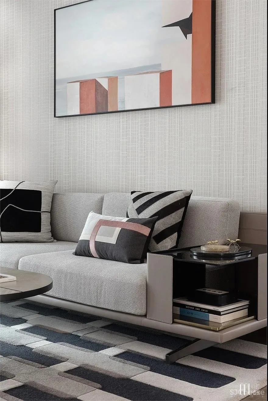 人偶藏着的玩心,在黑、白、灰三色碰撞的地毯上跳动。看似暗沉、实则多元的色调铺满整个空间,彰显独树一帜的几何交错。个性不是特立独行,而是始终如一地坚持。如同客厅的工艺摆设一般,轻奢的质感是追求品质的不变执着。