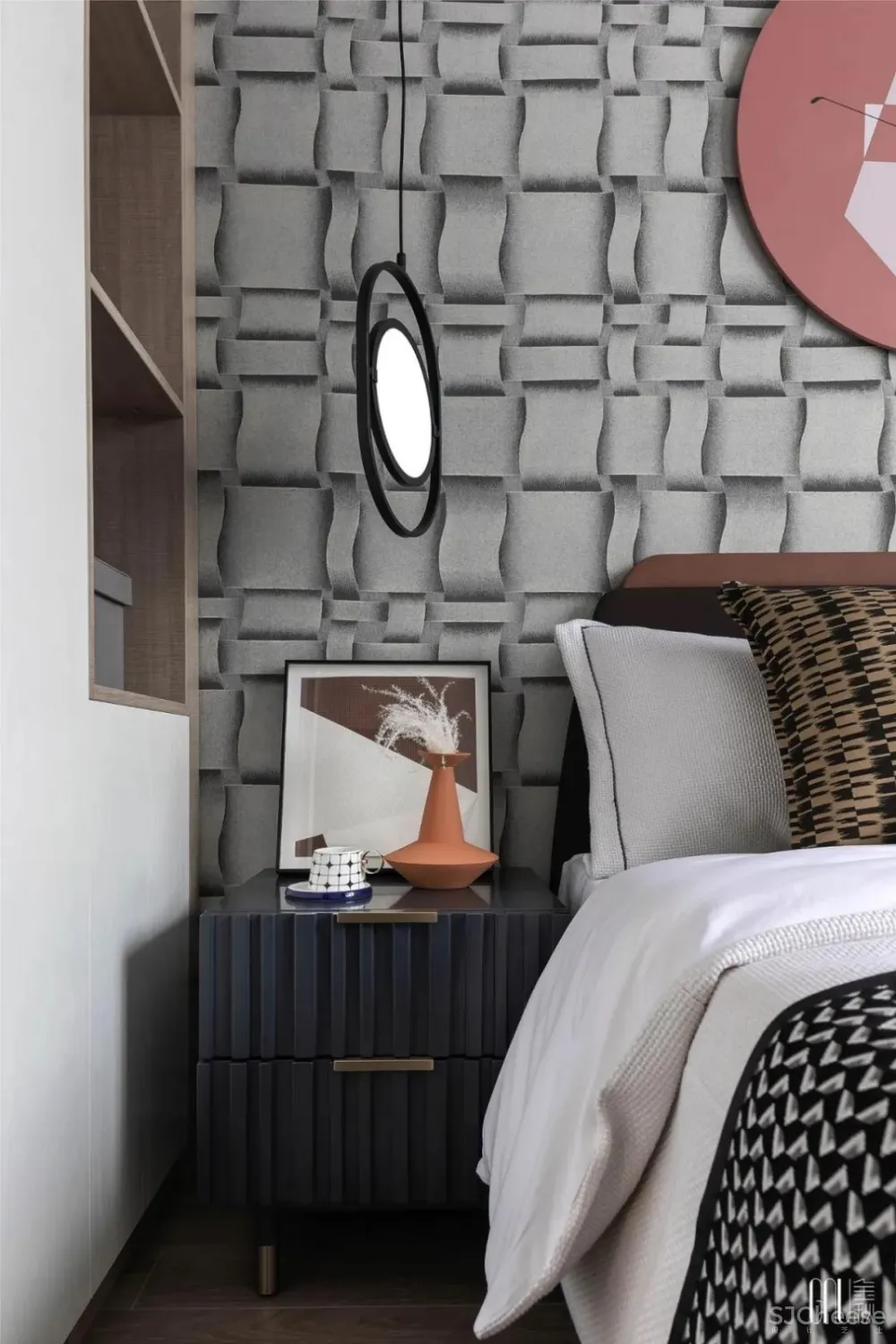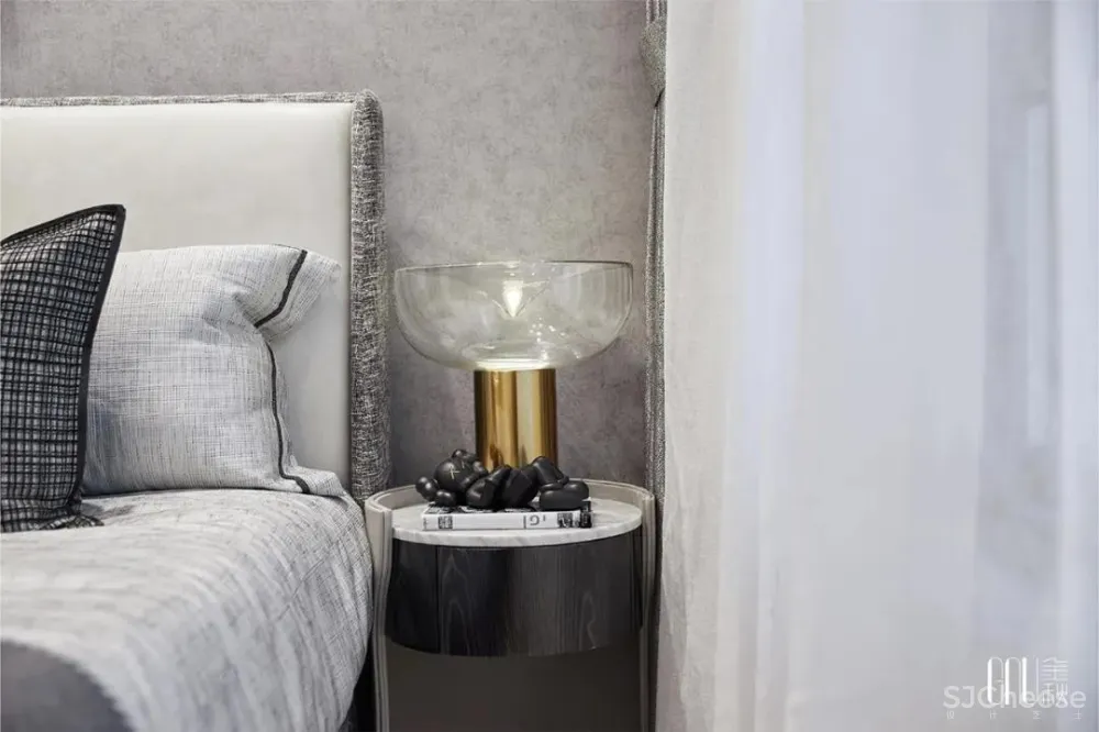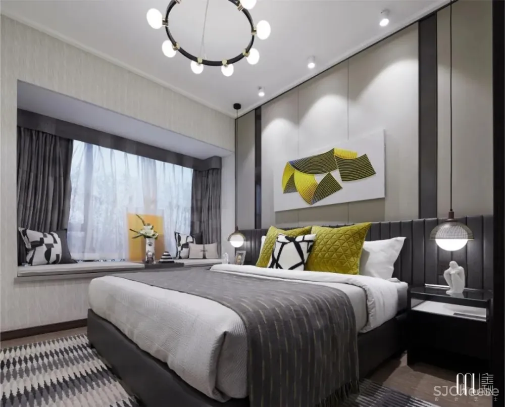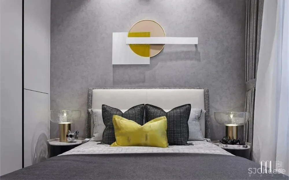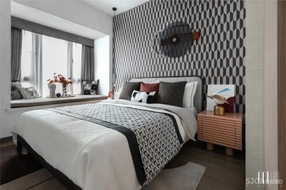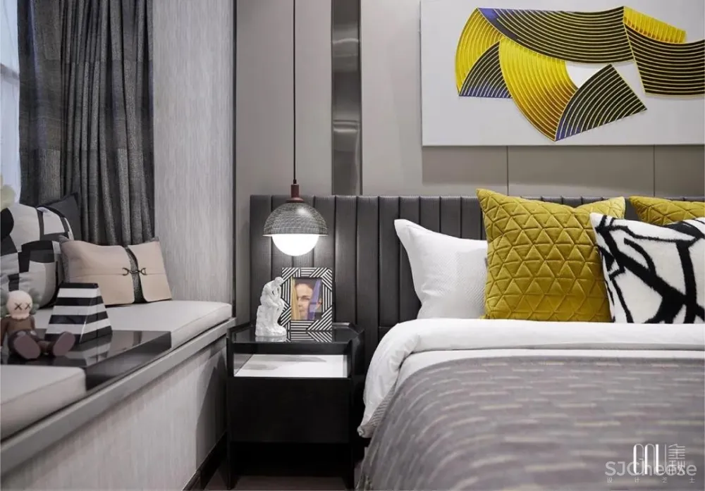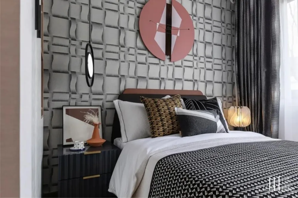 和谐是设计的至臻追求。床上靠垫随处可见的棱角被墙面柔和的波浪线包容,刚柔并济,演绎空间设计的静妙和谐。