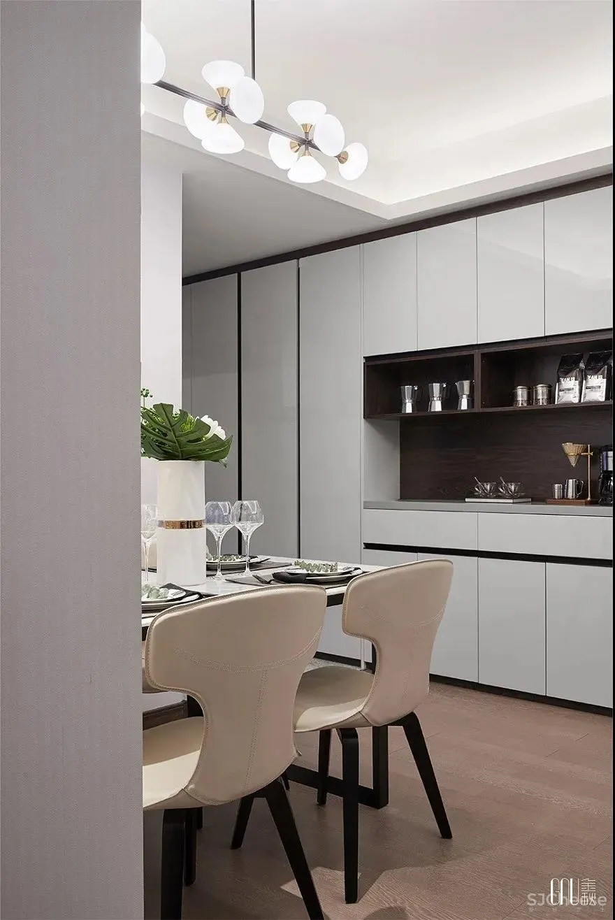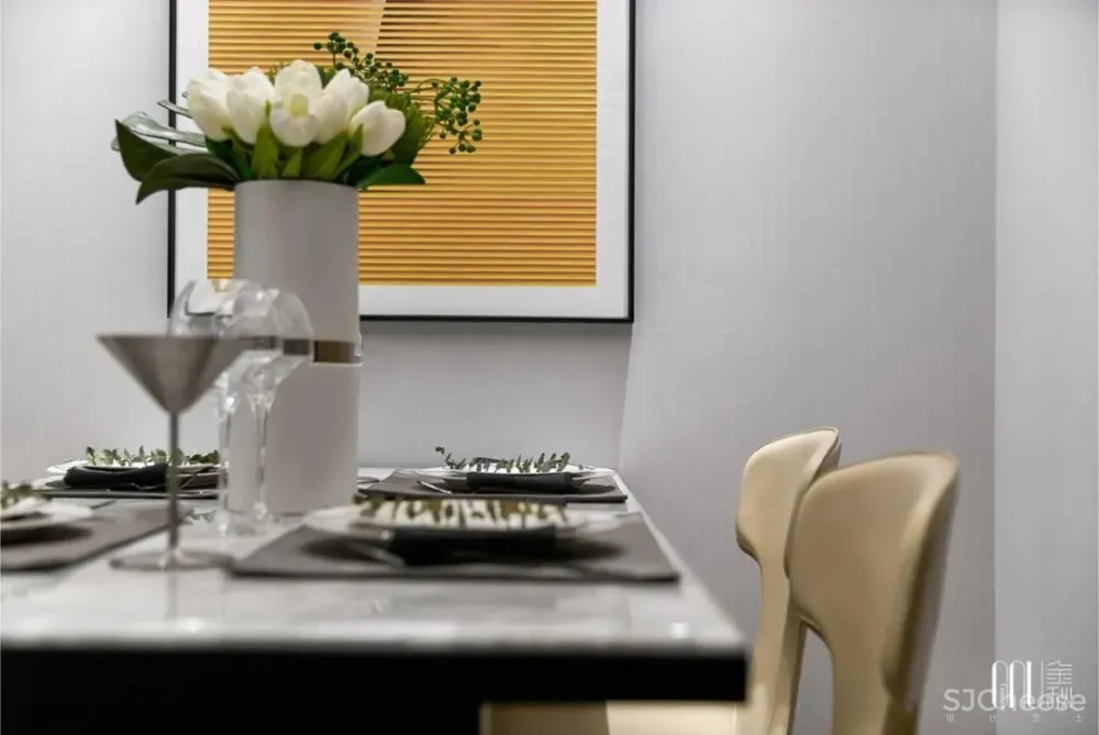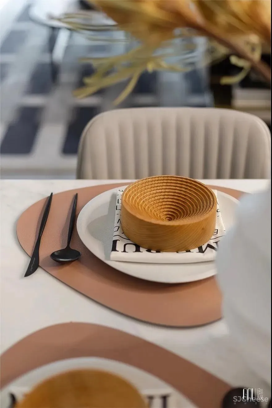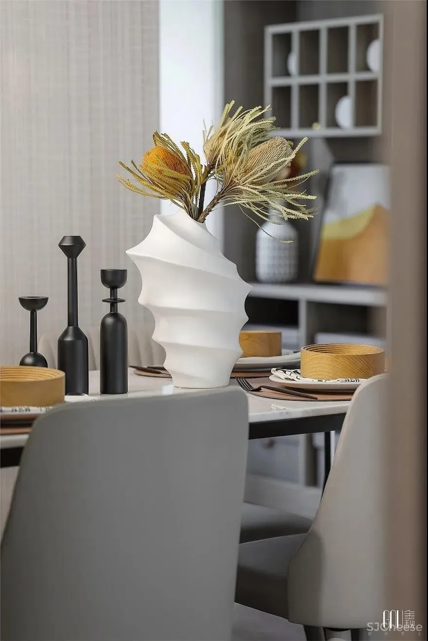 品质的追求不在于大肆显摆,恰恰在于细节的用心。餐桌上造型独特的陶艺泄露个性的棱角,与餐具的独特形状组成别具一格的线条,在细节处突出色调的融洽。