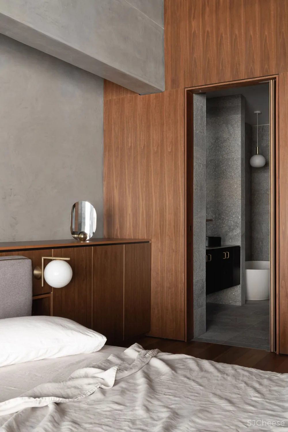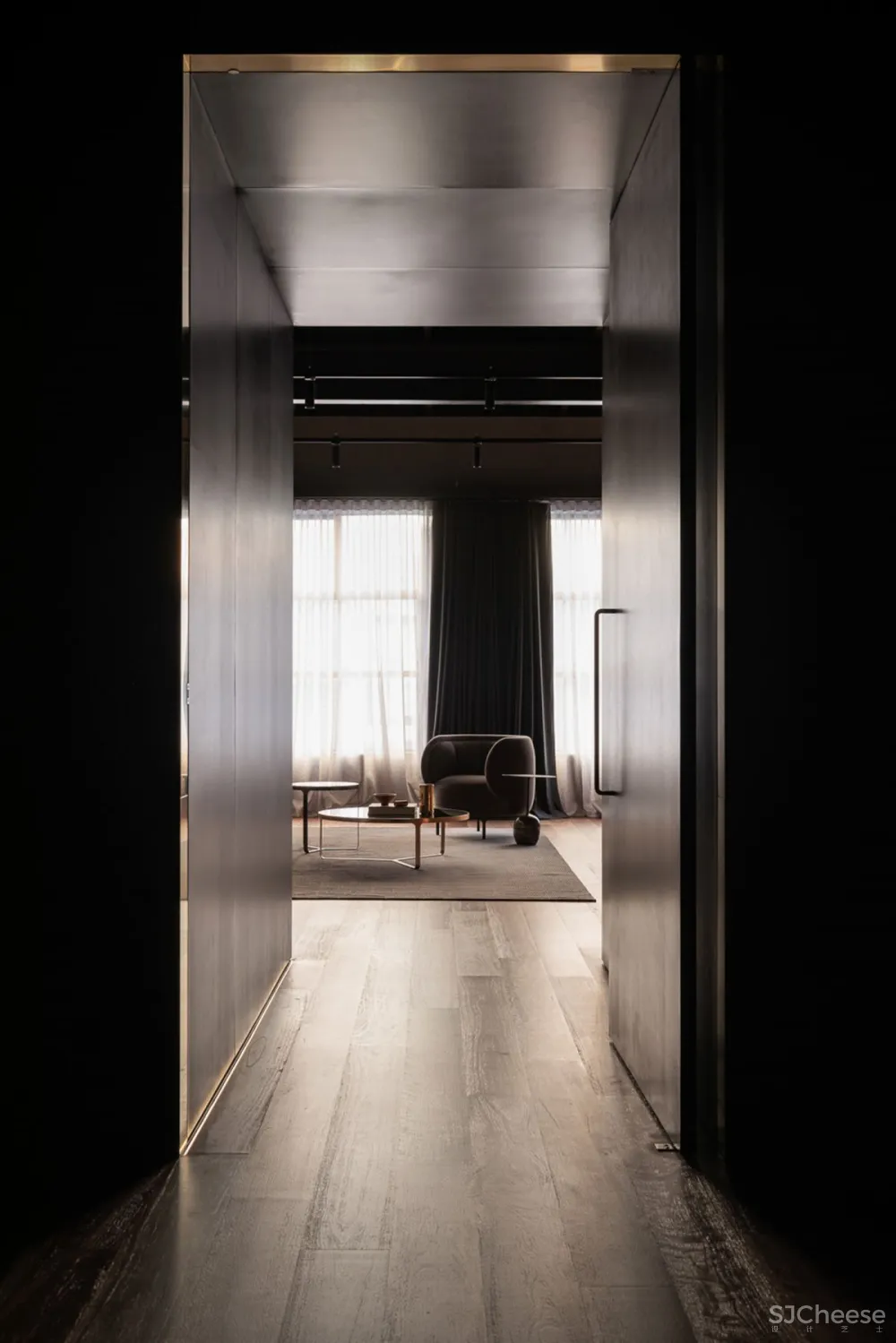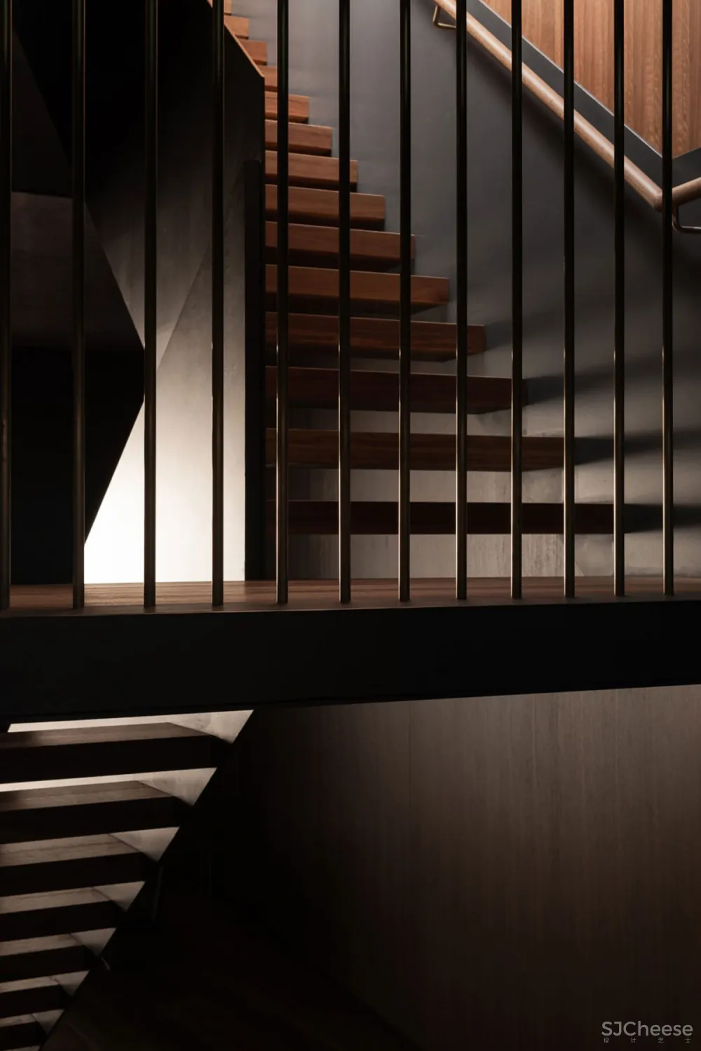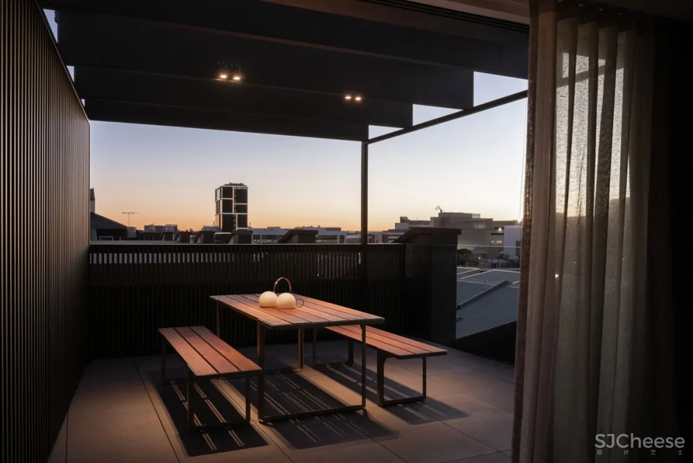 公寓围绕着一个中央画廊设计,一个钢和木楼梯通过它上升,连接低层的睡眠区和上层的生活空间。一个巨大的黄铜天窗漂浮在黑色的天花板上,为室内空间带来了丰富的金色日光。墙壁和地板上排列着斑驳的木镶板,它们的精致与穿过空间的大型原始混凝土梁并列在一起。