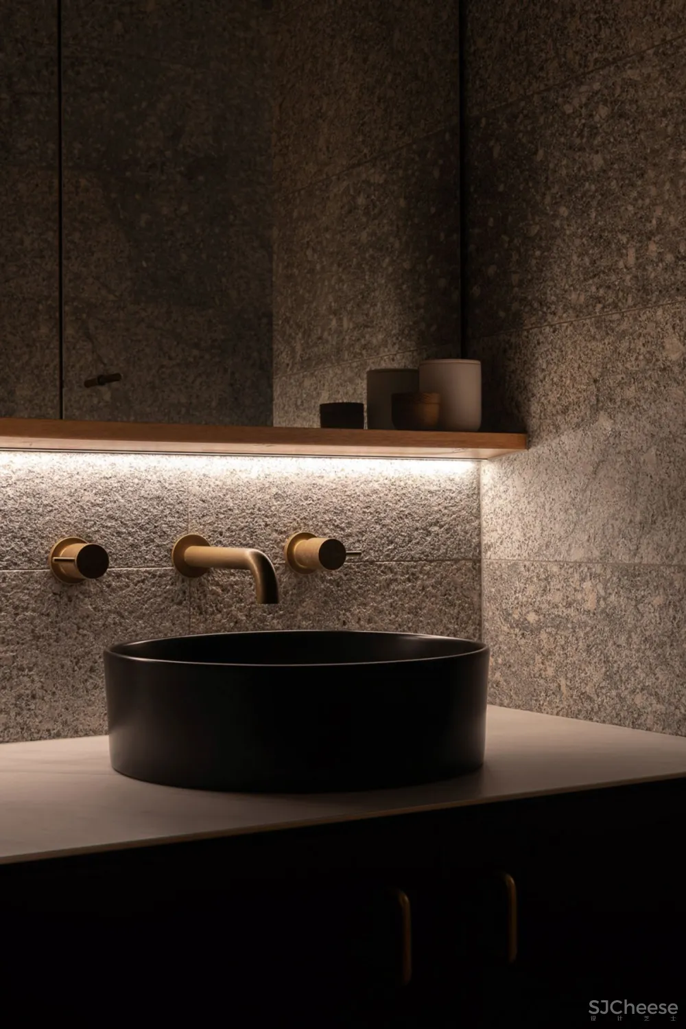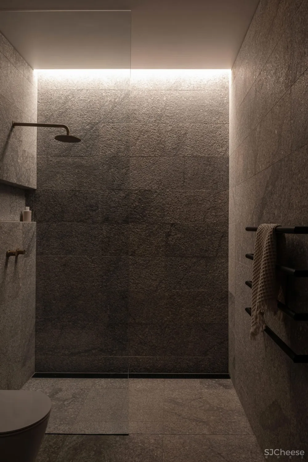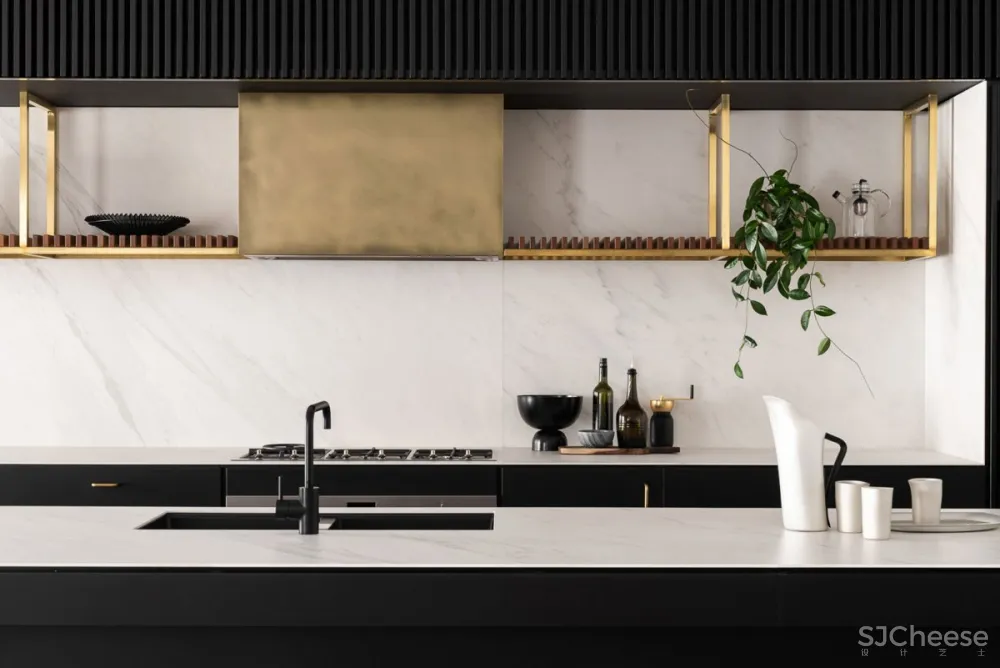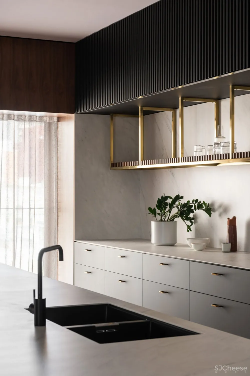 公寓围绕着一个中央画廊设计,一个钢和木楼梯通过它上升,连接低层的睡眠区和上层的生活空间。一个巨大的黄铜天窗漂浮在黑色的天花板上,为室内空间带来了丰富的金色日光。墙壁和地板上排列着斑驳的木镶板,它们的精致与穿过空间的大型原始混凝土梁并列在一起。