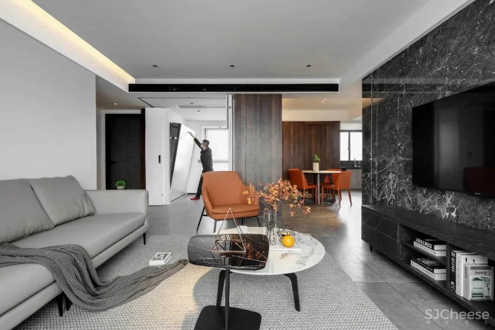 设计师运用折叠门的手法,让本案在空间上产生了更多可能性,多功能房可以是客房、书房、小朋友的游乐场。这样做的优势在于,在家看顾小朋友的家长可以很好的兼顾小朋友与厨房的动态,同时无形中增加了小朋友玩耍的空间。