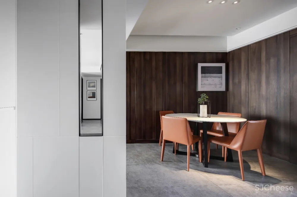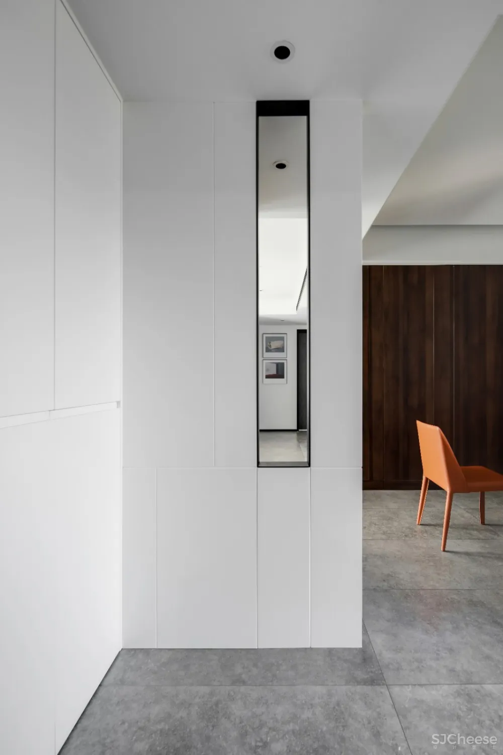 “玄之又玄,众妙之门”,玄关是家的聚气之所、财运之门,设计师运用打开的方式,让原本的封闭式厨房变成开放式厨房,让本来显得局促餐厨空间豁然开朗。