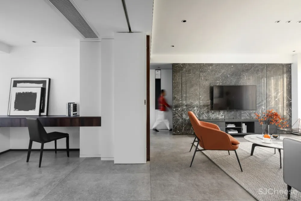 空间上,居住者能够在客厅区域很好地兼顾厨房、餐厅以及多功能房的动态。