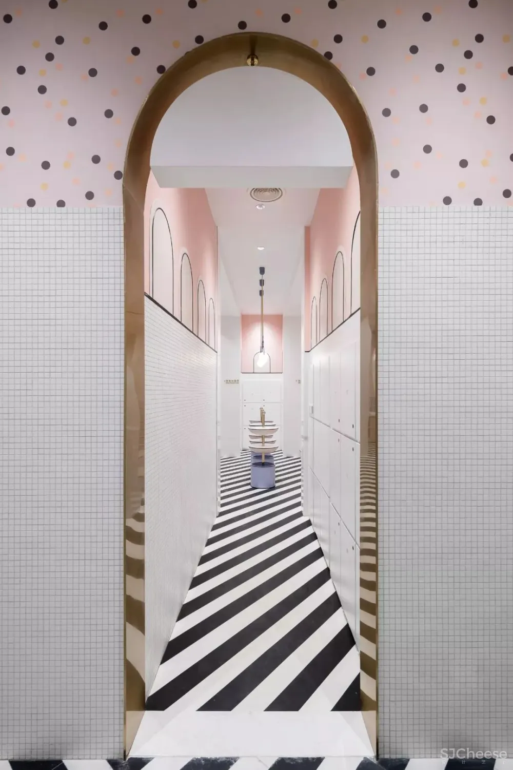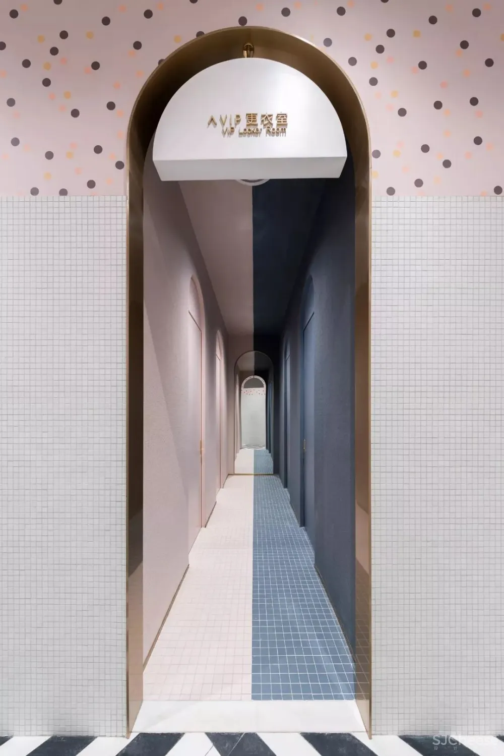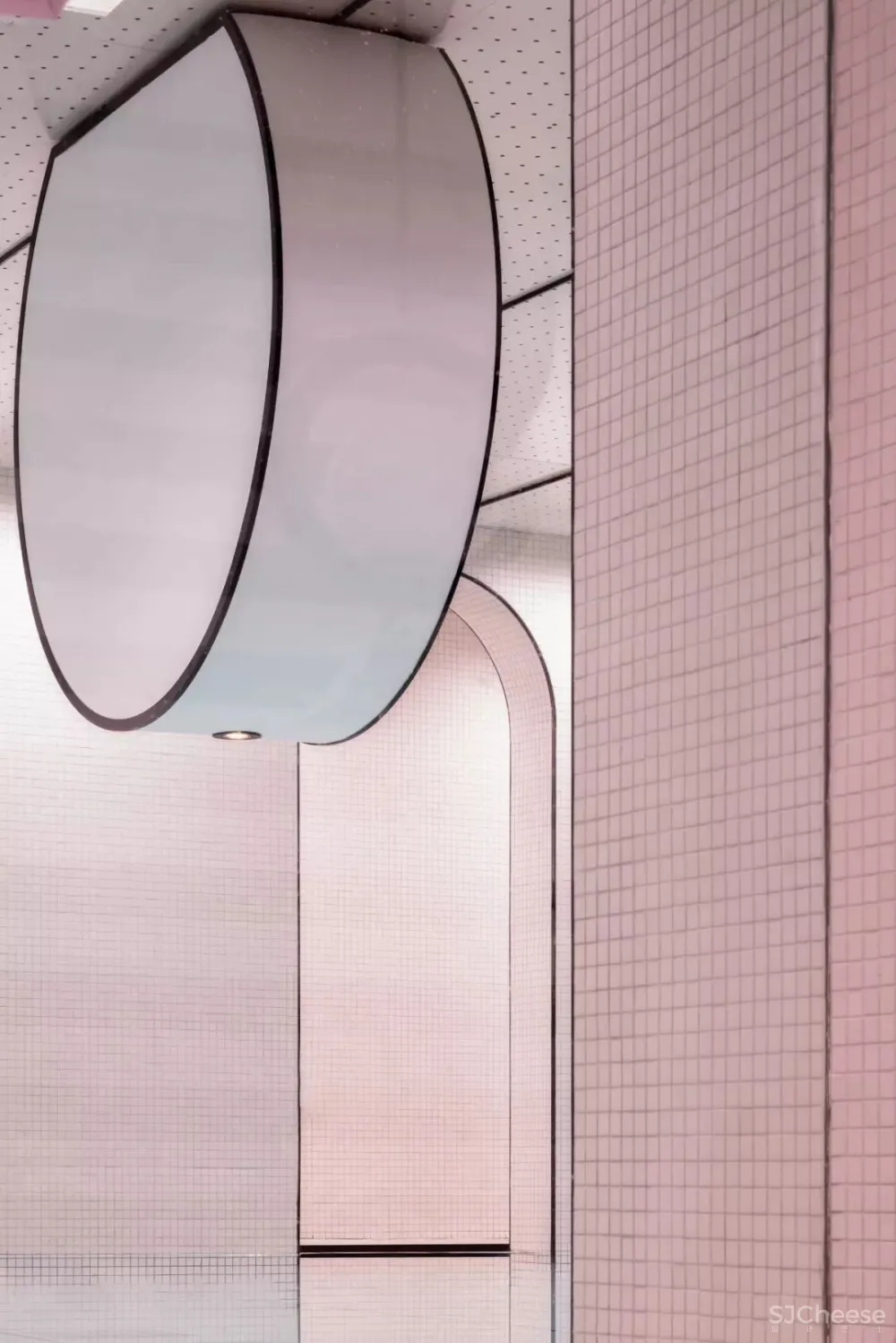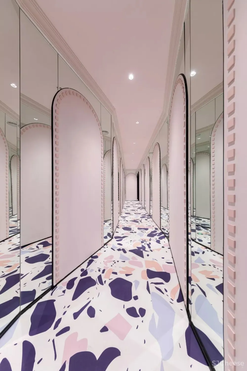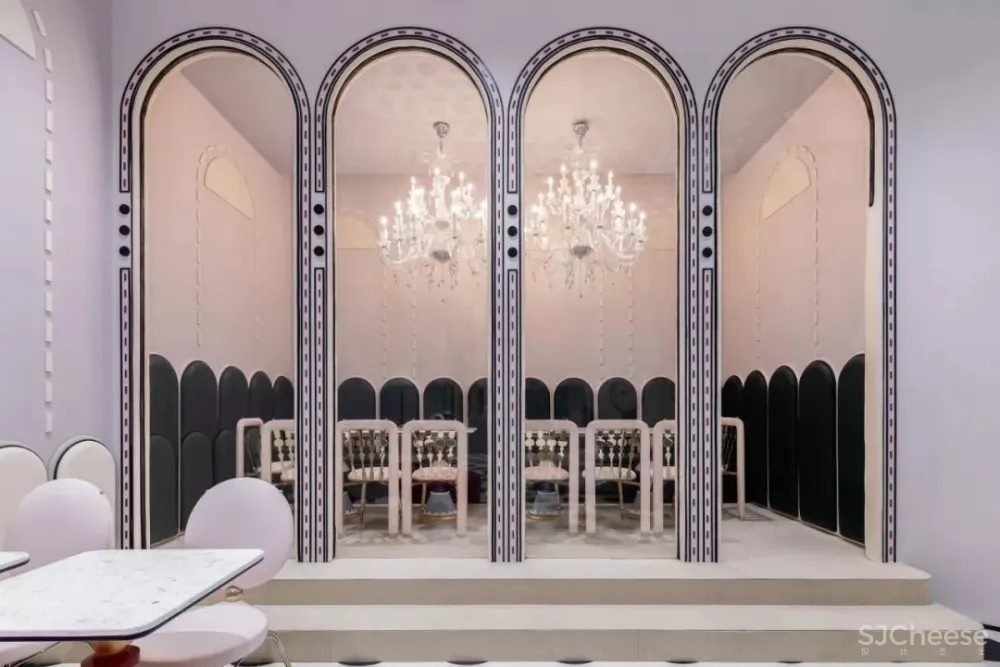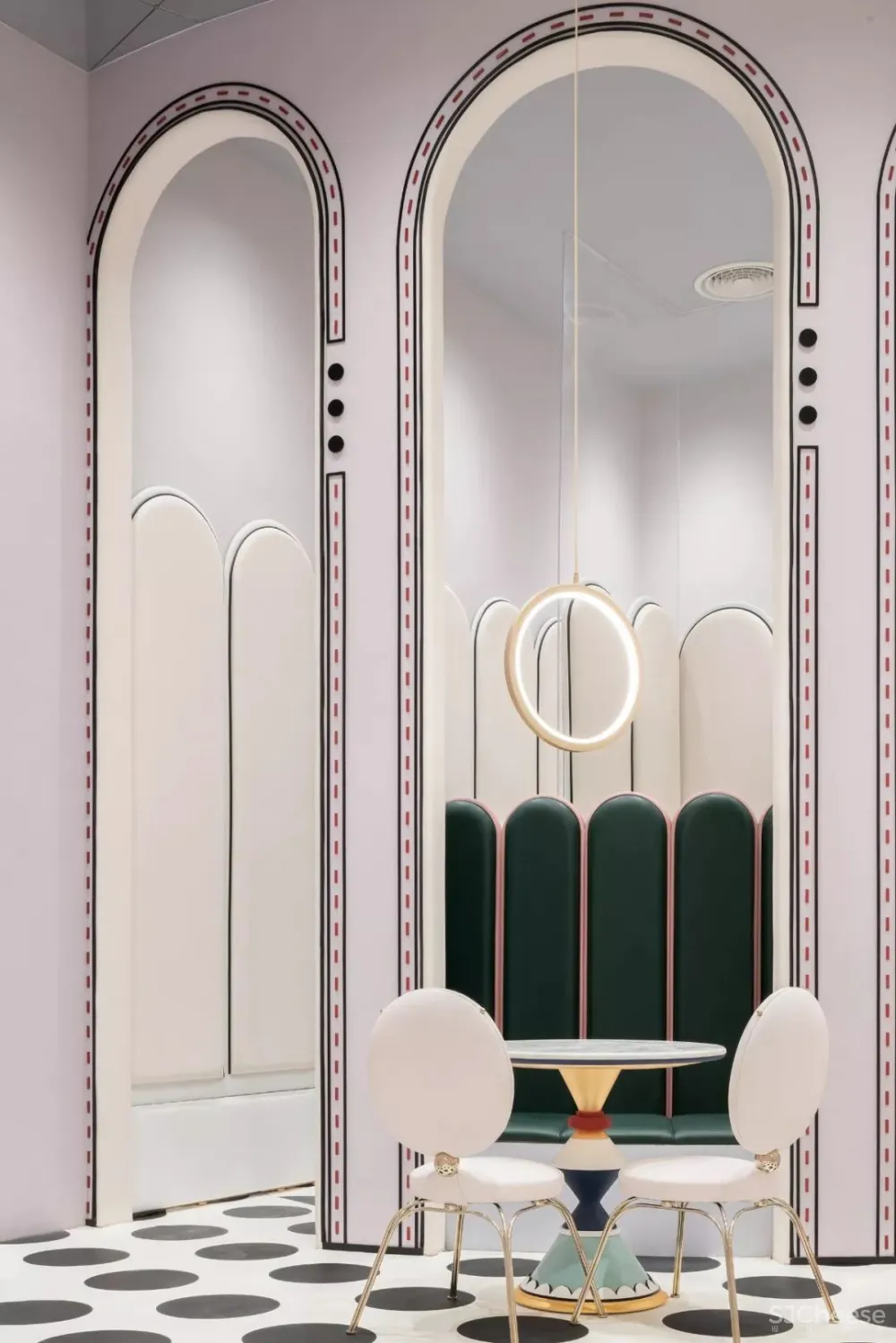 从小至两厘米的圆拱形花边到挑高三米的圆拱弧门,统一、极简的设计元素,通过大小比例的调整运用,从大尺度覆盖到小尺度,构成了空间中的美学比例逻辑。 无特别照明的设计,意图强调整个空间无重点便是最大的重点,以打造一种沁入式的梦幻体验。