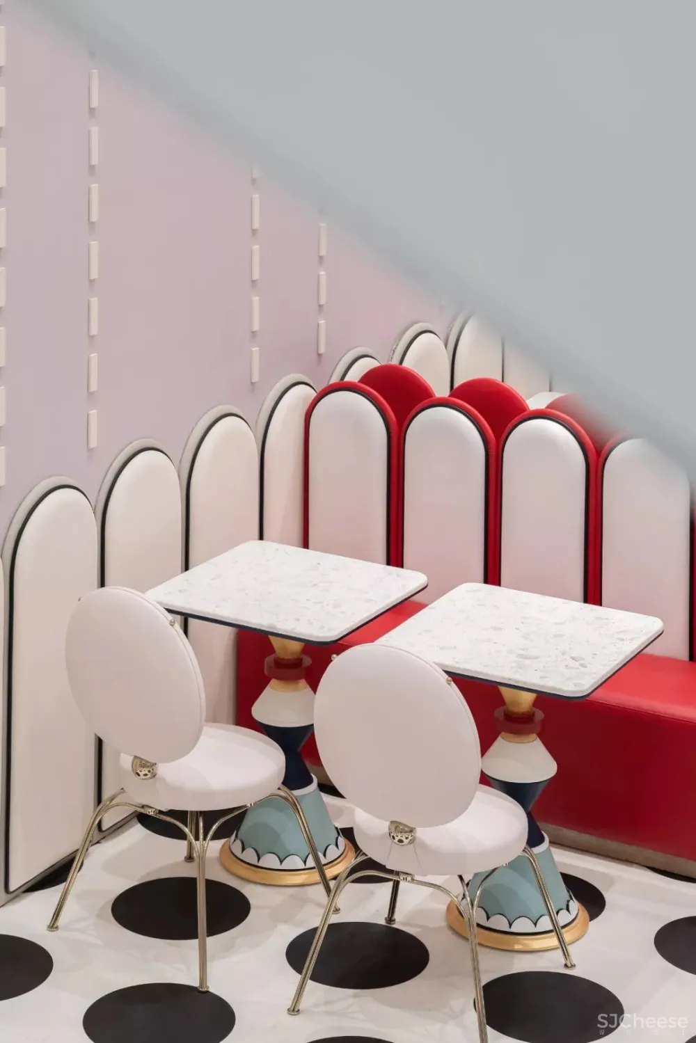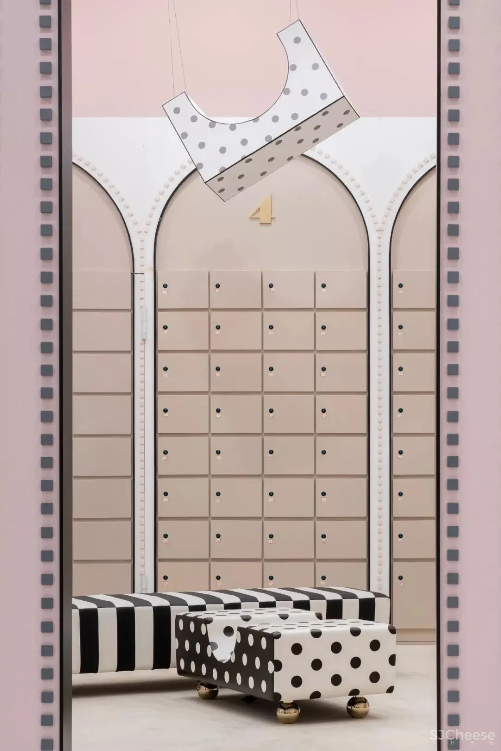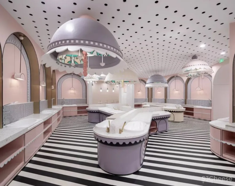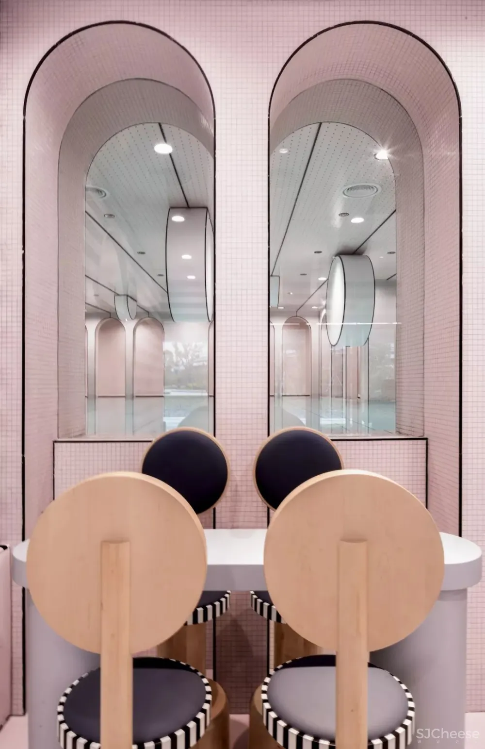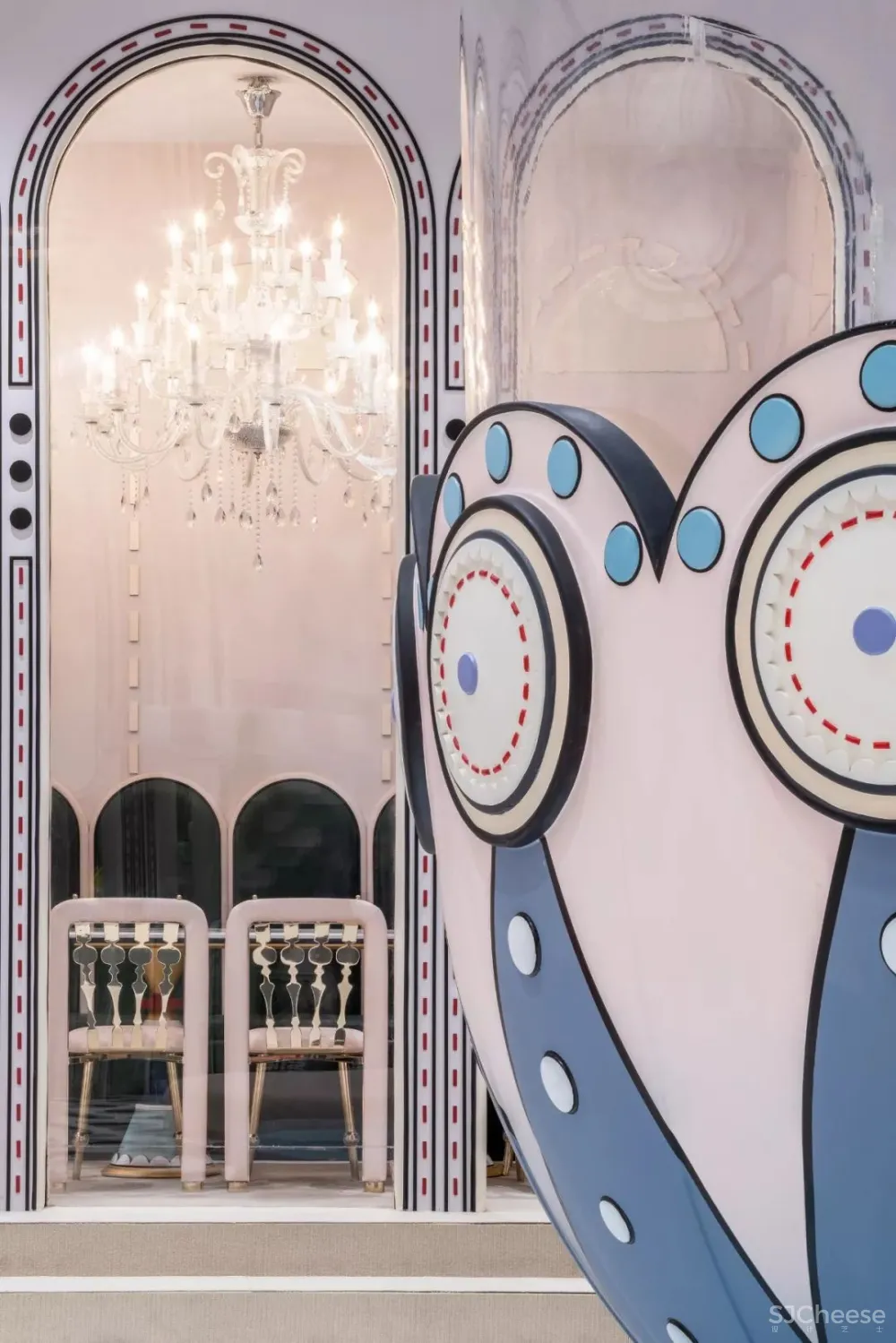 从小至两厘米的圆拱形花边到挑高三米的圆拱弧门,统一、极简的设计元素,通过大小比例的调整运用,从大尺度覆盖到小尺度,构成了空间中的美学比例逻辑。 无特别照明的设计,意图强调整个空间无重点便是最大的重点,以打造一种沁入式的梦幻体验。