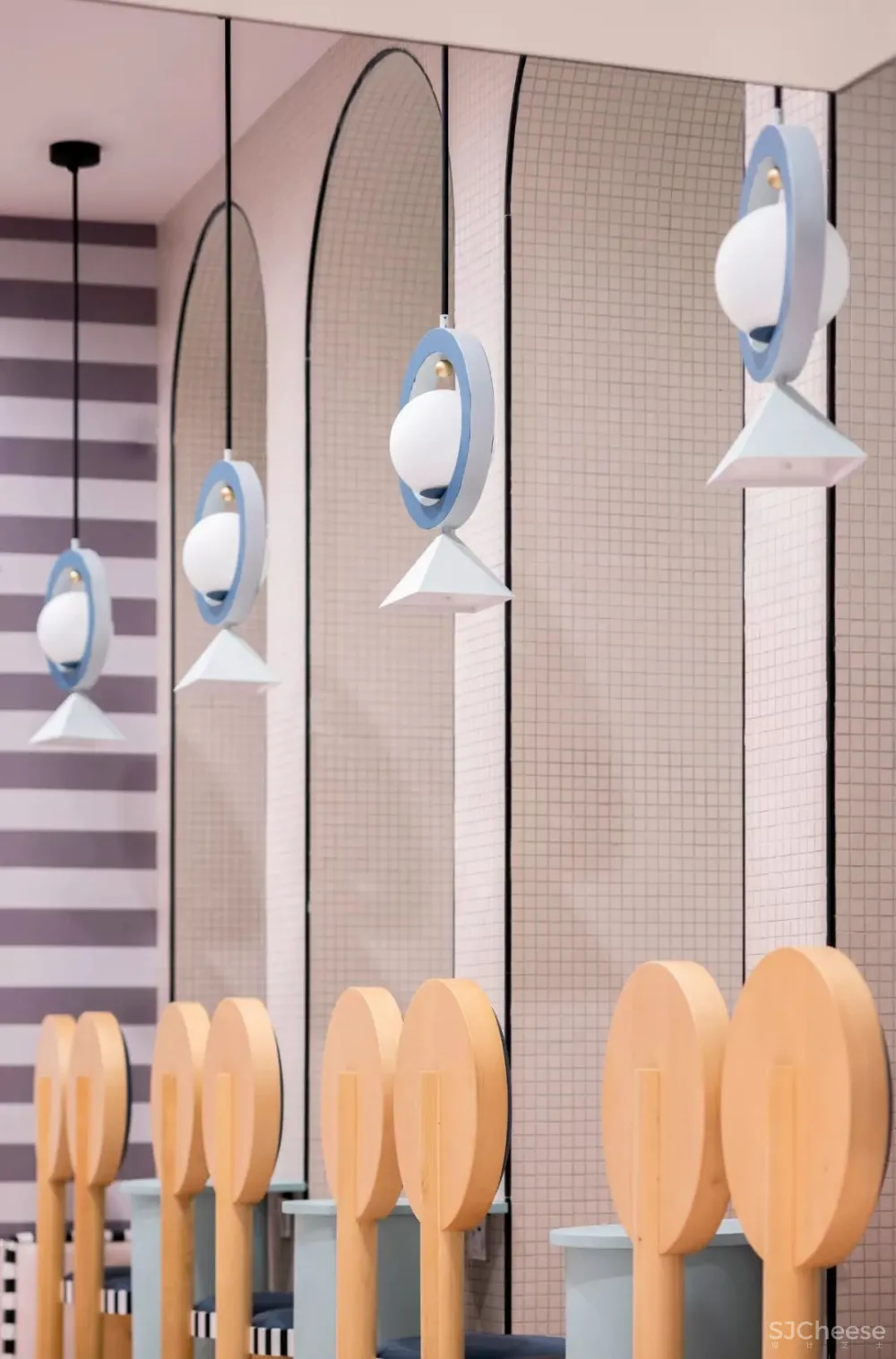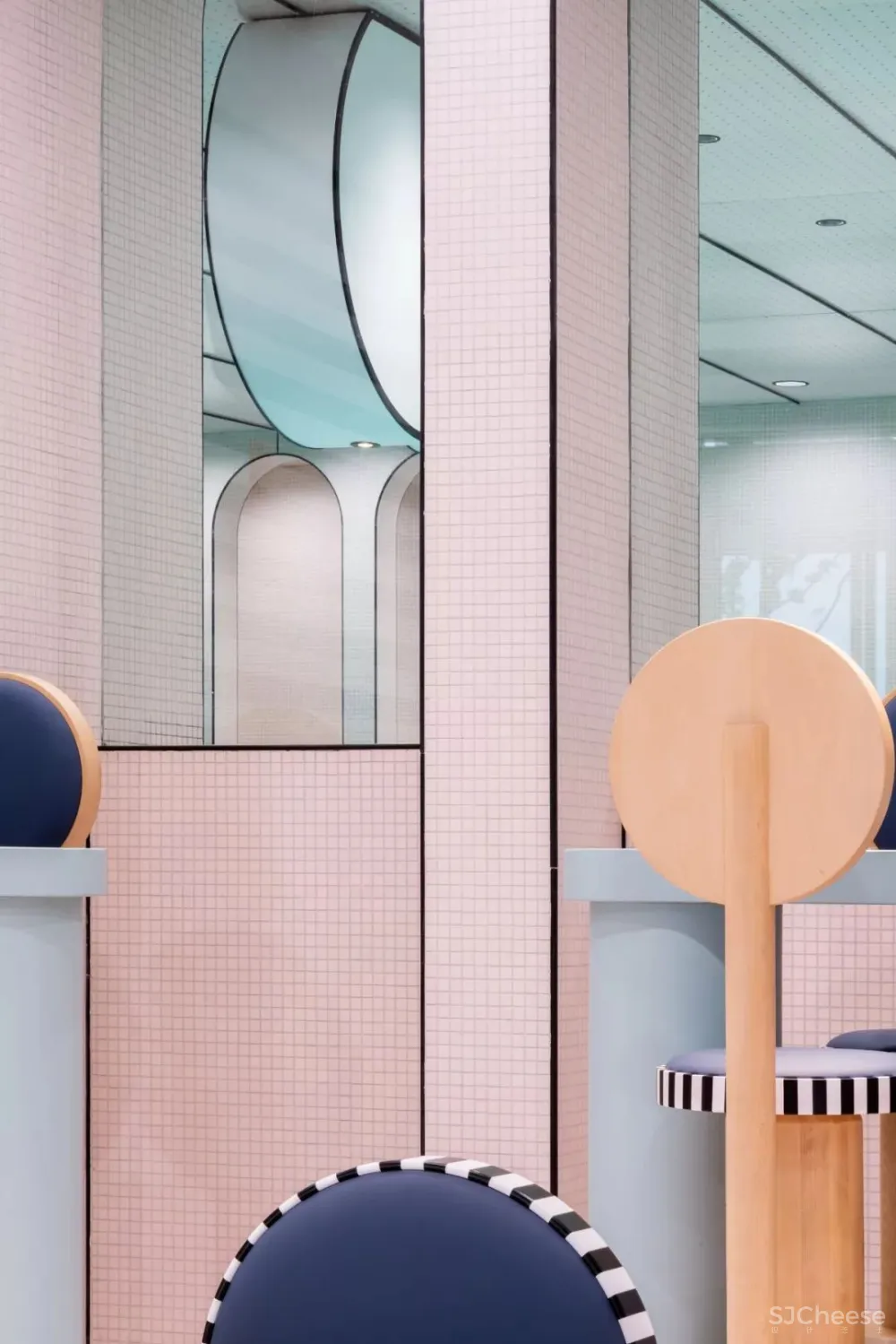 整个亲子游泳馆仅采用了温柔的色感,并不刻意做性别上的色彩取向区分。黑色细线描边的设计手法,给整个略显轻飘的空间底色增添了几分时尚先锋感,从构图上来讲,同时也成就了平面美学。