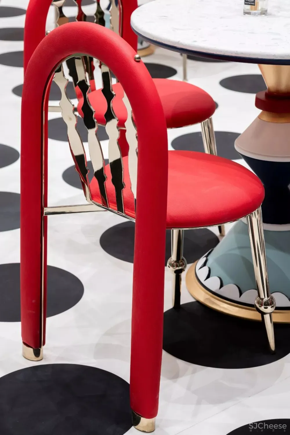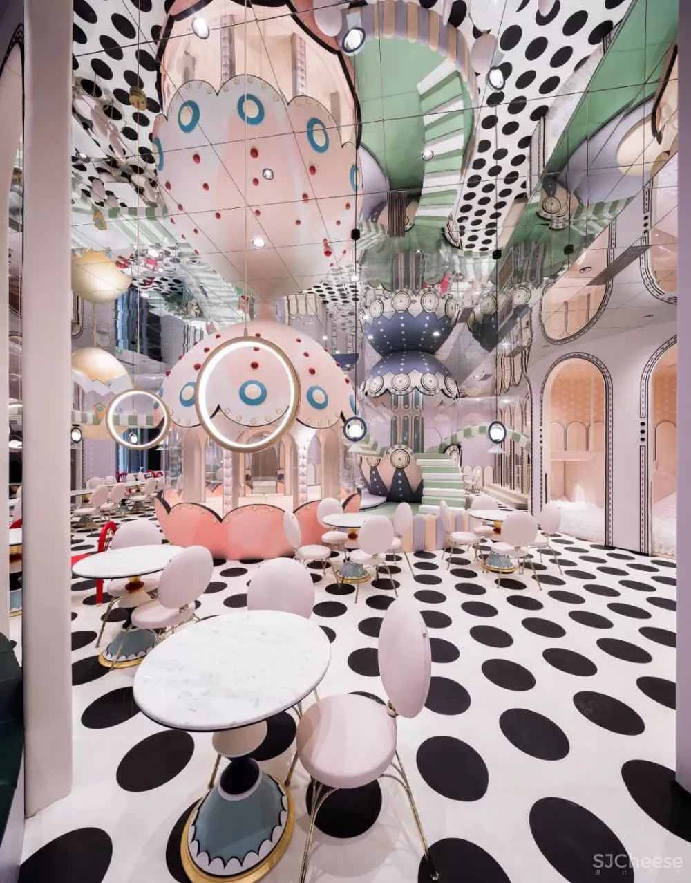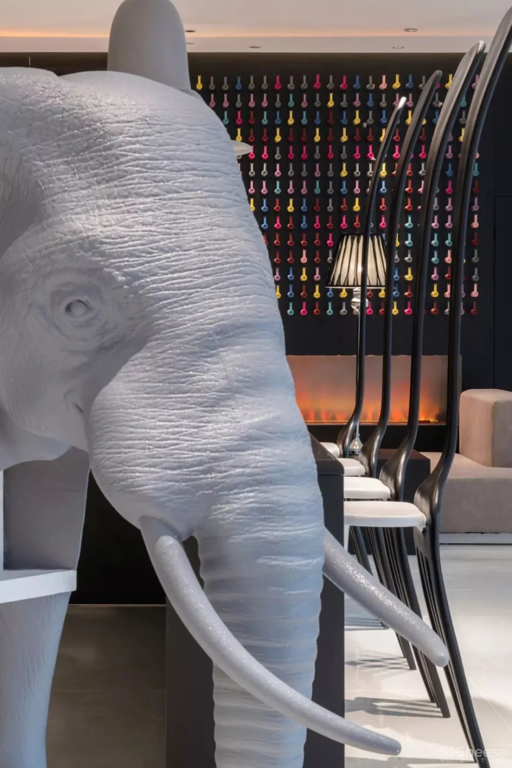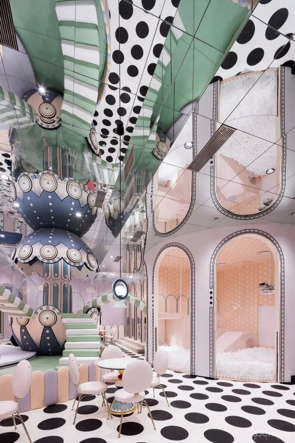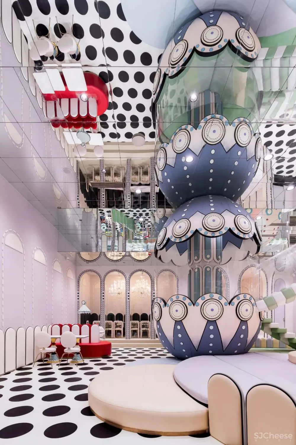 天花上夸张的巨型水滴灯,仿佛是凝结的水珠将落未落,让空间中充满了一种戏剧般的魔幻张力。