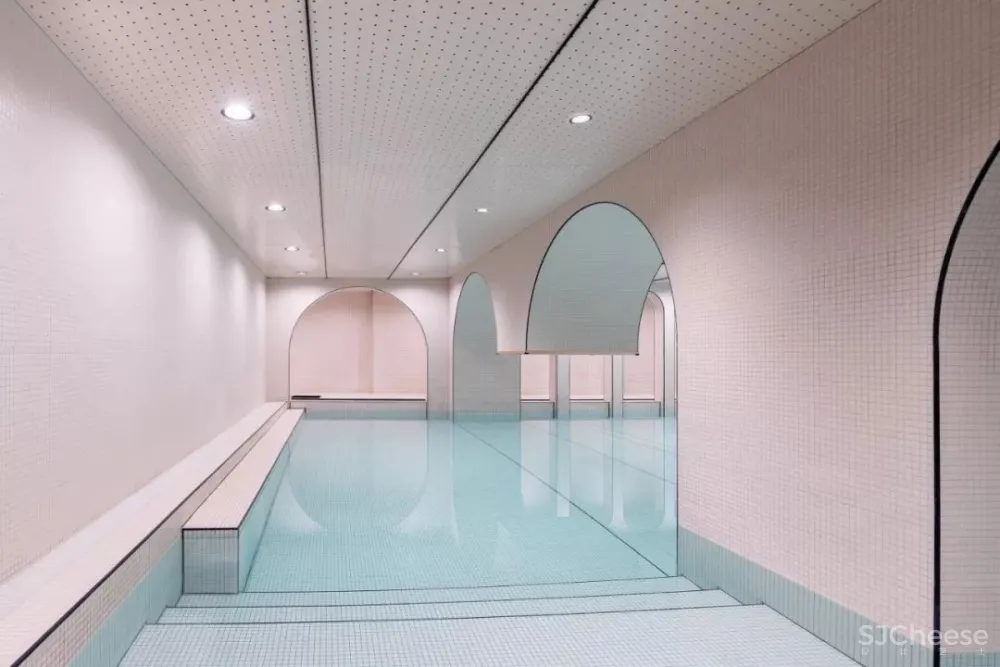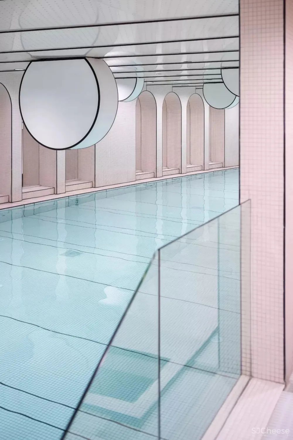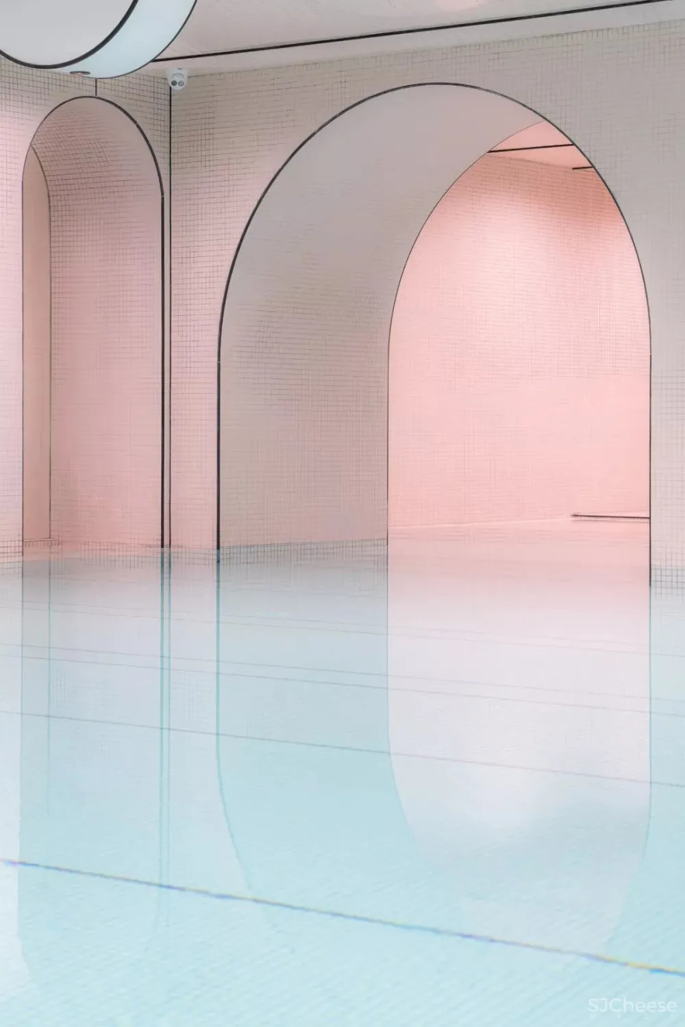 完善的功能与人性化的流线将各人群引领到泳池的入口,泳池区粉色的墙面和蓝色的池水,在水雾的调和下,呈现出了一种仙气儿十足的色调。