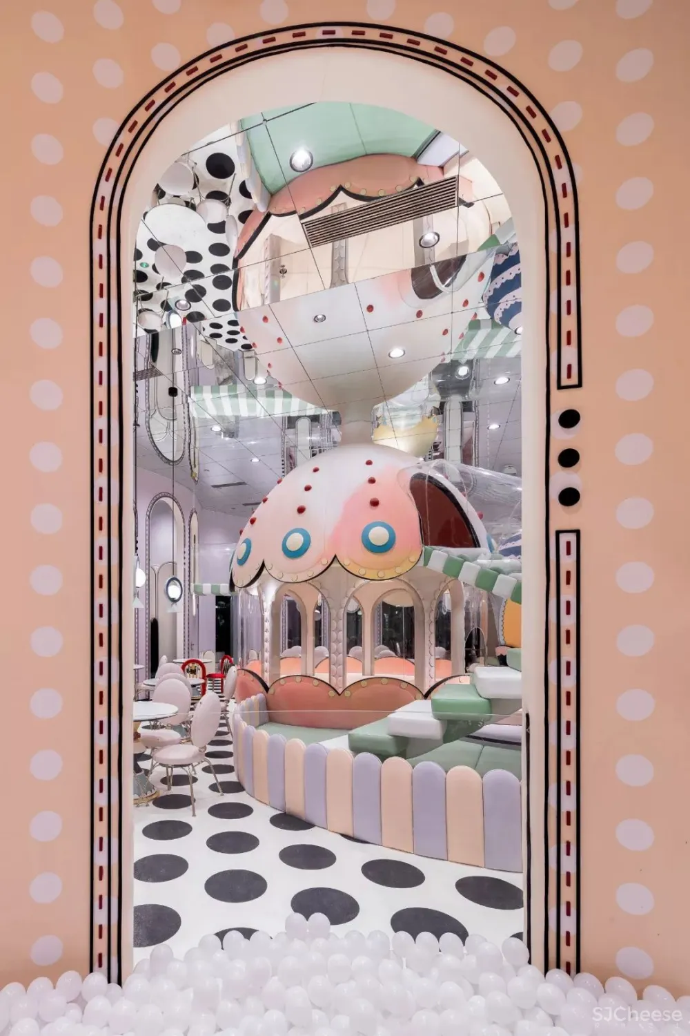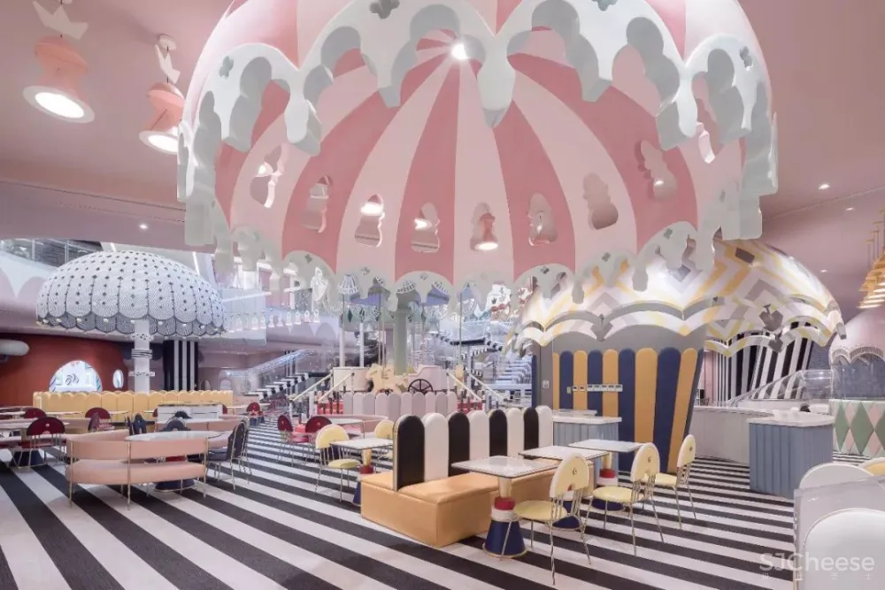 作为儿童娱乐功能使用的“蛋壳城堡”,在餐厅的中心设置了唯一入口点,爬道向四方延伸。就餐区包围或穿插在其中,让餐桌上的爸爸妈妈们能快速定位到爬道中玩耍的孩子。