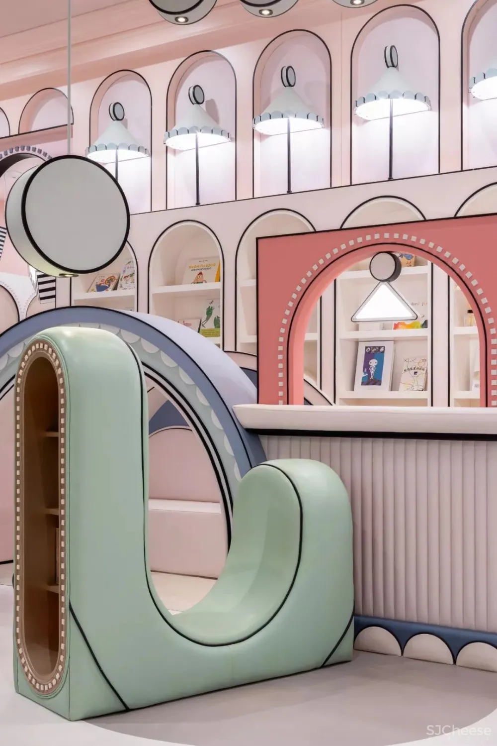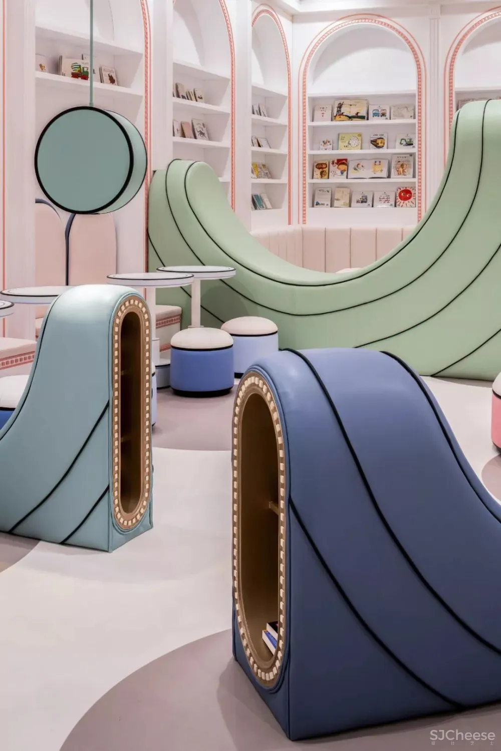 穿过前台,并通过换鞋区域后承载的区域即是图书区。图书区承载着重要的家长休息聚集的功能,图书区里休闲榻借由浪花的形态来表现,翻腾而起的浪花中间凹陷的弧度,刚好适合小读者们或坐或卧。
