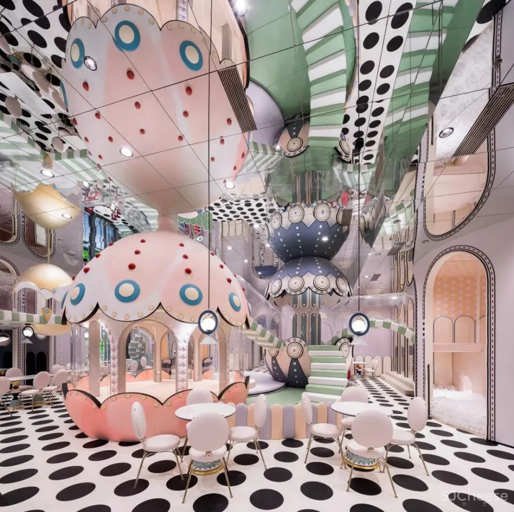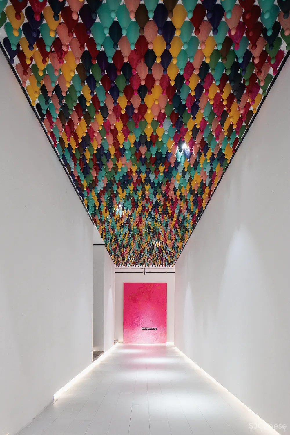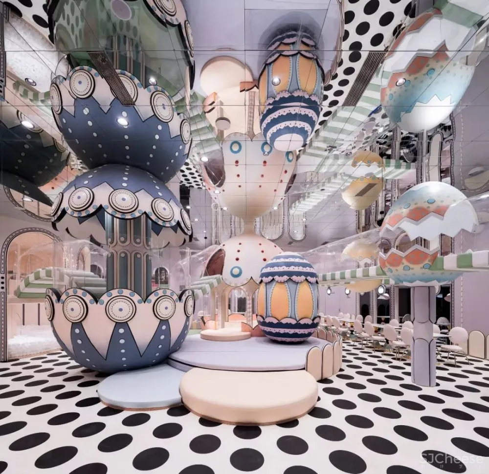 回到图书馆往右走便是龙格游泳馆的餐厅区。一只只“碎裂”的小蛋壳错落有致地排布在垂直空间内,绚烂的色彩、童话般的造型在镜面的反射下,让人仿佛身临空中奇幻城堡。