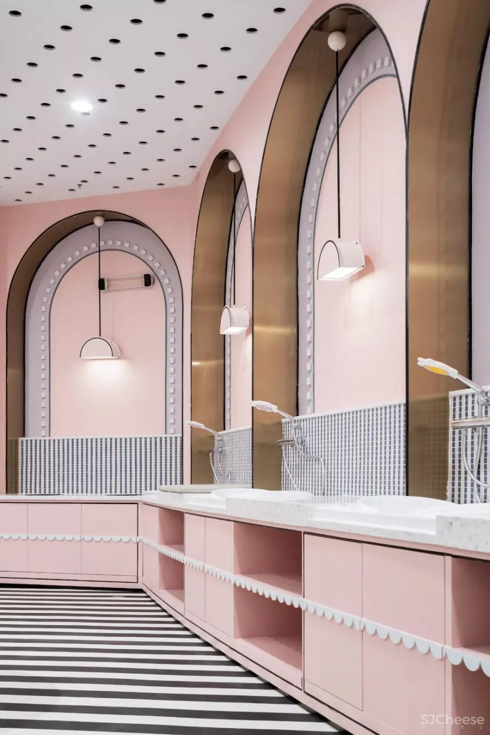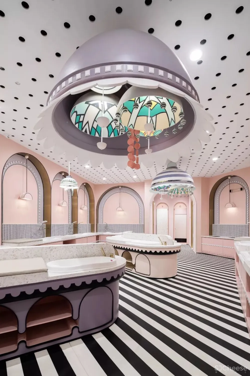 在走廊的端头为不同消费者沐浴的主要功能区-洗浴区。洗浴区分为婴幼儿洗浴区与成人洗浴区。巨大的花朵吊灯是婴幼儿洗浴区中较为抢眼的视觉停留点,也是最能体现设计上对于人群特性以及幼儿美育的思考之处。