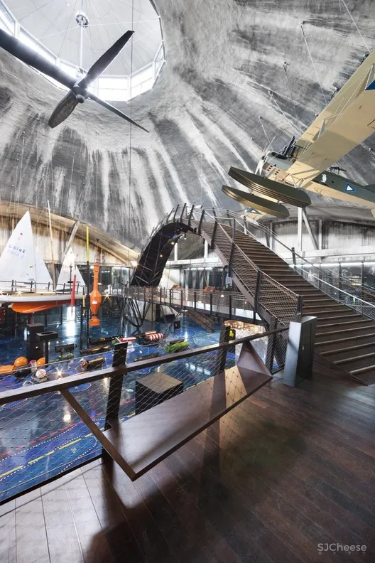 KOKO建筑事务所在设计展馆时的主要想法是要强调概念,在空间设计上的挑战性是要具有灵活性,并在同一时间相当灵活。机库的内部被分为三个“领域” – 水下,表面,和空中。在这些“领域”里,在这个特定的环境里的海事博物馆里人们能够欣赏到大量的藏品, – 水雷和在海底世界里的一艘潜艇“Lembit”,另外游艇,快艇和大炮在水面上,飞机和其他空中设施位于水泥壳的下面(如肖特184型水上飞机)。