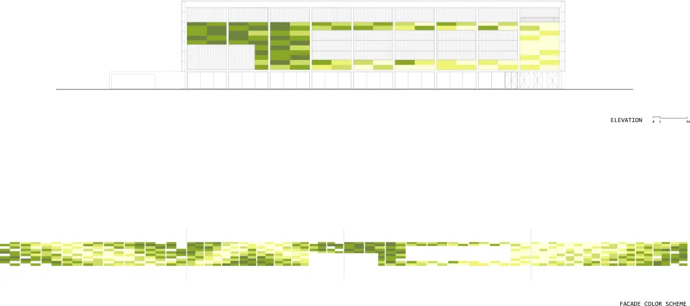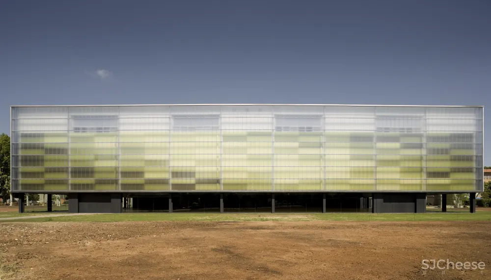在外面,绿树的叶子和它们的阴影被再现在新展馆的外墙的像素图案中。在此之前,聚碳酸酯的皮肤模糊了外观的颜色和建筑的真实尺寸。