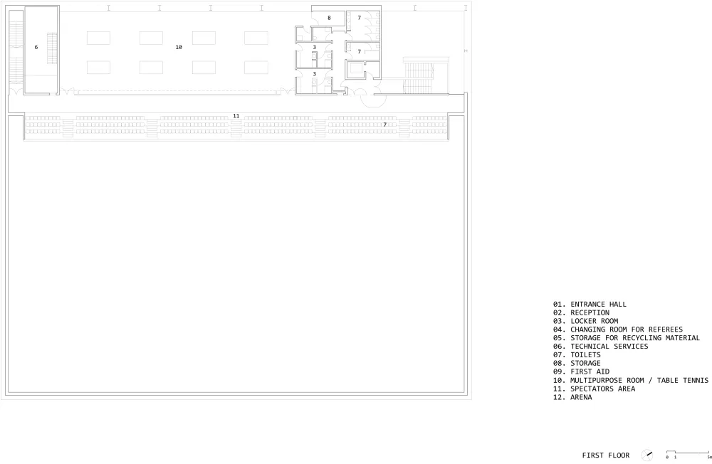 新建的体育馆是一个漂浮在地面之上的容积。身体达到清晰和圆润的几何形状。因此,我们有可能使用更衣室的面积为小格式体育(乒乓球)以及服务和设施领域。盖子,随着节奏的光束,照亮了一个大的内部白色空间。球场最重要的是活动、运动和比赛。