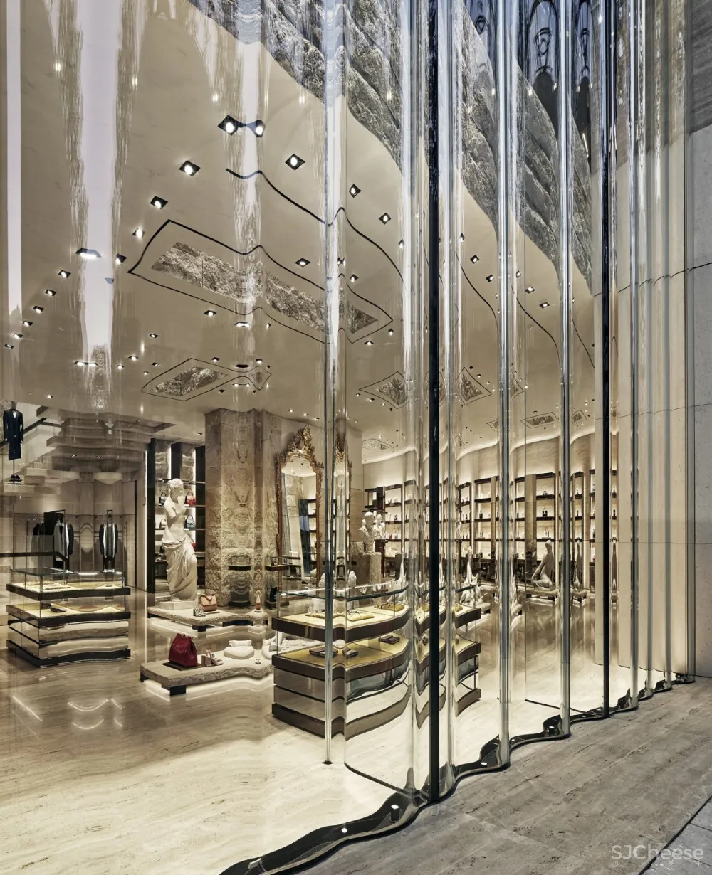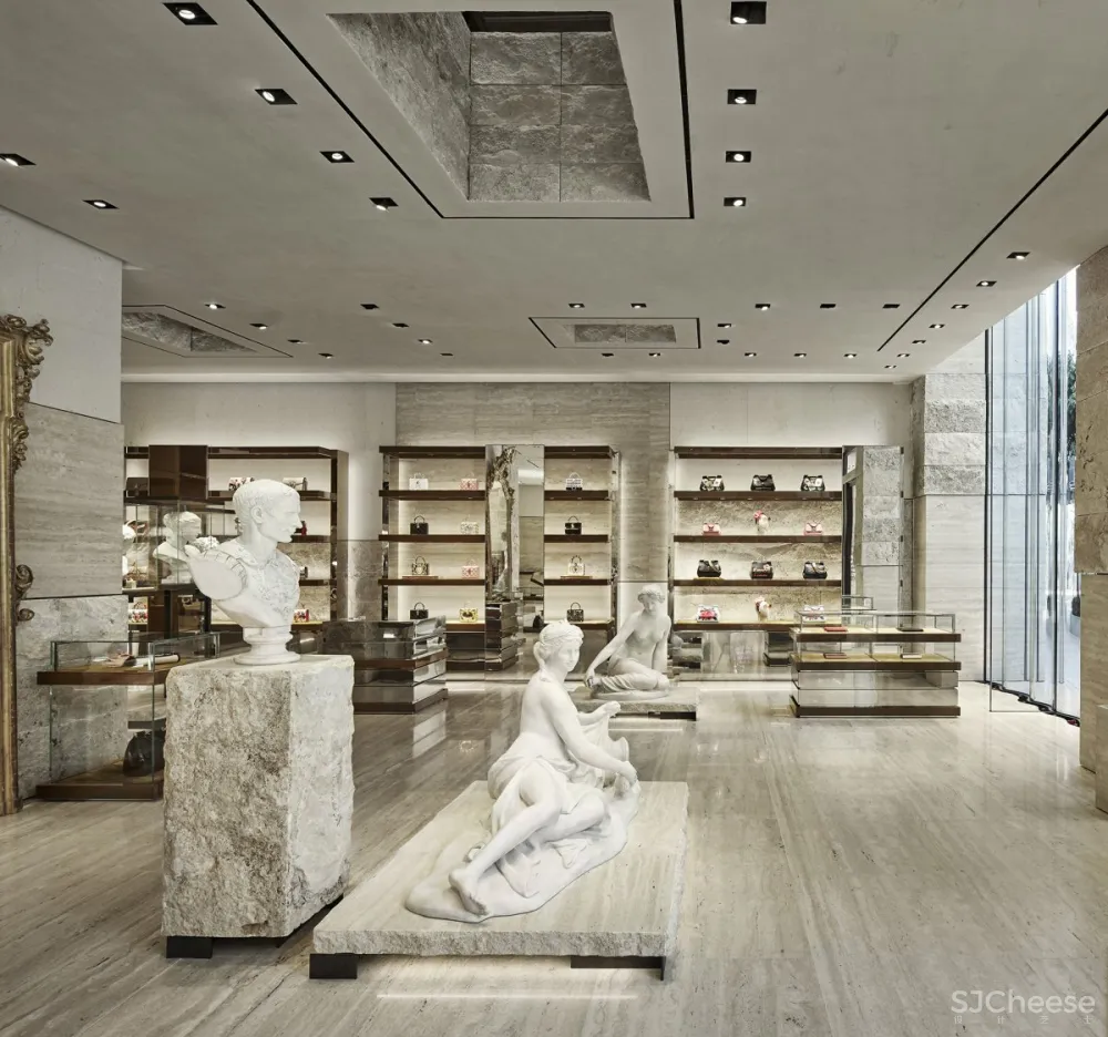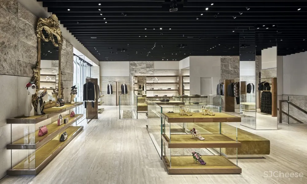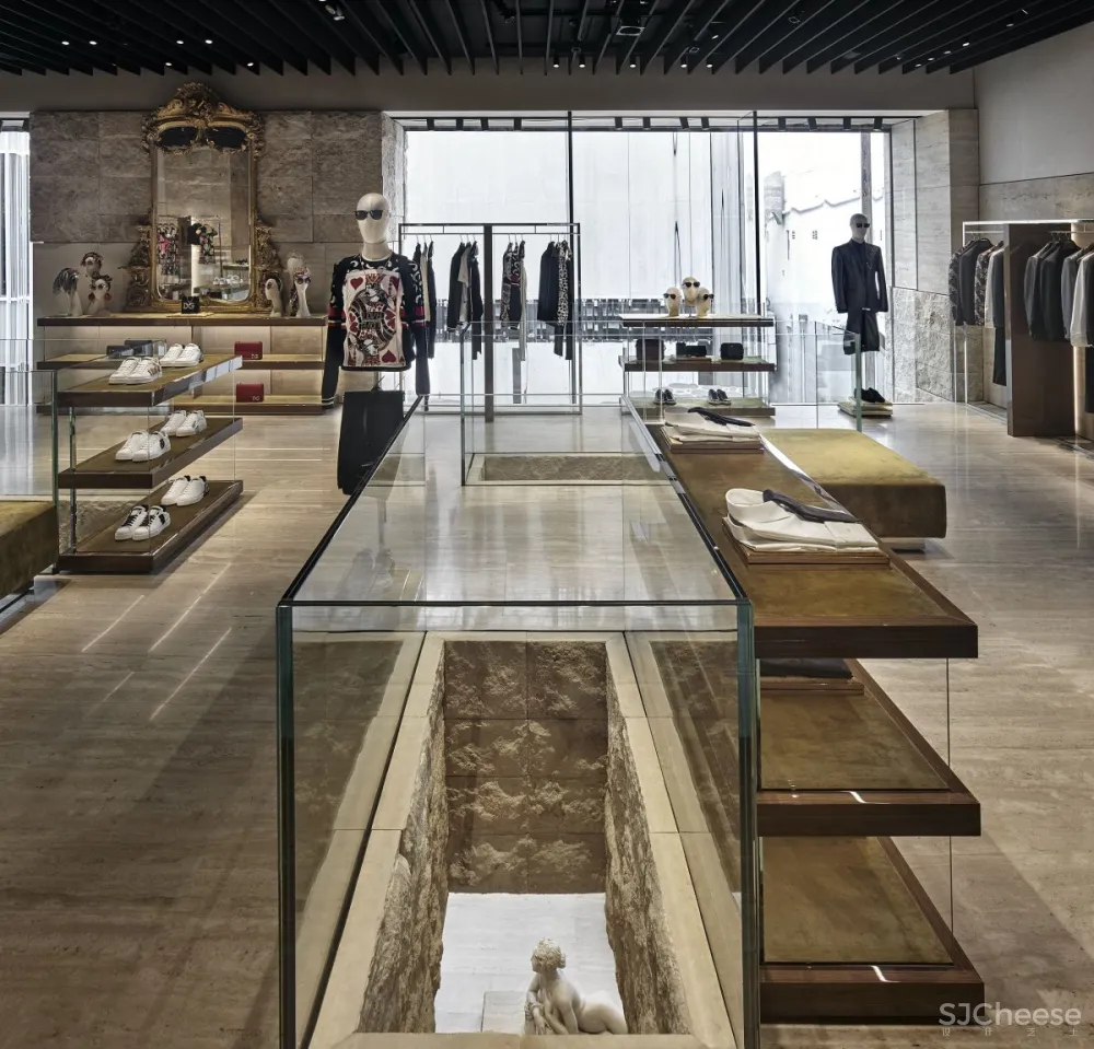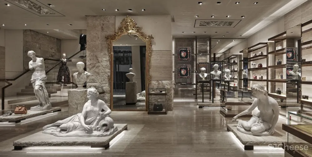 Dolce&Gabbana的“幕后”空间就像游客进入剧院一样。收藏品周围环绕着家具,配有巴洛克镜子,柜台和装饰有抛光钢或金丝绒的胡桃木家具。与透明玻璃展示柜和各种颜色的珍贵首饰相结合,整体设计让人联想到戏剧表演的整体设计。天花板配有聚光灯,照亮意大利制作的经典雕塑,歌剧或戏剧的装饰。