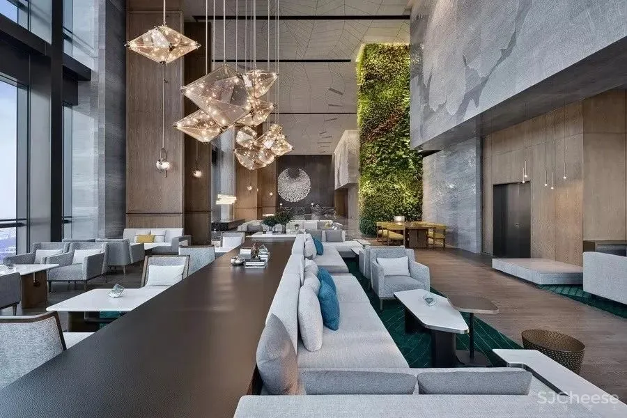 设计延续威斯汀自然休闲品牌特色,通过光、材质与色彩映衬,营造清新明快的空间基调,同时融入文化元素“灯”的不同形态,凸显艺术气息、烘托情感氛围。