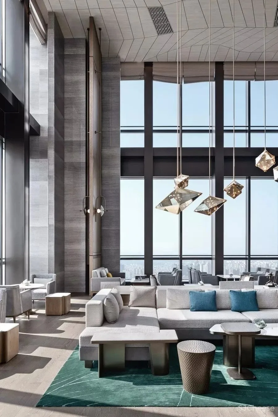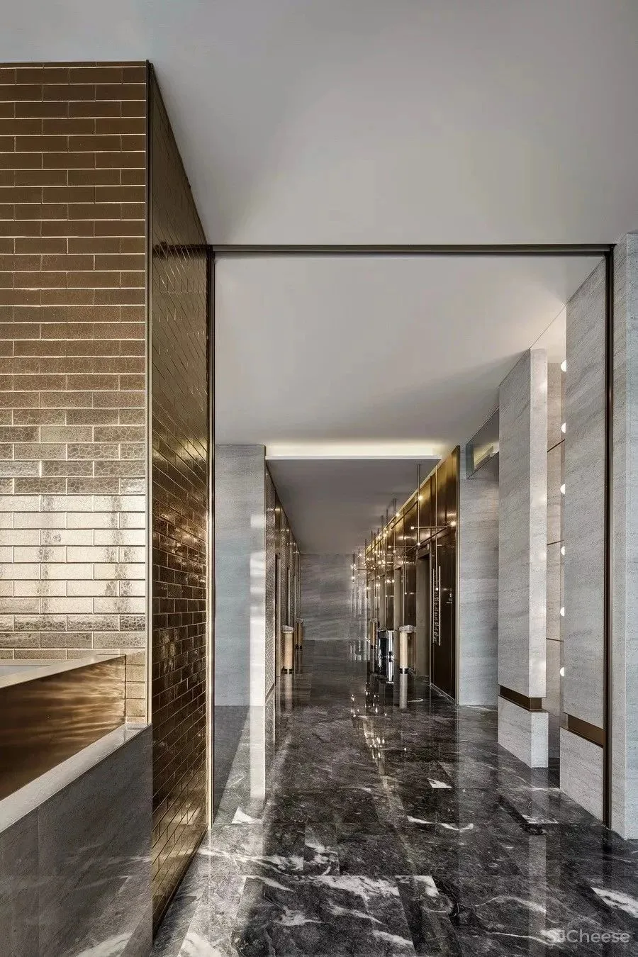 位于39楼的空中大堂,被YANG定义为“情绪过渡”空间。高级灰与原木色渲染出的深色调,有助于调节情绪,让宾客情感由外到内过渡至平和状态。
