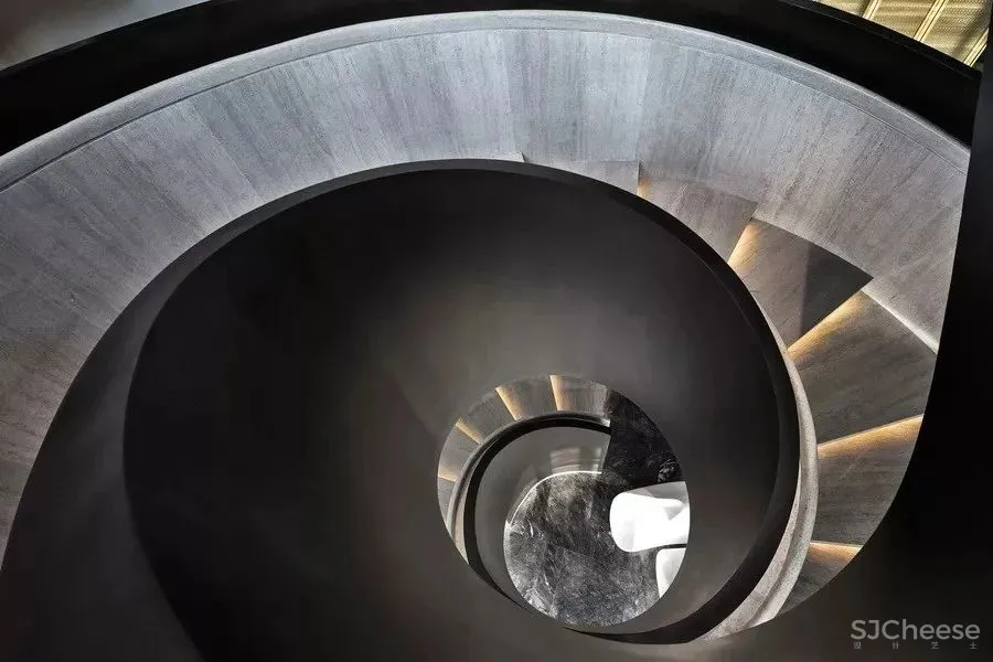 旋转楼梯优美的线条彰显空间的艺术张力,内侧石材与外侧金属表皮无缝拼接,时尚大气,也隐含灯体从古老石器到现代金属的巨大变化历程。