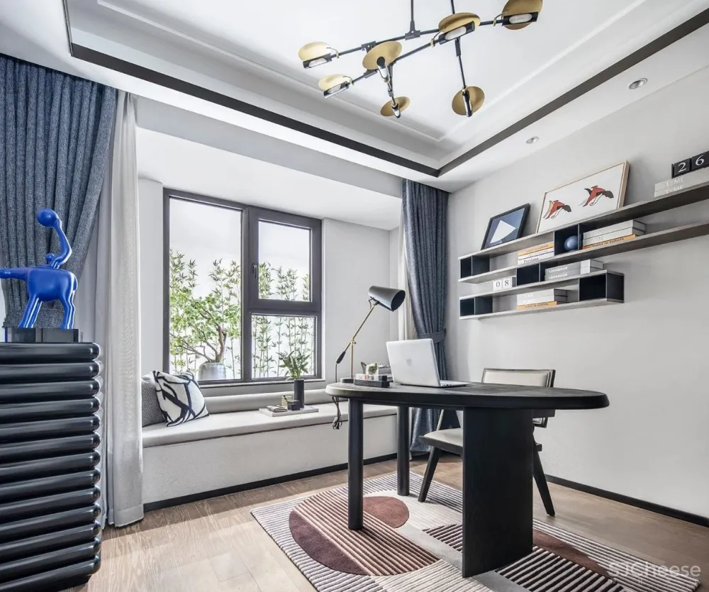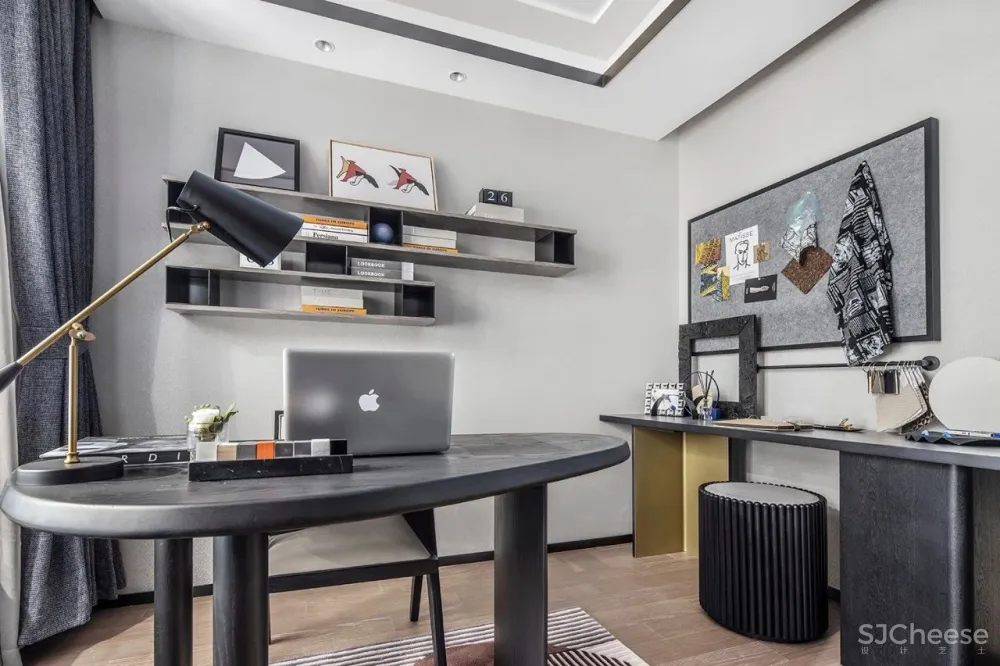 书房予以黑白灰现代感的空间基调,加入了红黄蓝的空间亮色,并通过不同的载体呈现出来,辅以曲面的造型线条,空间充满了质感韵律与艺术氛围,充分发挥了现代美学搭配的法则,并带来了视觉的平衡与美感。