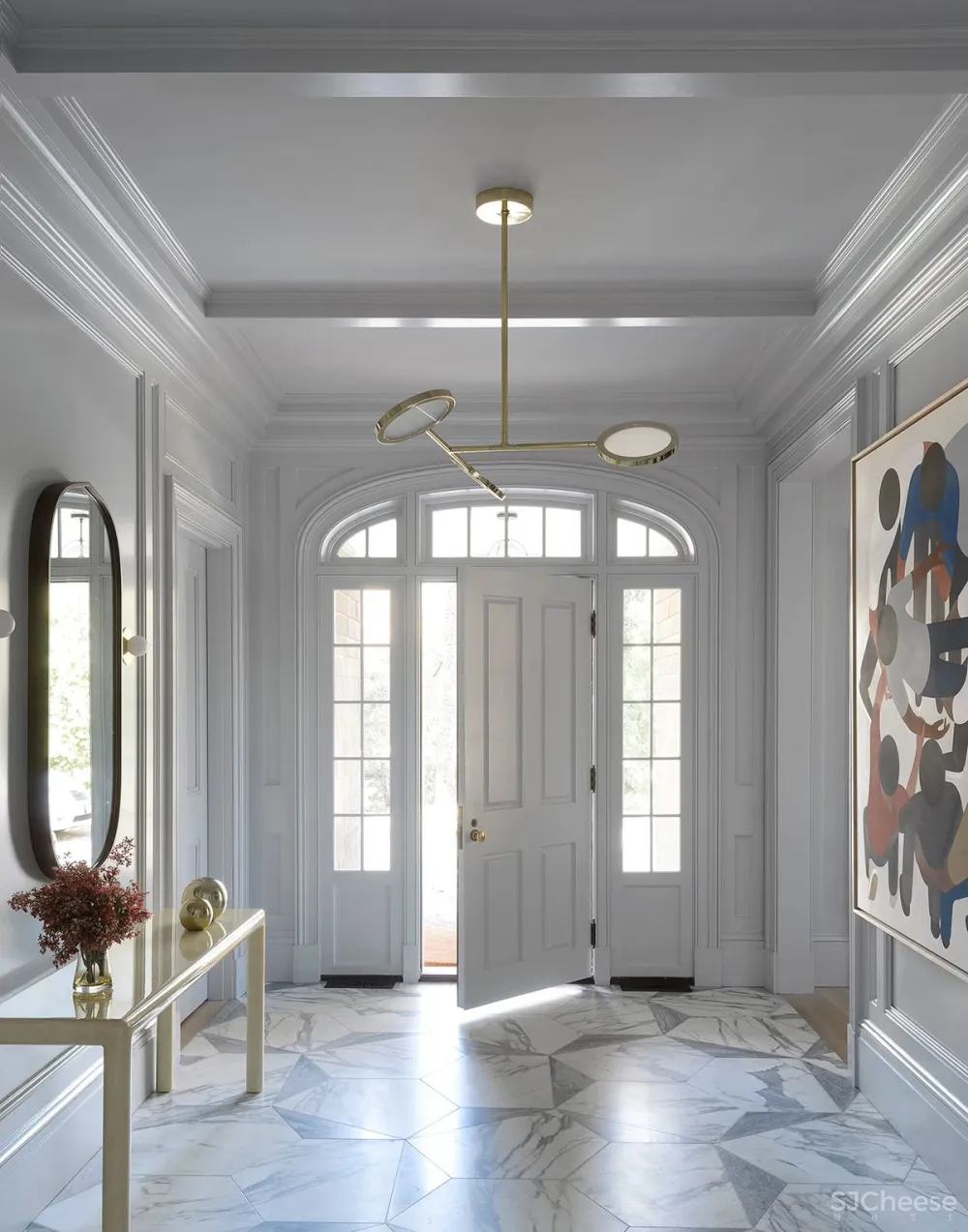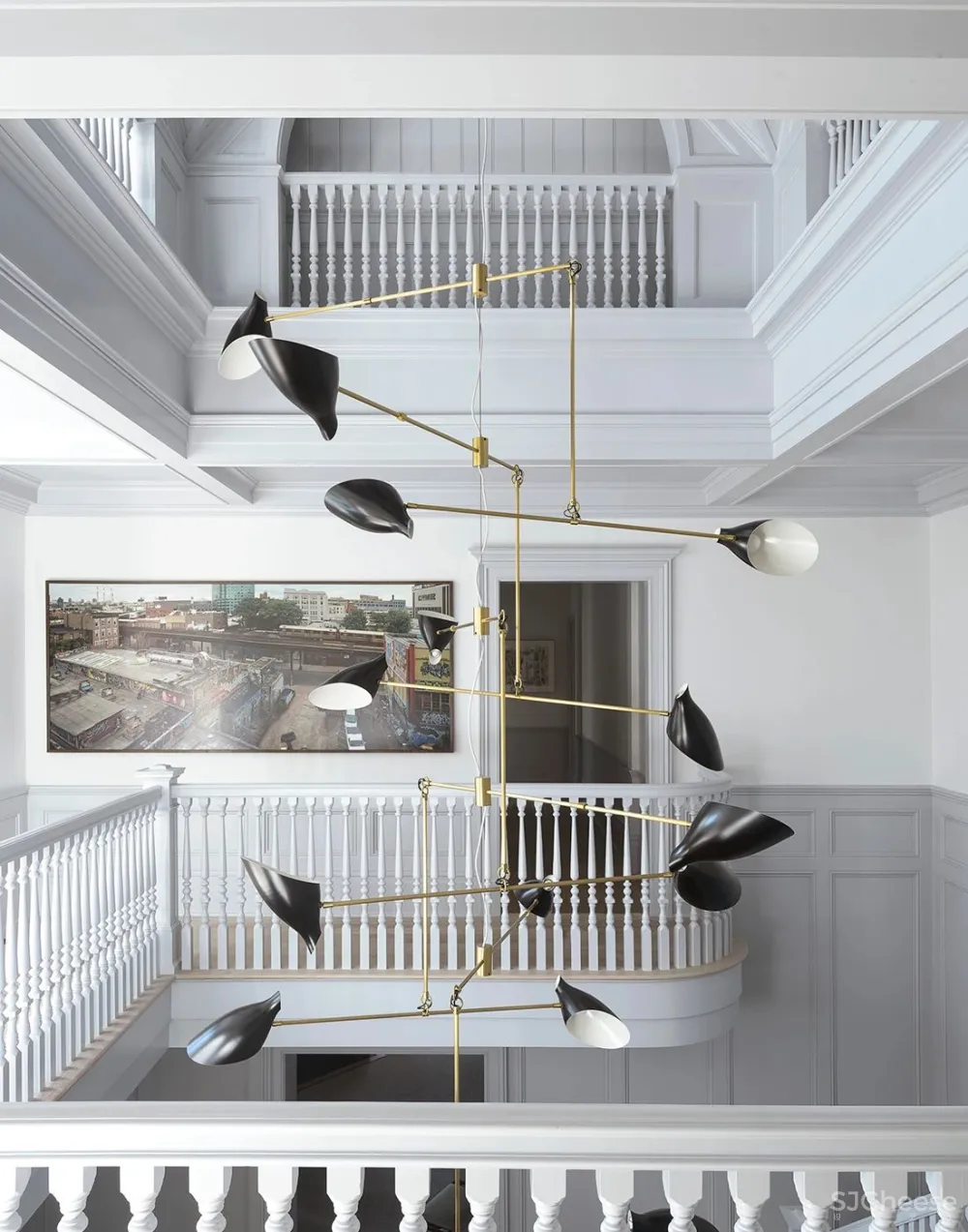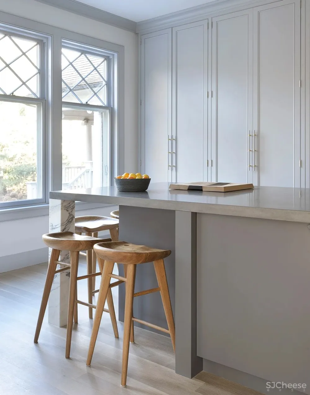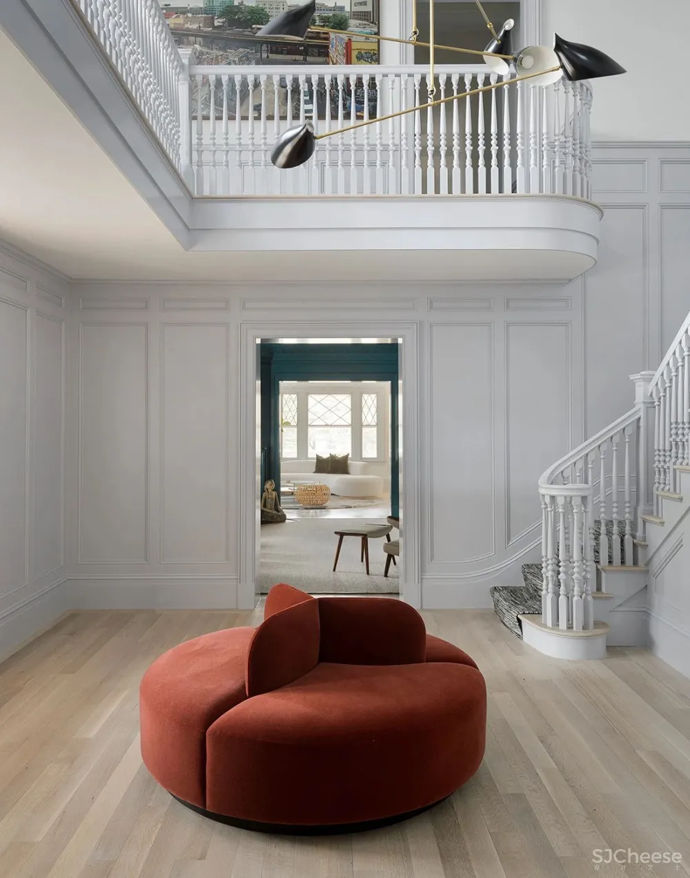David Weeks Studio的移动灯具为住宅的楼梯间增添了现代感。就像在厨房一样,黄铜特征为柔和的灰色内饰增添了温暖感。