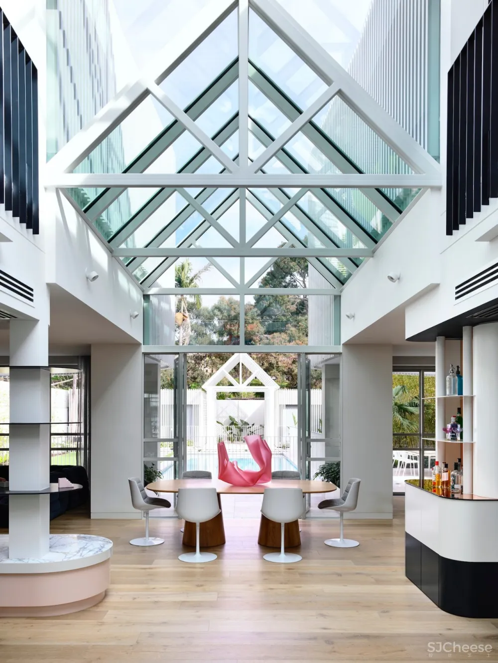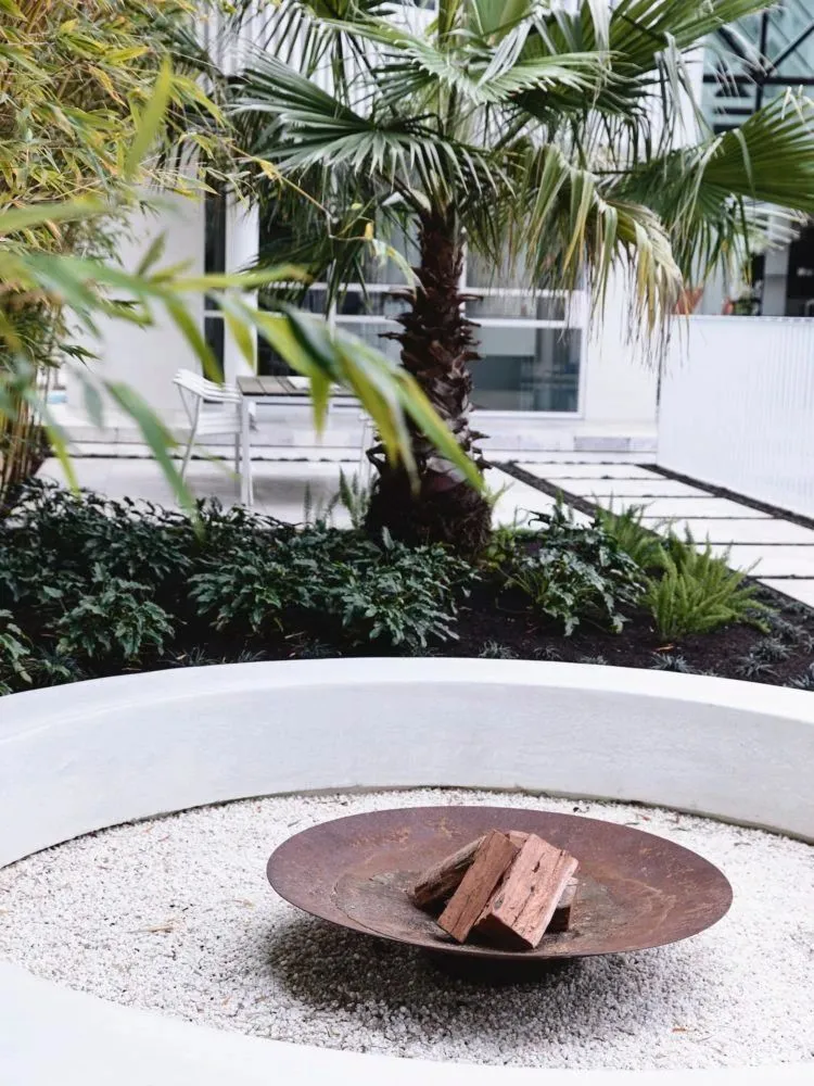 紧密结合的设计叙事延续了落地窗和门的设计,使娱乐者可以轻松地流向室外区域。室外区域包括下沉式对话和火坑,茂密的热带植物以及景观设计师本·斯科特(Ben Scott)营造的森林般的竹叶,Caleb Shea的大胆橘红色几何雕塑为草坪增添了动感元素。