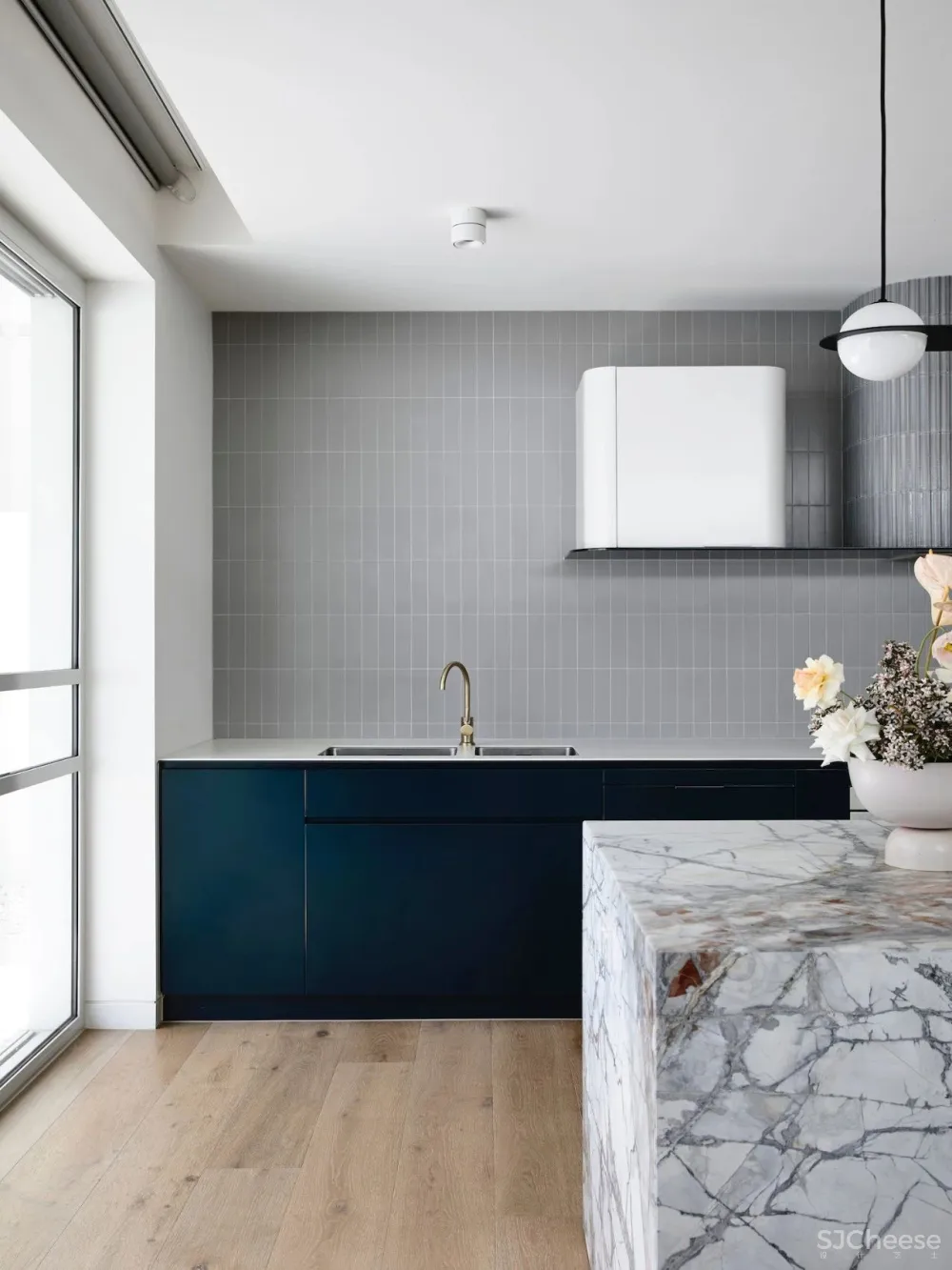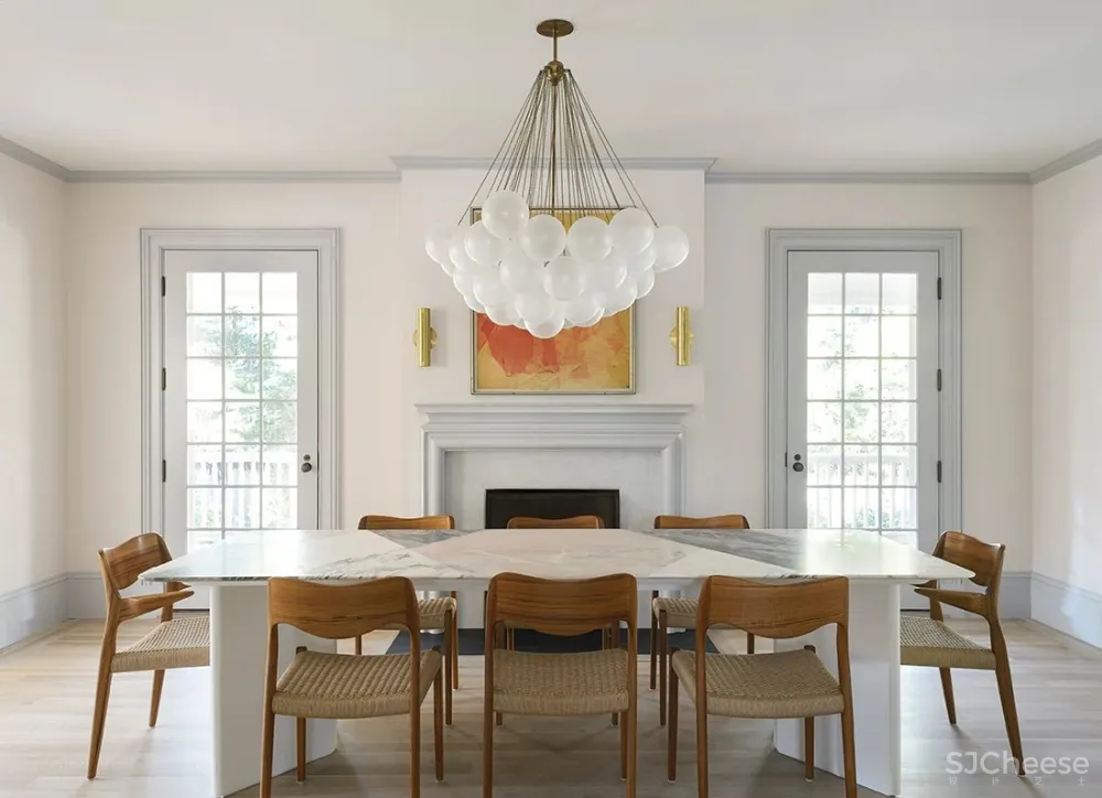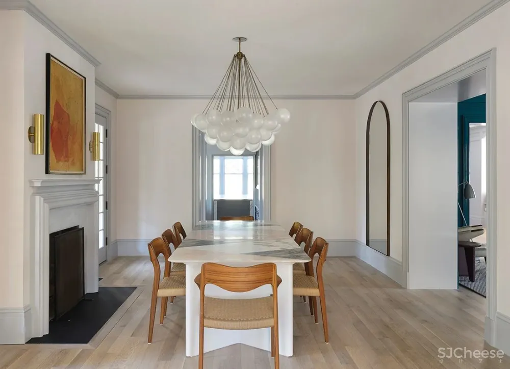Apparatus的Cloud Chandelier(云形枝形吊灯)对餐厅产生了异想天开的效果,它具有手工磨砂玻璃球,可营造出独特的漫射照明效果。同时,在上方的房间中,厨房由灰色调的橱柜和白色大理石后挡板的精致融合所定义,是温暖的黄铜水龙头和把手的理想背景。