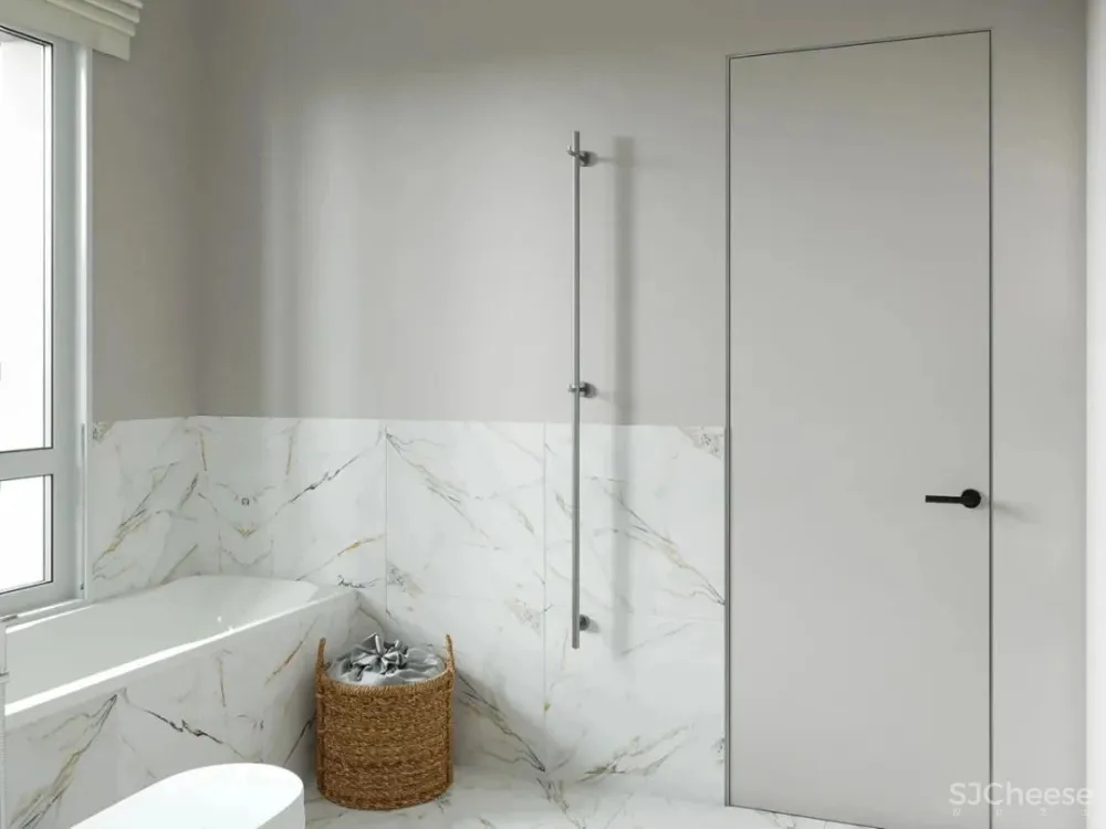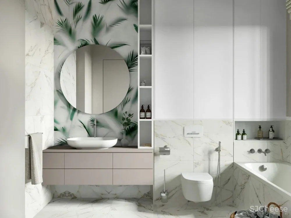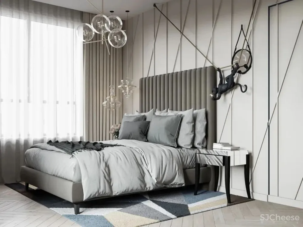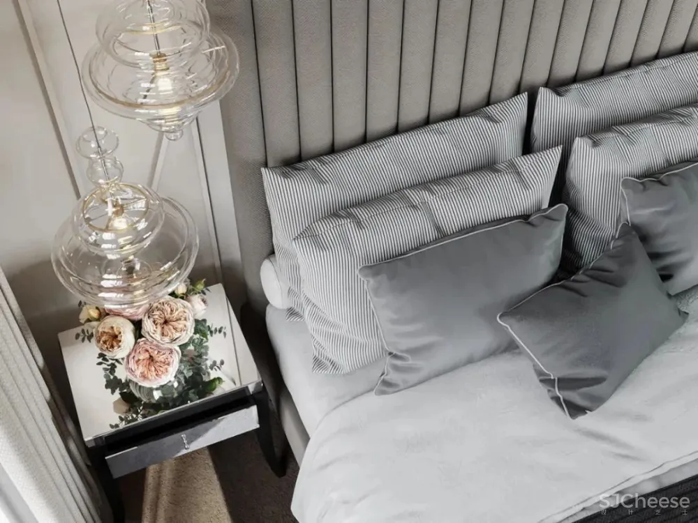 主卧色调柔和给人舒适的感觉,床头的几何圆形吊灯给整体添加了几分温柔。鲜花给空间带来了自然,生机勃勃的气息。