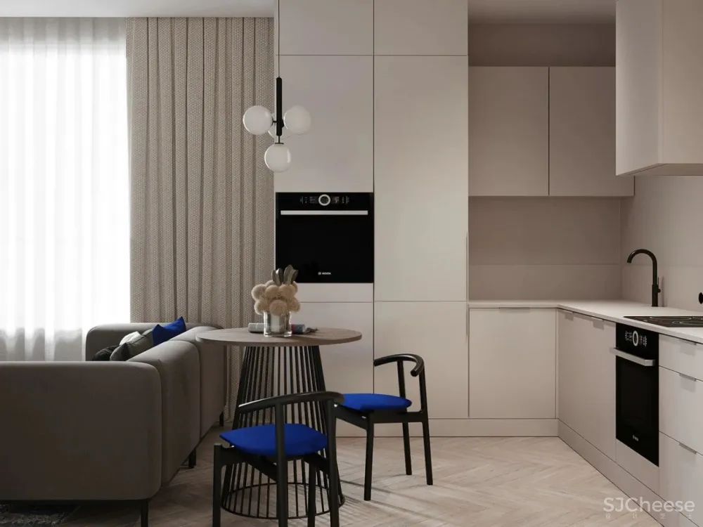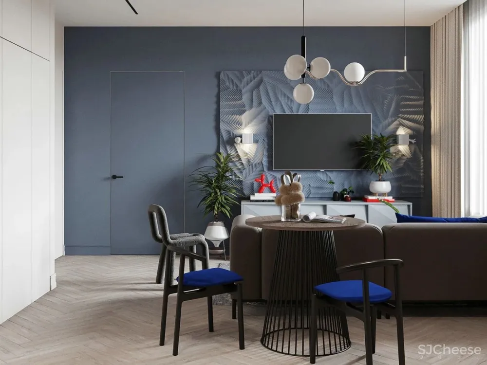 开放式客,餐厅是空间更加宽阔,敞亮。整体色调选用高级灰做基调,经典蓝做点缀使空间更加绚丽优雅,透露出女性特有的知性美。