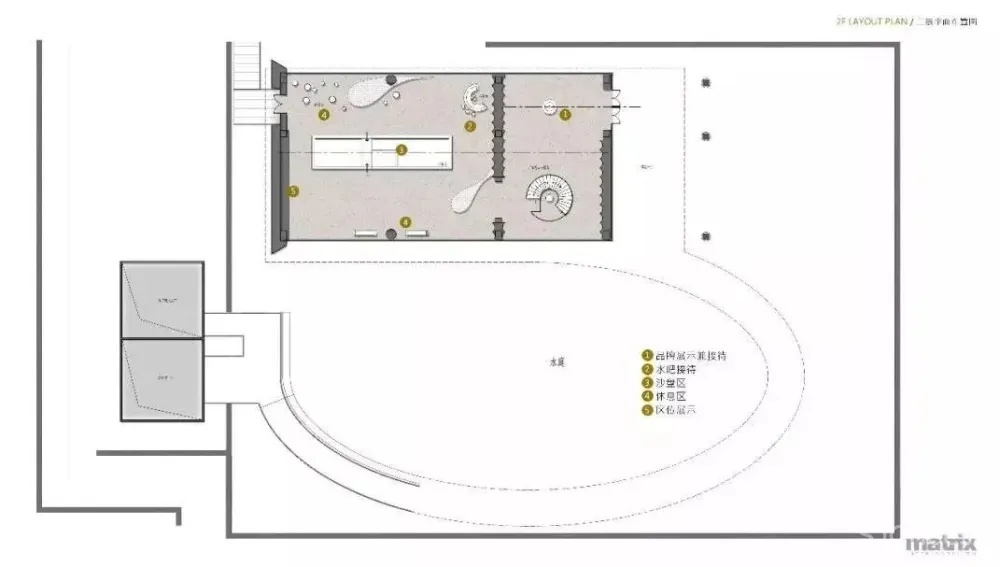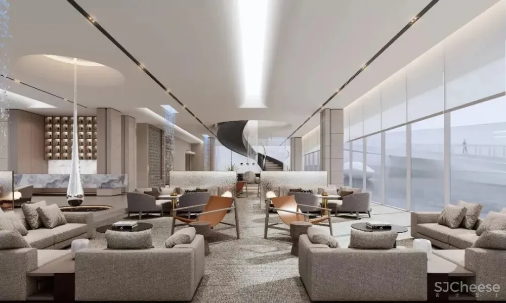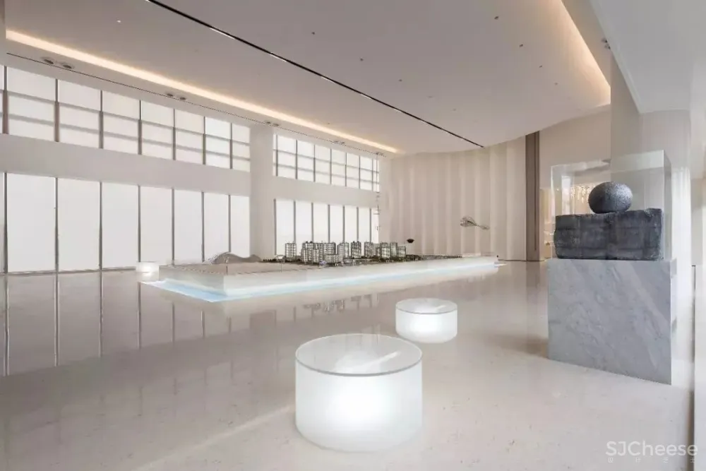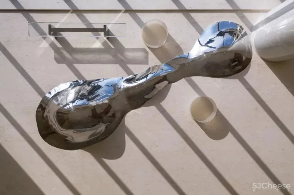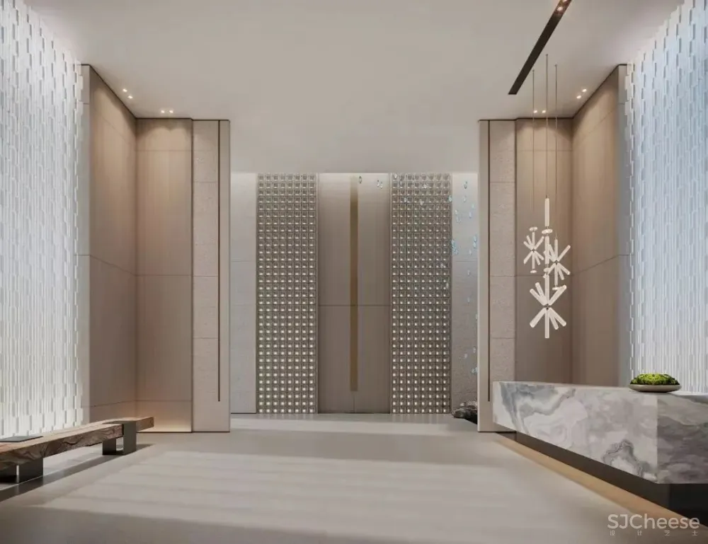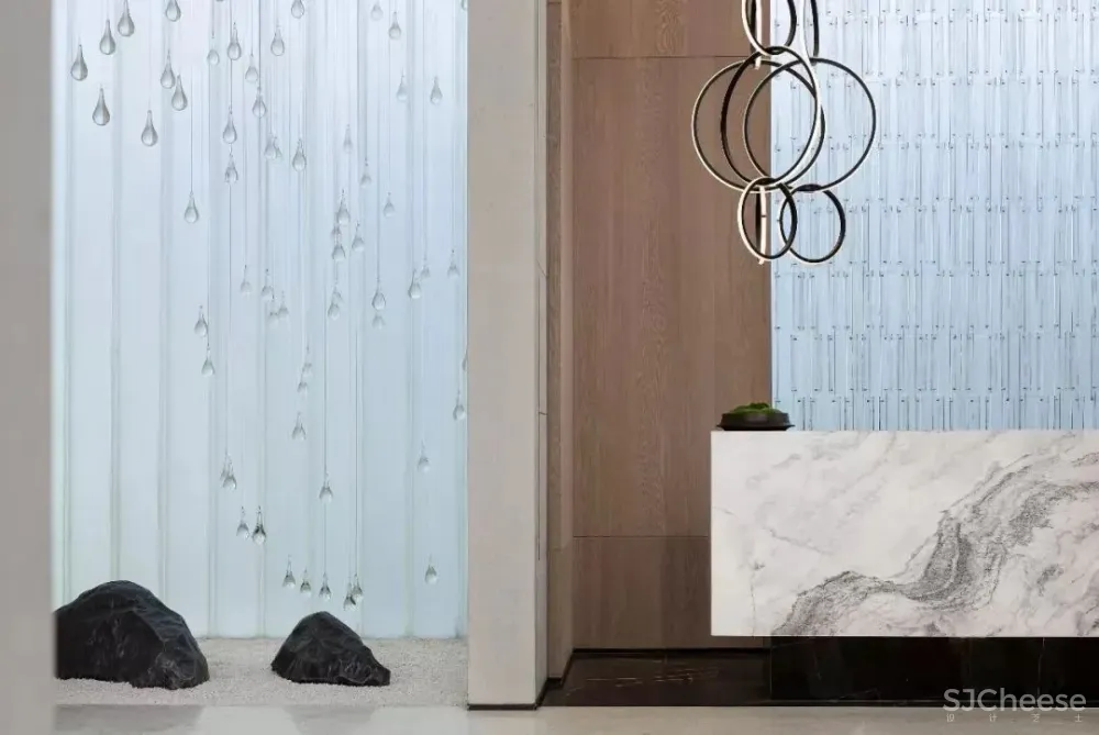 “水”贯穿是建筑、景观、室内的主题元素,设计也将“水”引入到了室内空间。洽谈区中心的艺术装置绝对是空间中亮眼吸睛的存在,在地面上用黑色水纹面石材造出一汪池水,天花则有一滴自上而下仿佛要滴入池中的水滴的艺术装置,大大的水滴,小小的池,悬殊的差异感让空间瞬间变得生动有趣。