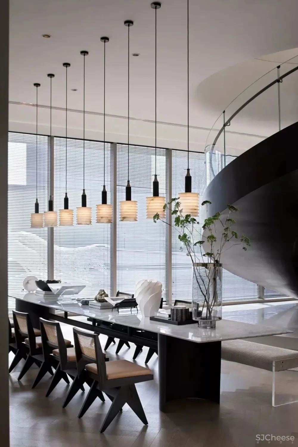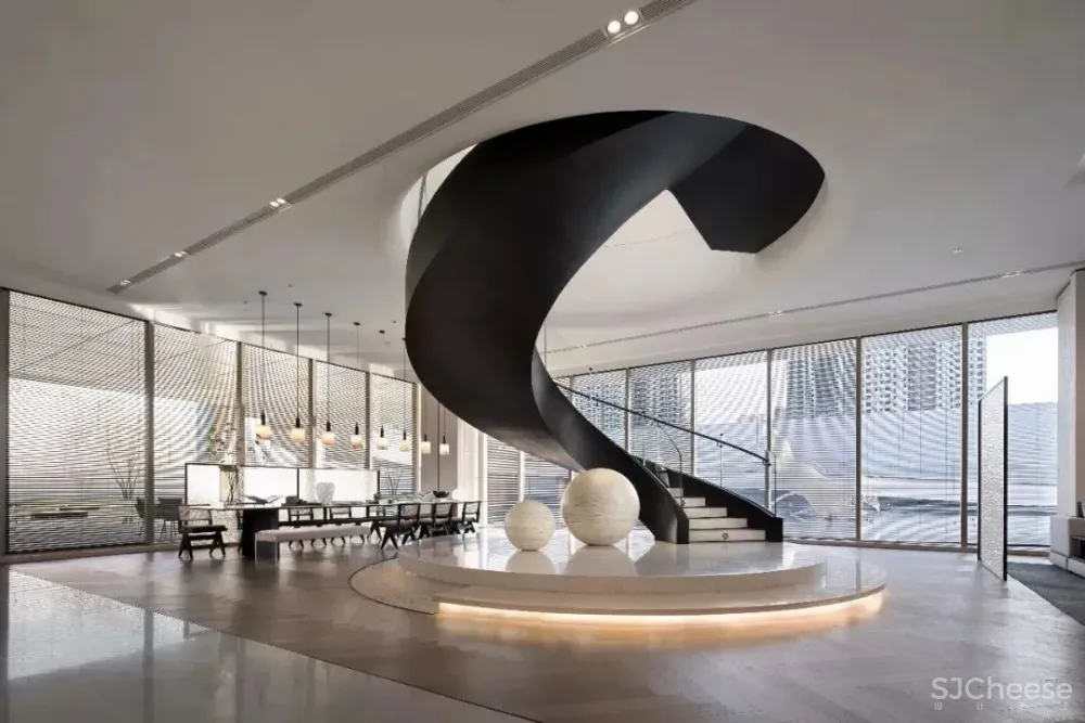 旋转扶梯一直是Matrix在设计中有独特表现之处。在洽谈区空间范围内,它不仅仅是楼层之间的连接,更是空间中不可多得的装饰。磨砂黑色的旋梯以恰到好处的角度顺势而上,在空间内任一角度欣赏都是一幅现代艺术画,下方的一大一小大理石球则让整体造型不显空白,设计的细腻独到由此而现。