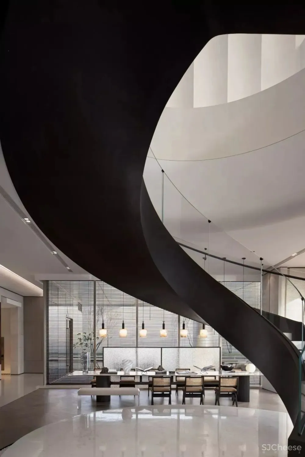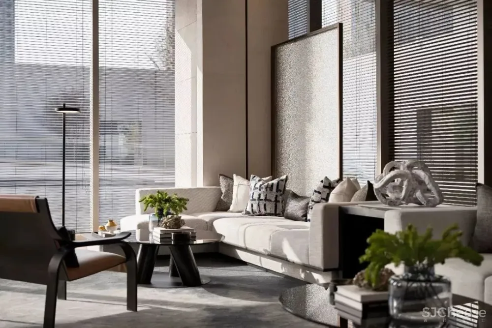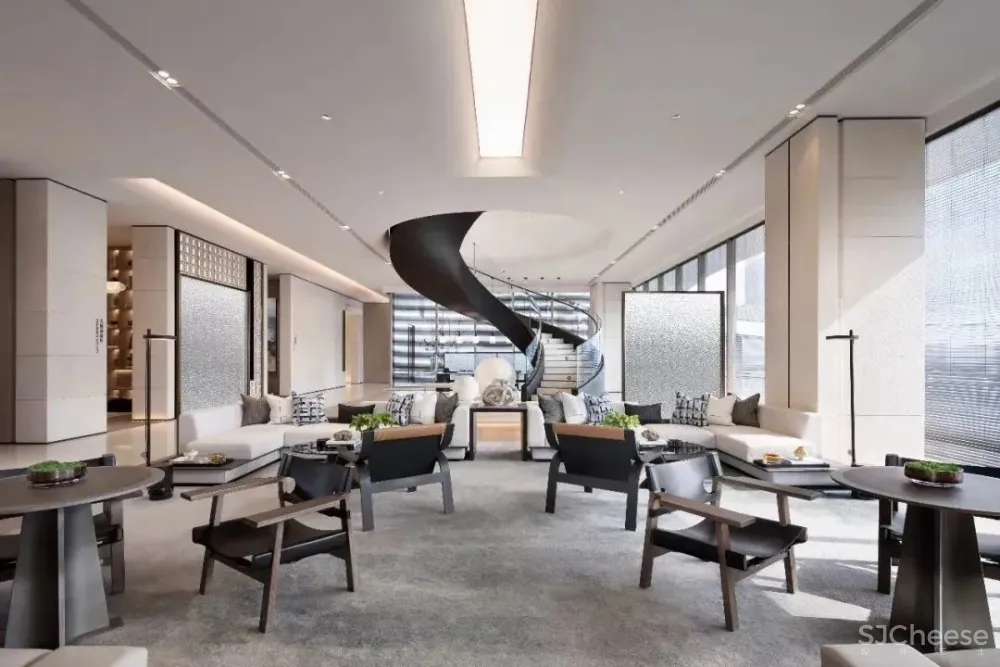 在古典与现代间优雅穿行。建筑、景观到室内,紫阙台不疾不徐地诉说着对现代极简的追求,巨大的镜面水景与建筑删繁就简的现代立面相交融。室内设计中,顺着建筑的形态与空间关系,我们对空间布局进行了有序而灵活的梳理,呈现出功能与气质浑然一体的设计,灵动且静谧。建筑内外一齐迸发出紫阙台独一无二的灵感之光,每一步都感受到空间美学艺术带来的斐然享受。