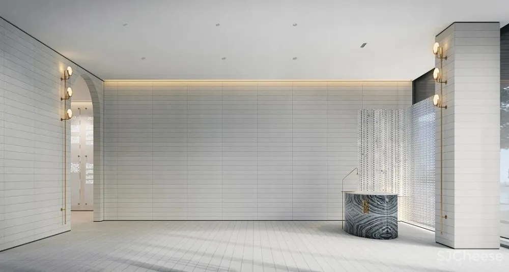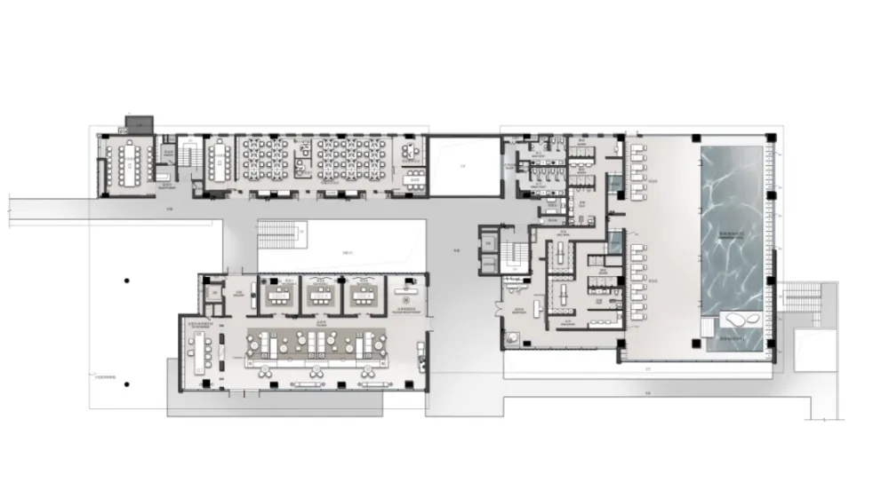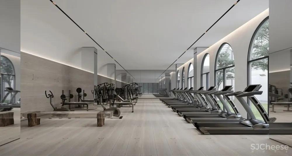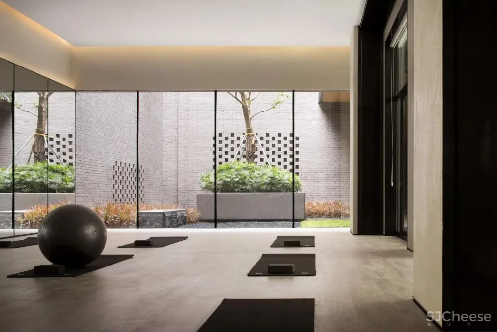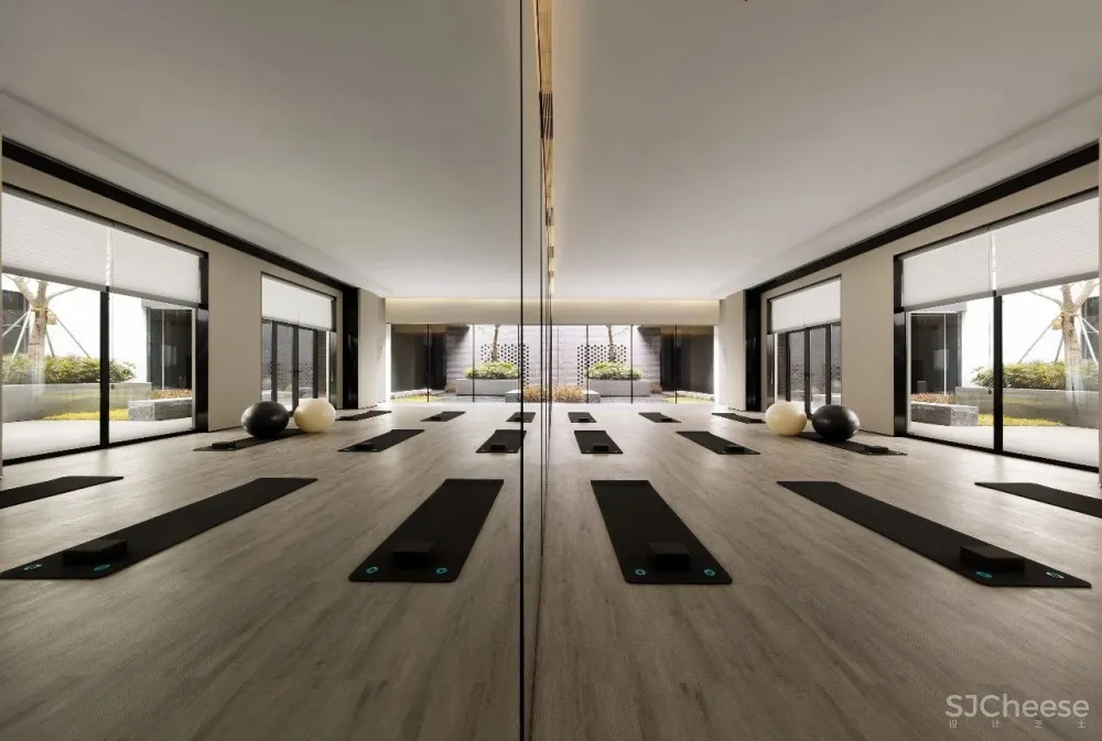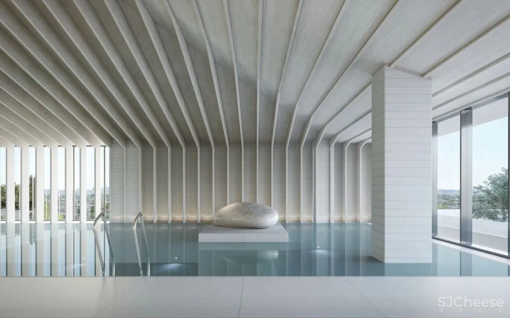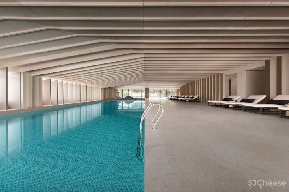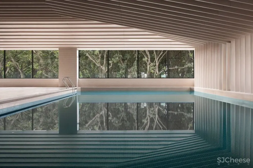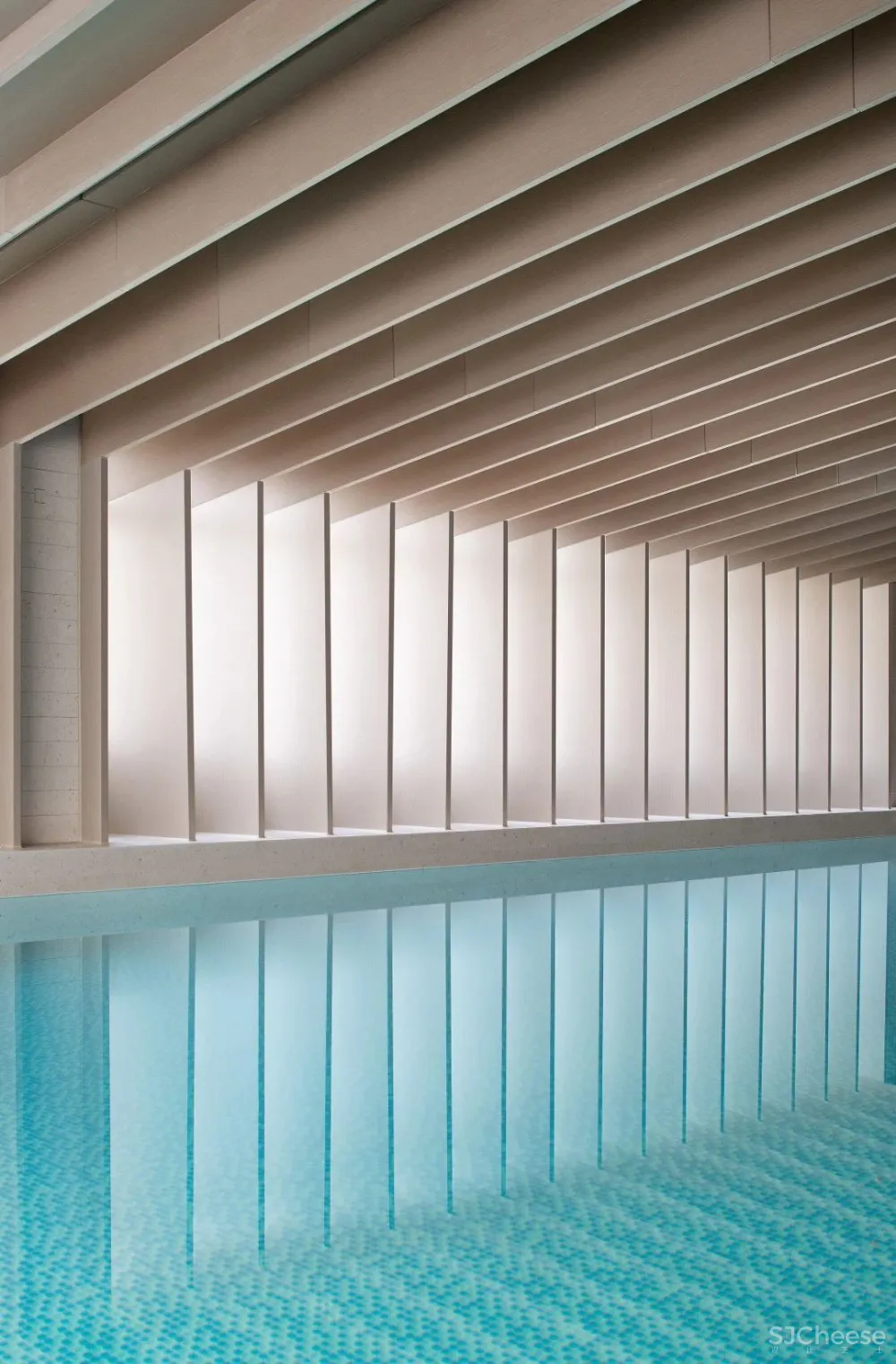 會所泳池等健身區,設計關注人與空間的延續性、互動性,運用純淨、抽象、幾何的藝術語彙,在極簡的佈局中融入了別具一格的美學,為空間中的人們營造一個以理性、秩序、功能性為核心的放鬆地帶,沉靜中見簡雅。