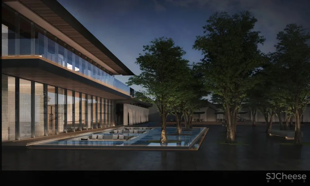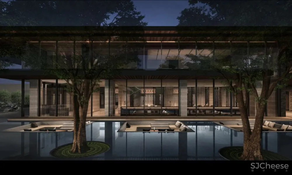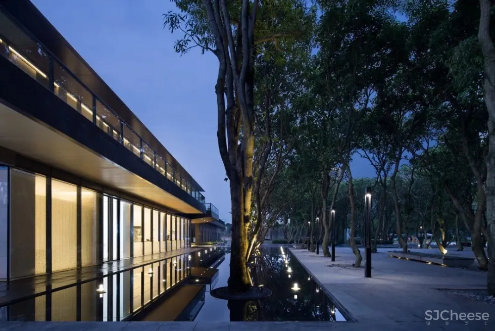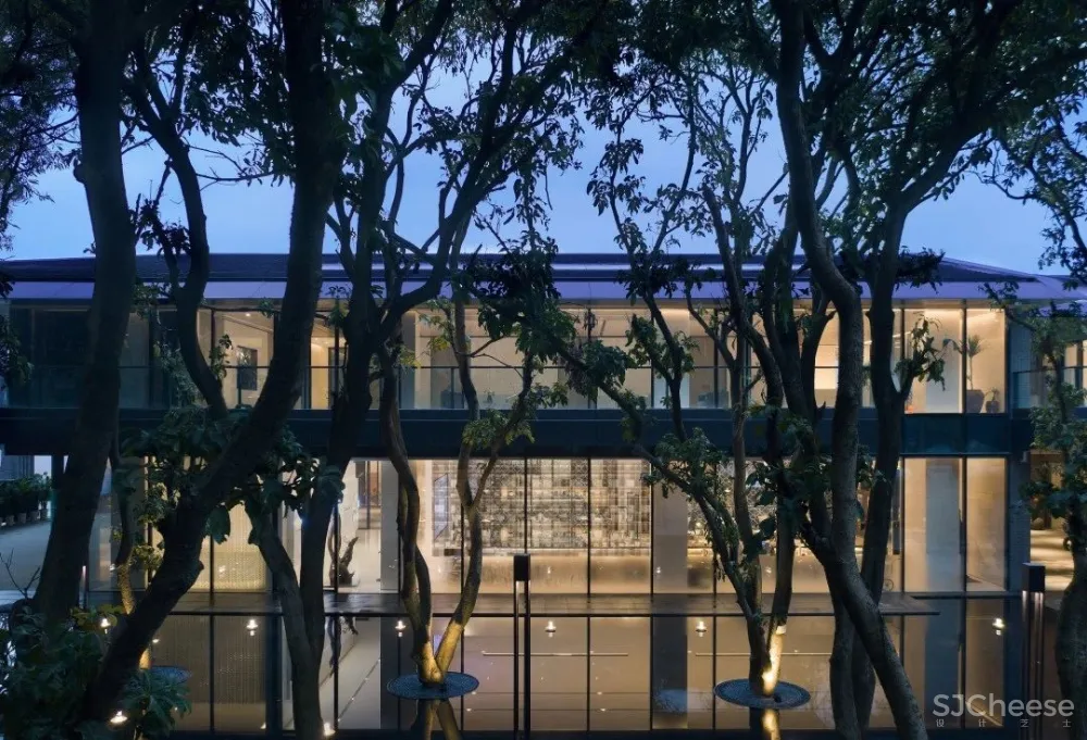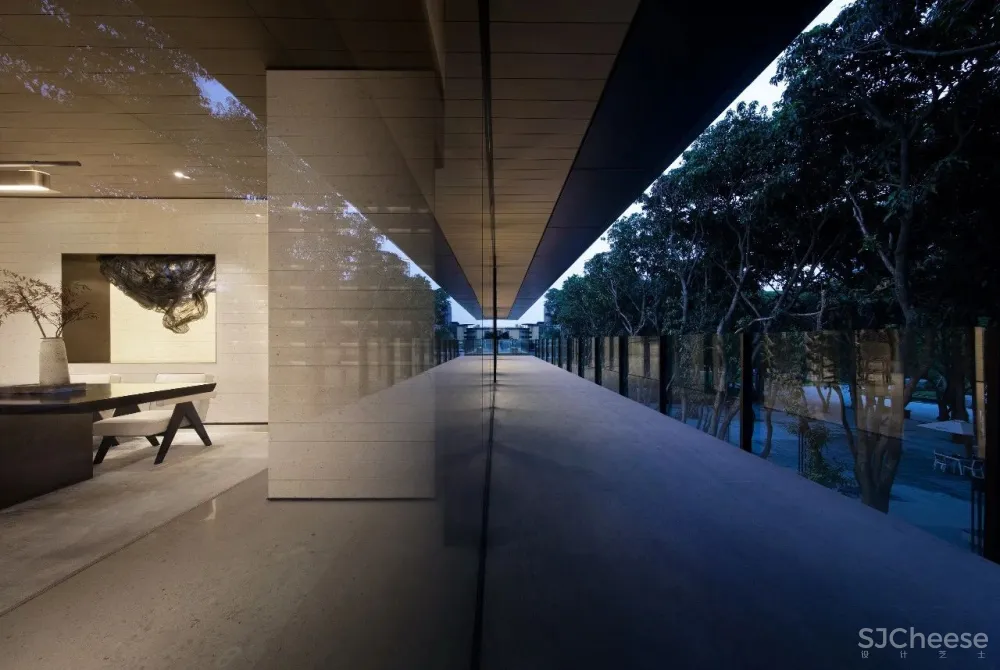 矩陣縱橫主導的西園會所以極簡主義風格為基礎,加入木、陶瓷、亞麻、石頭這些自然材質打造出樸素簡單的含蓄內斂的雅致空間。室內設計將傳統文化元素與現代手法有機結合,比如傳統山水藝術畫、書法藝術裝置與白色的大理石地面、牆面,與高低變化的白色屋頂相互映襯。