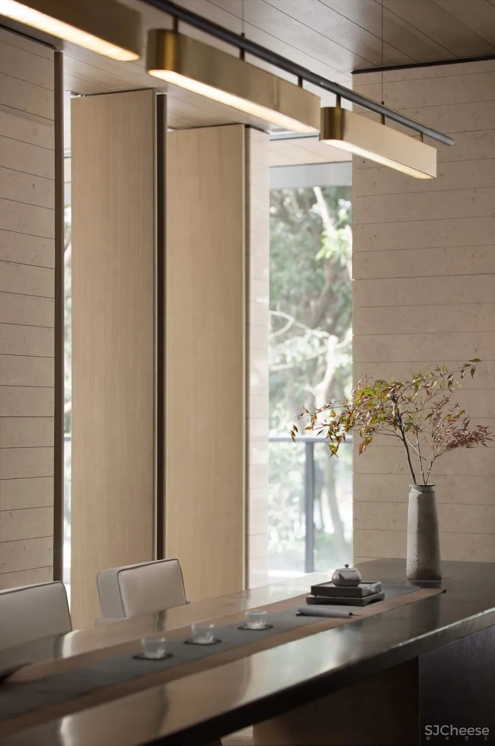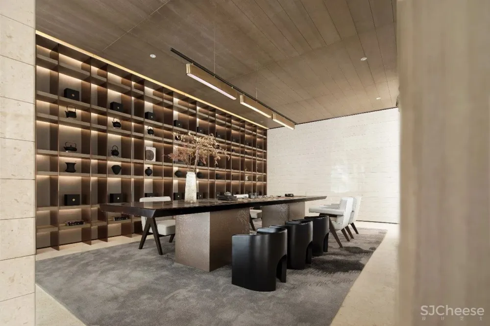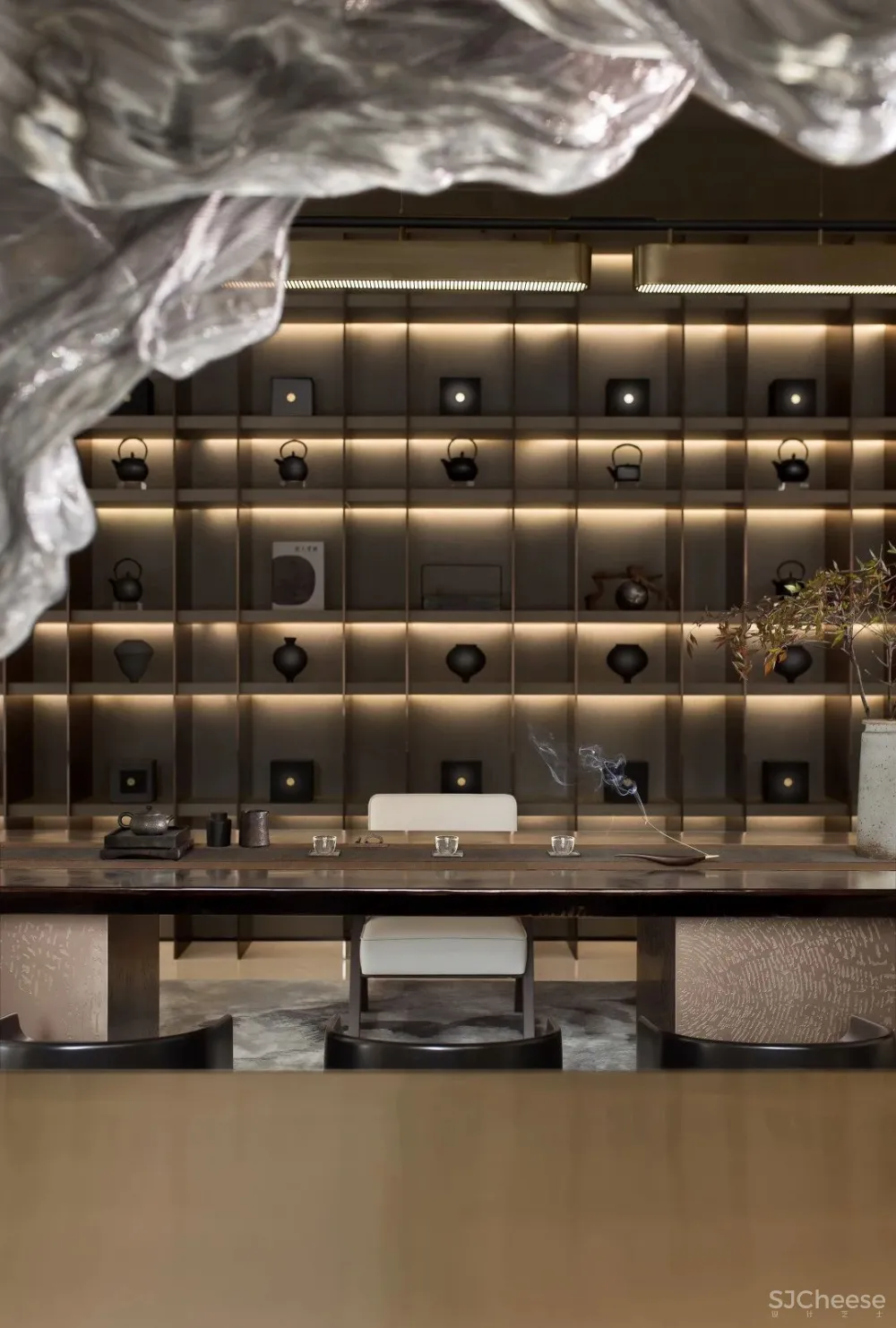 會所的茶吧也是西園項目室內規劃中獨特的一處。設計將茶館這個千年前的翰墨書香與文人雅士的生活場景與當代生活中的茶水休閒吧交疊、相合,營造一個空靈高雅的現代空間,構建文蘊綿長的精神棲居地,以此來輝映整個西園項目大氣的城脈格局。
