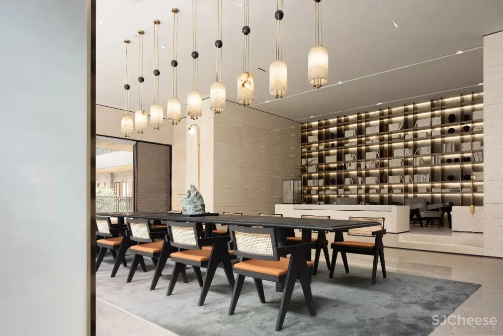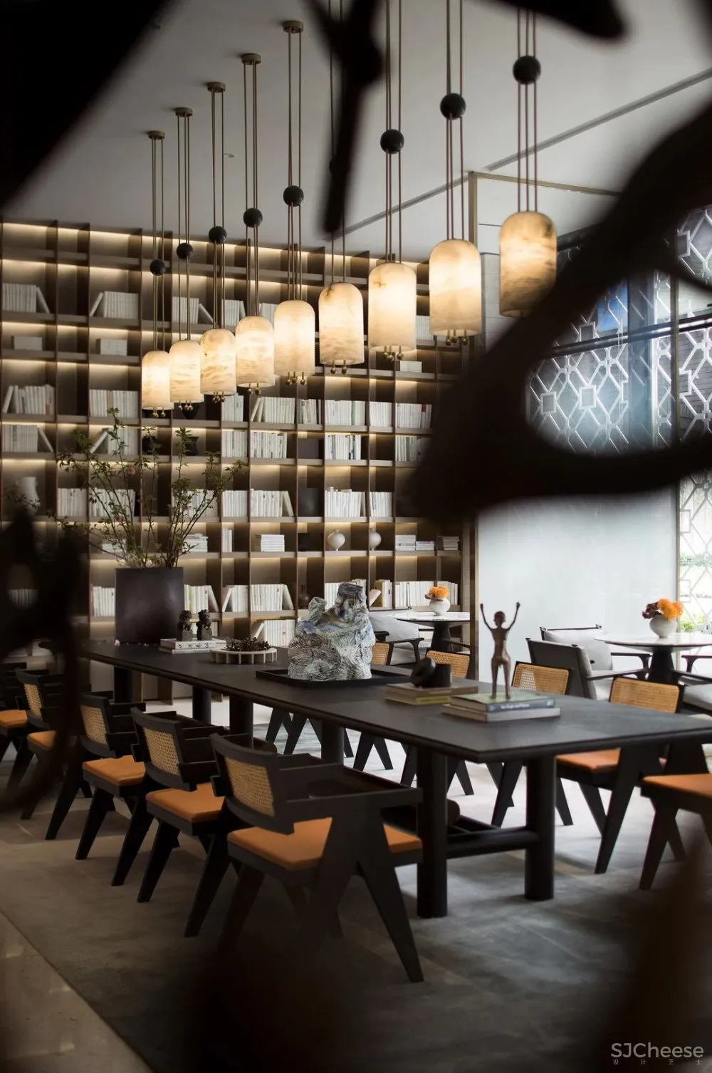 正面靠牆與左側凸進的一扇牆面作為整面書架,讓書吧的功能發揮最大化,中央放置長桌與座椅,兩側皆為沙發閱讀區。從天花垂下的行書字體藝術裝置與金屬的組合燈飾形成傳統與現代的藝術對話。墨綠的地毯、桌上的綠植與室外的流水、花園景觀締結成自然的延續。