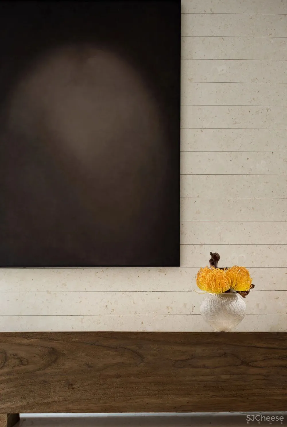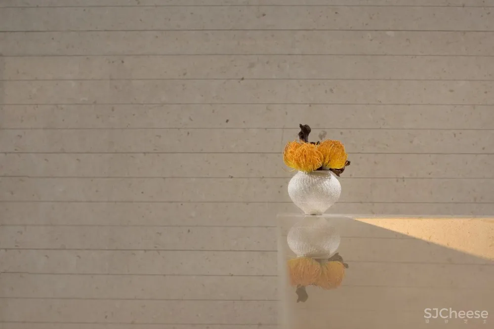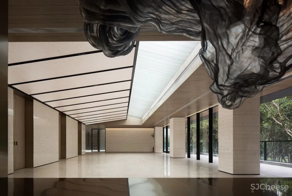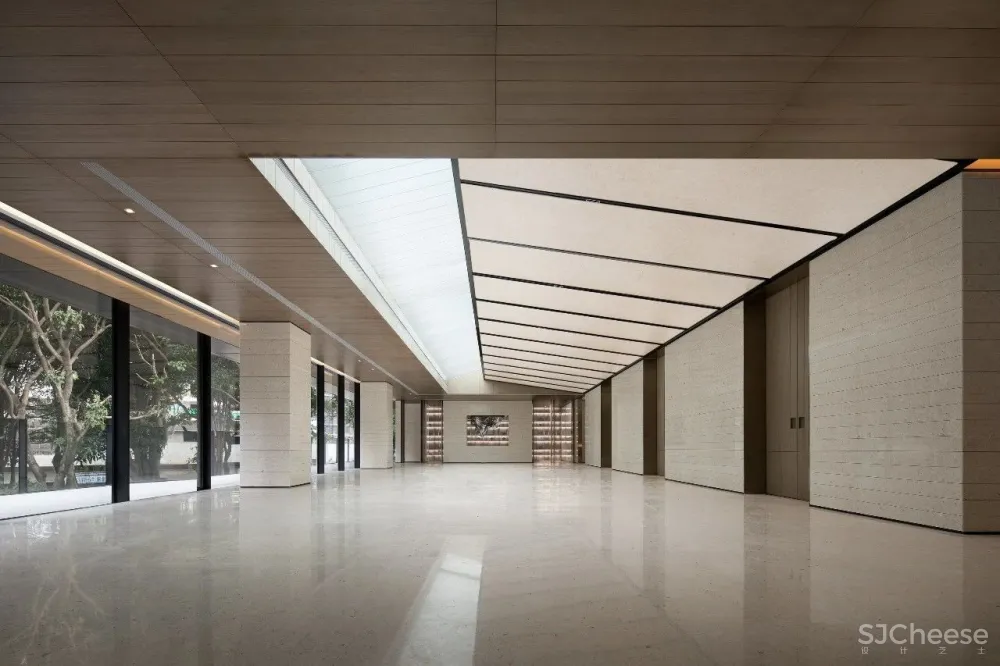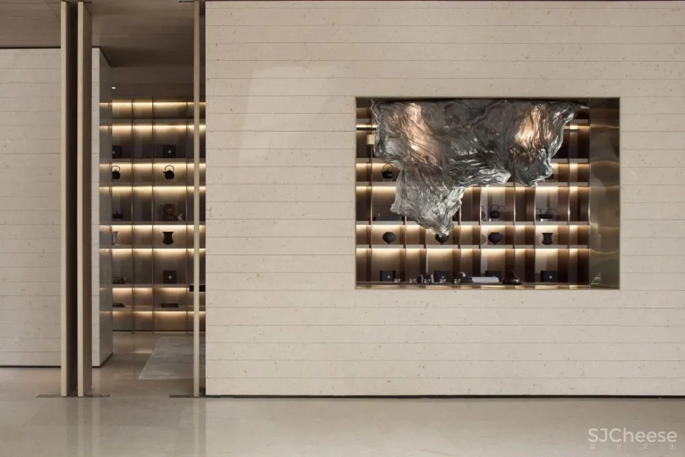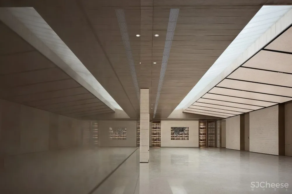 藝術展廳的設計非常注重空間序列,用線條、體塊、光感塑造空間的延續感,將人的視線聚焦在後端的藝術造景上。
