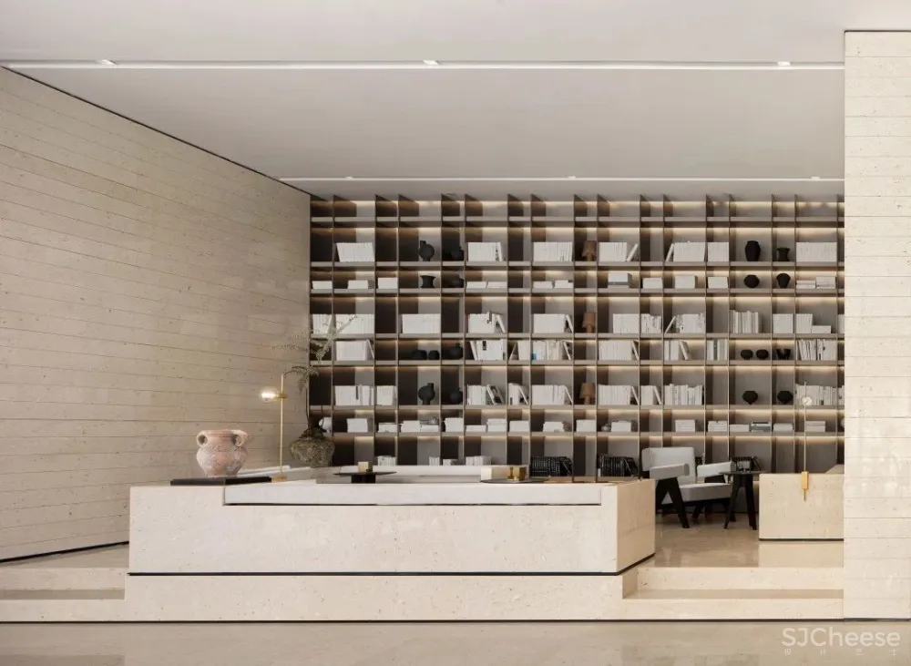 設計凸顯中國山水畫中“留白”的技法,不僅從色調上沿用白色米色系,座椅區與沙發區疏密相間,端景以中國造園手法做借景展示。