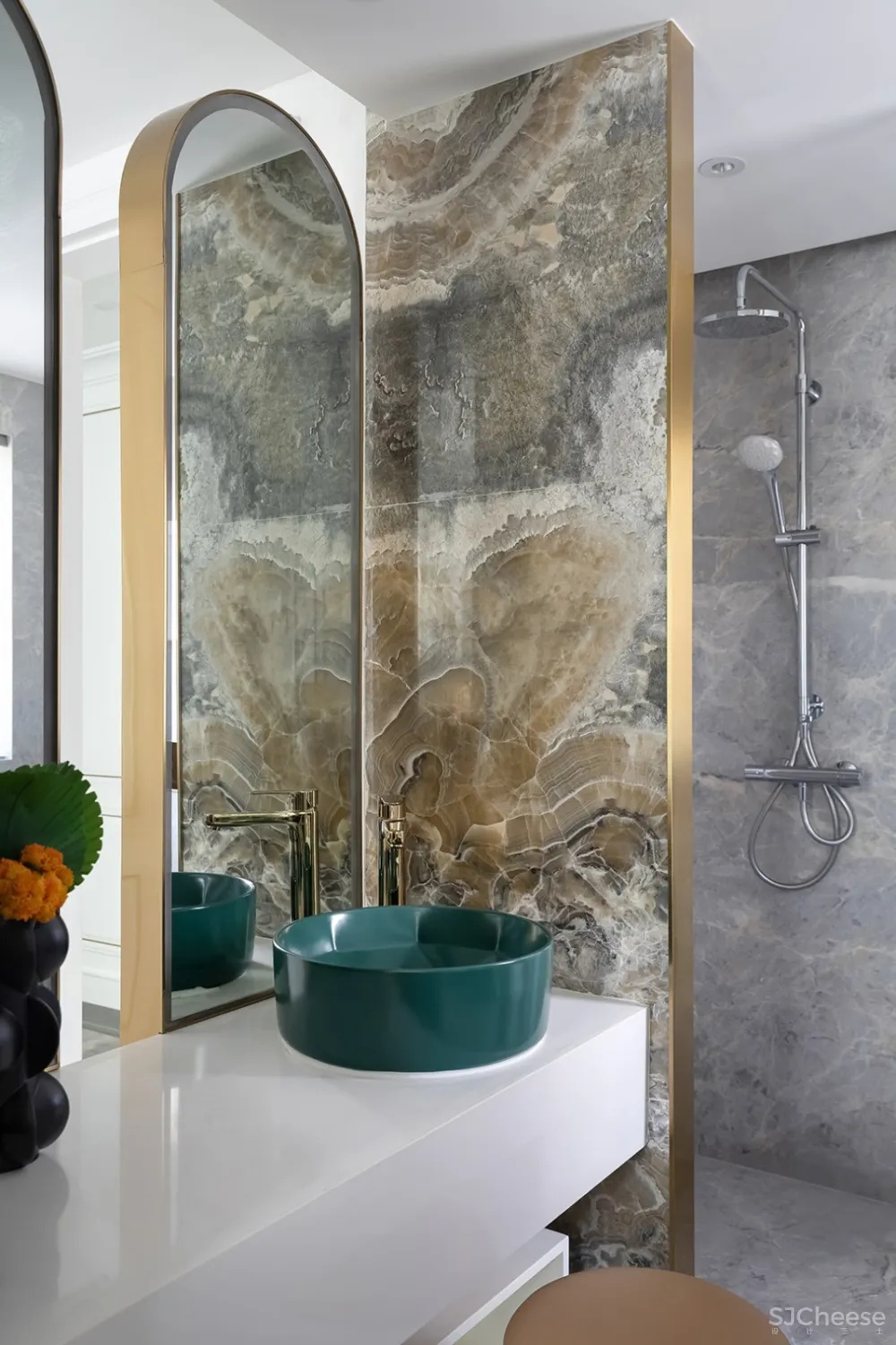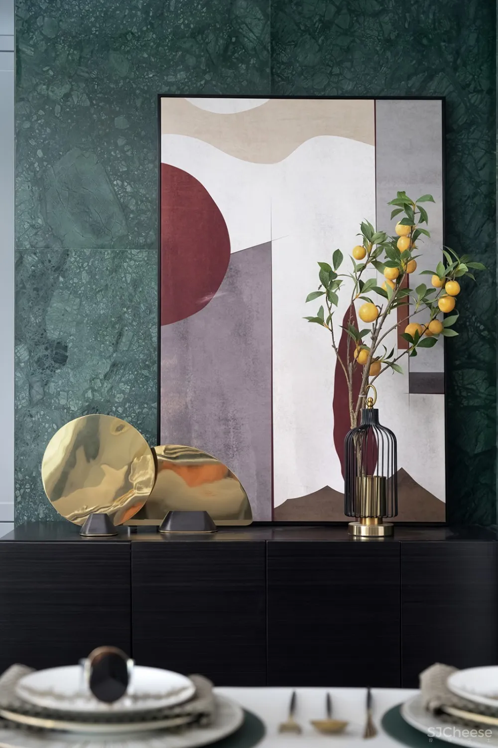 当不必要的冗赘一消散,生活自然也清晰而有味。用餐区借精致宫廷风餐具与现代审美视角下的 椅,勾勒出生活的质感和品位,现代风格家具形成混搭空间的效果,室顶的金铜质灯饰,以色块拼 接方式呈现的一幅视觉的艺术“源点”。