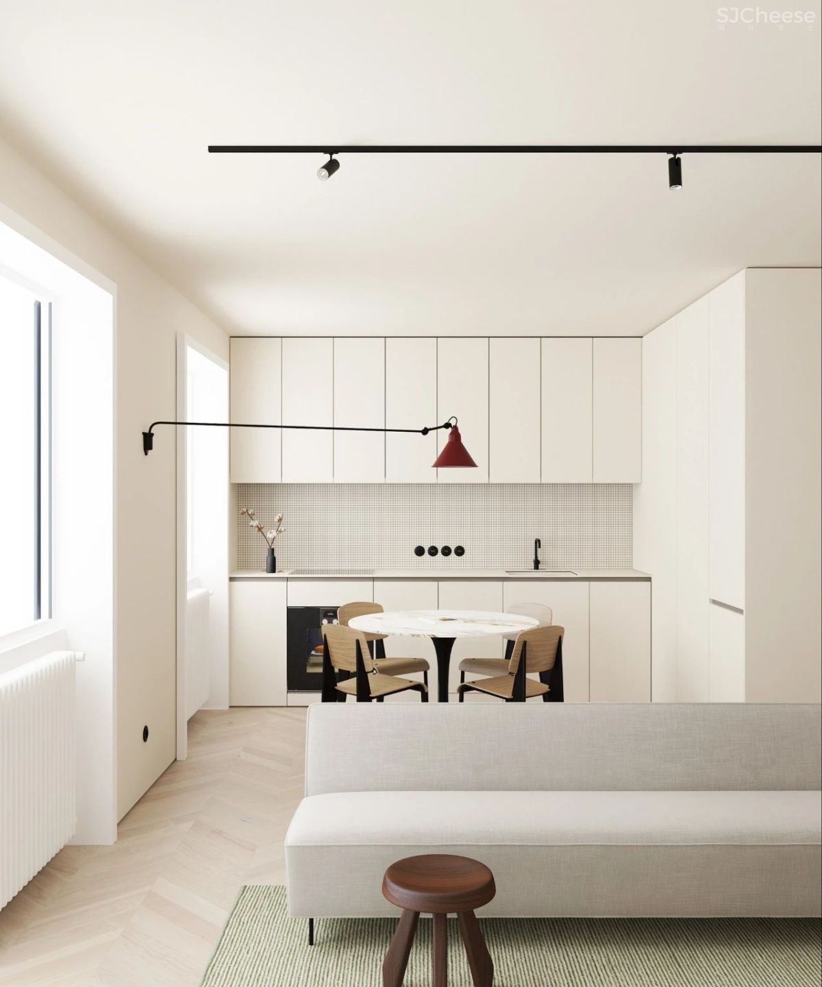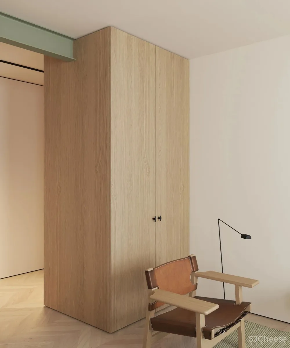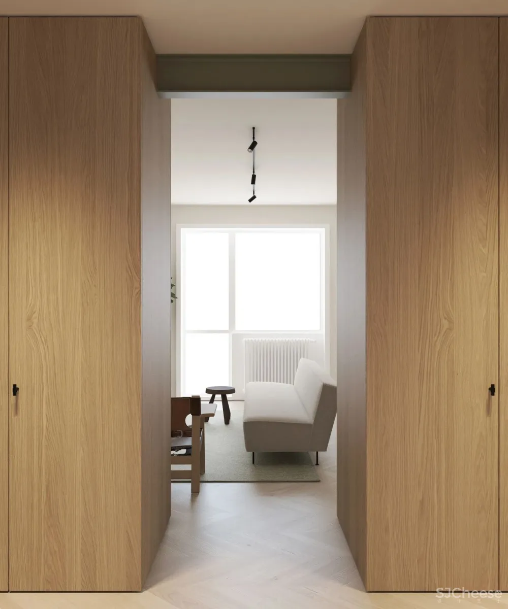 这个项目只有106平方米,建筑设计由Evgeniy Bulatnikov完成,一客一餐一卧一卫的公寓式住宅,完全省略掉繁复的视觉,用米白色调和木质家具的原始感,保留下空间细腻平和的气质。